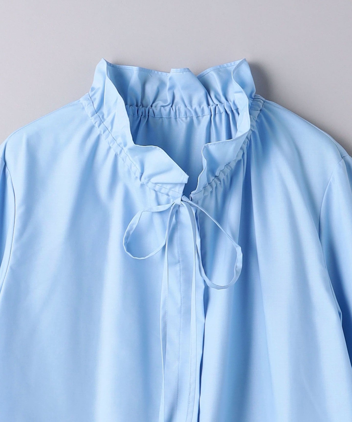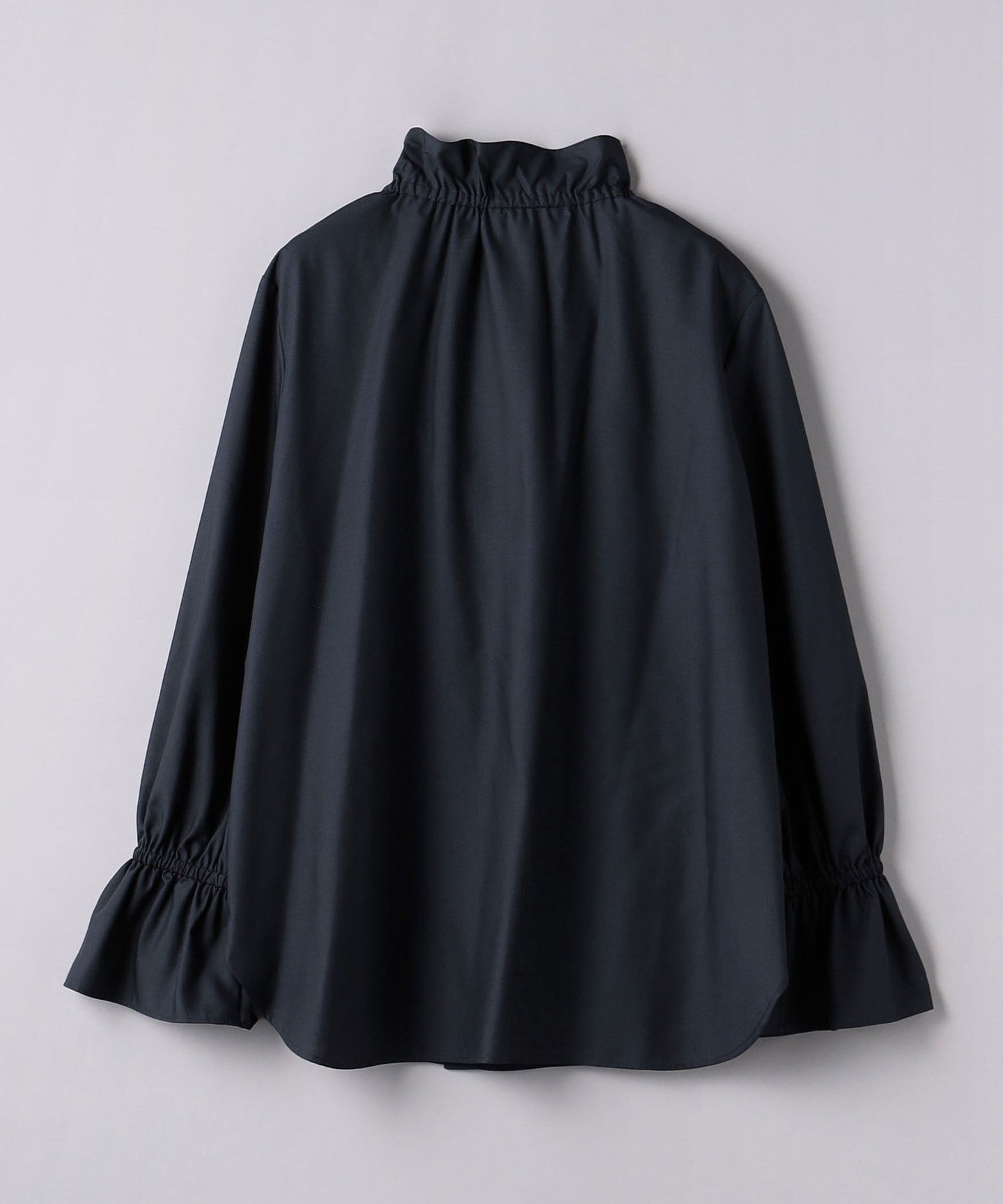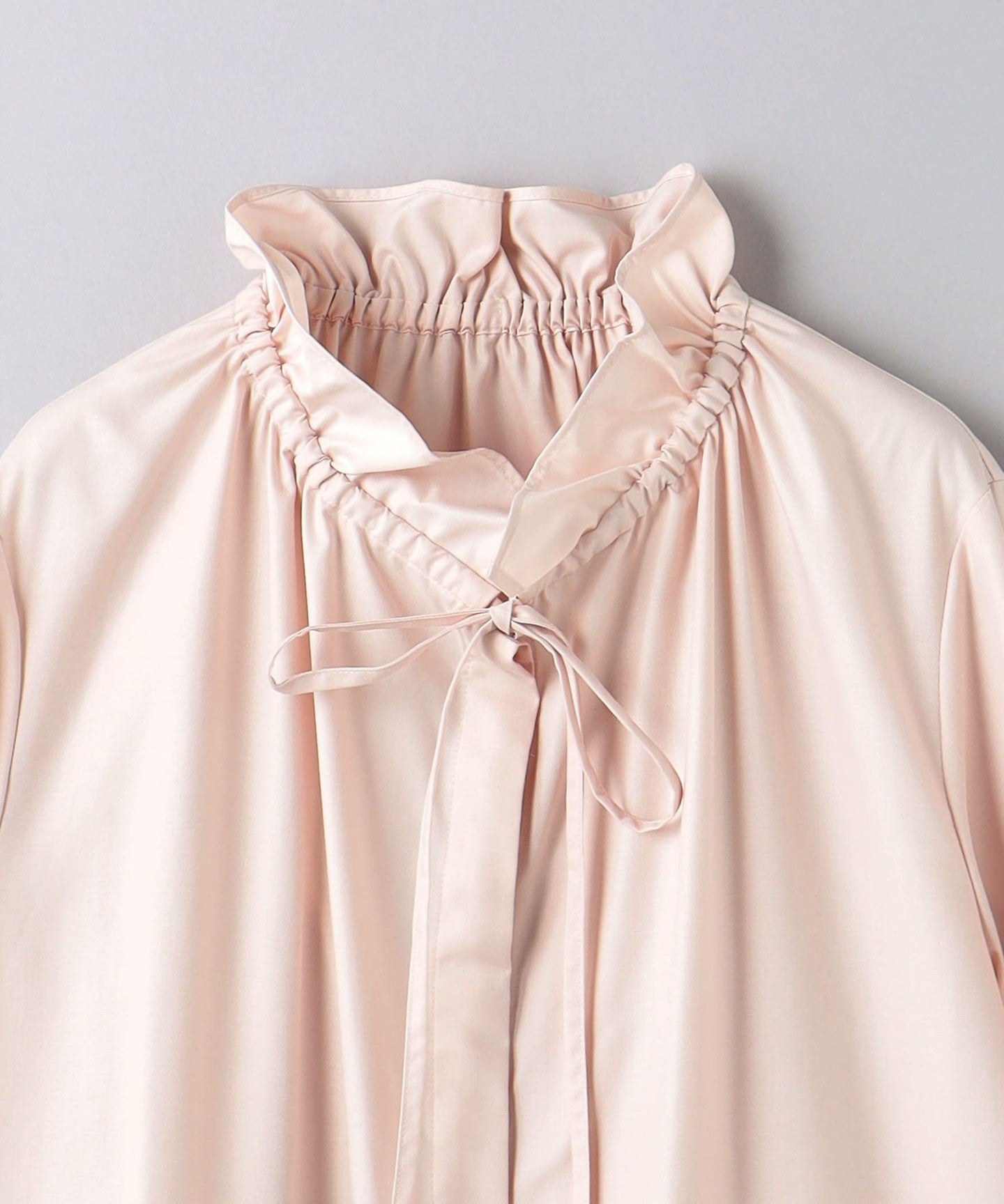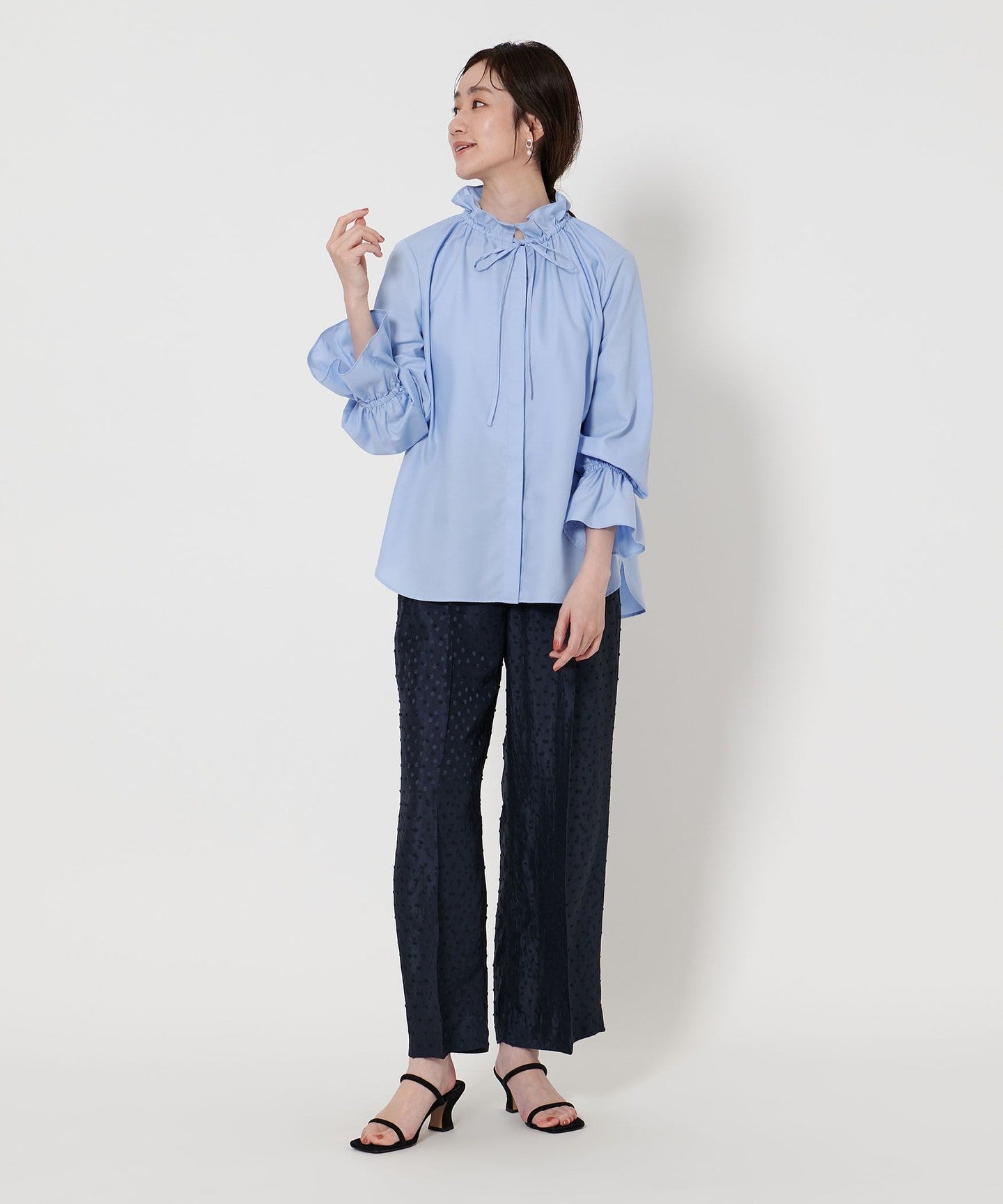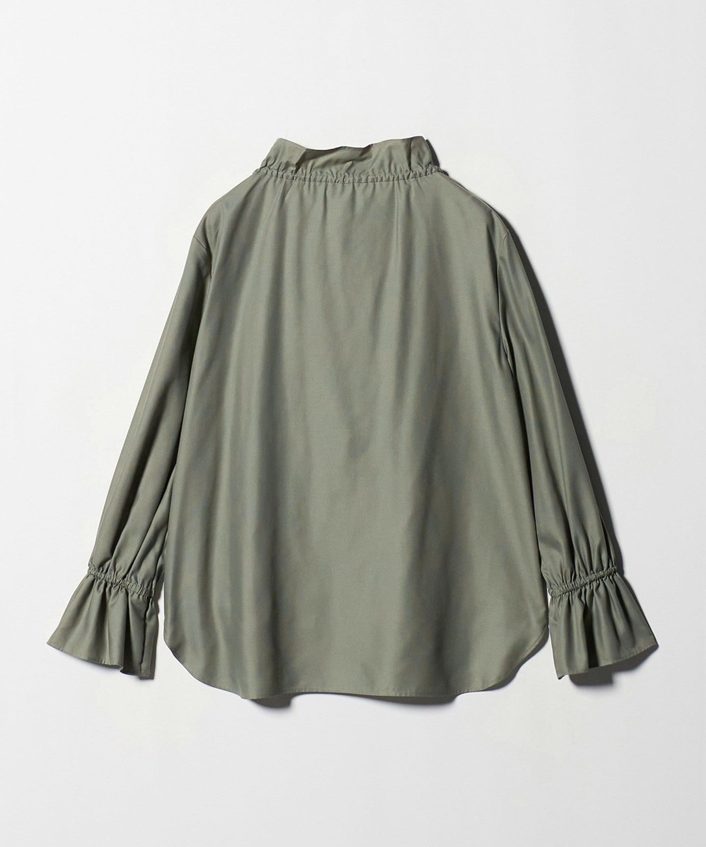 A feminine blouse with a ruffle and drawstring collar and bell sleeve cuffs.