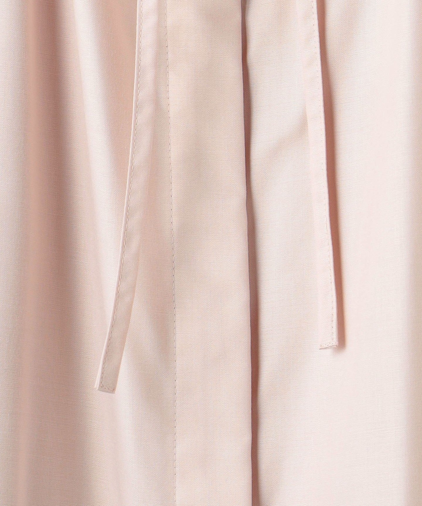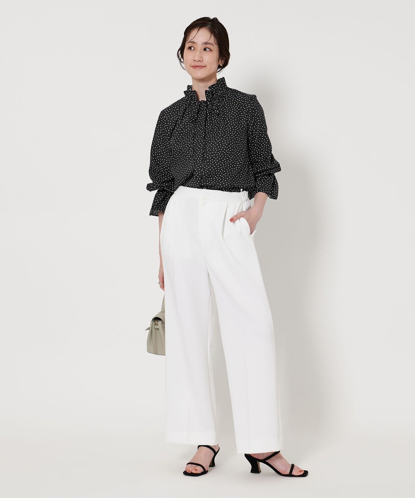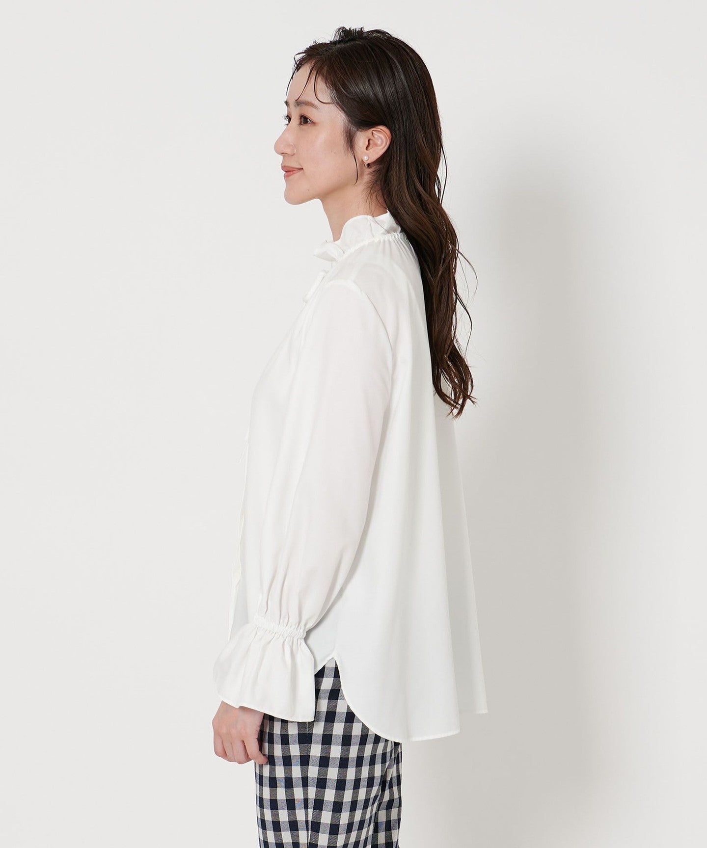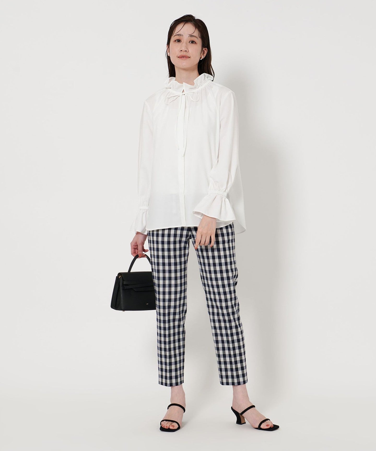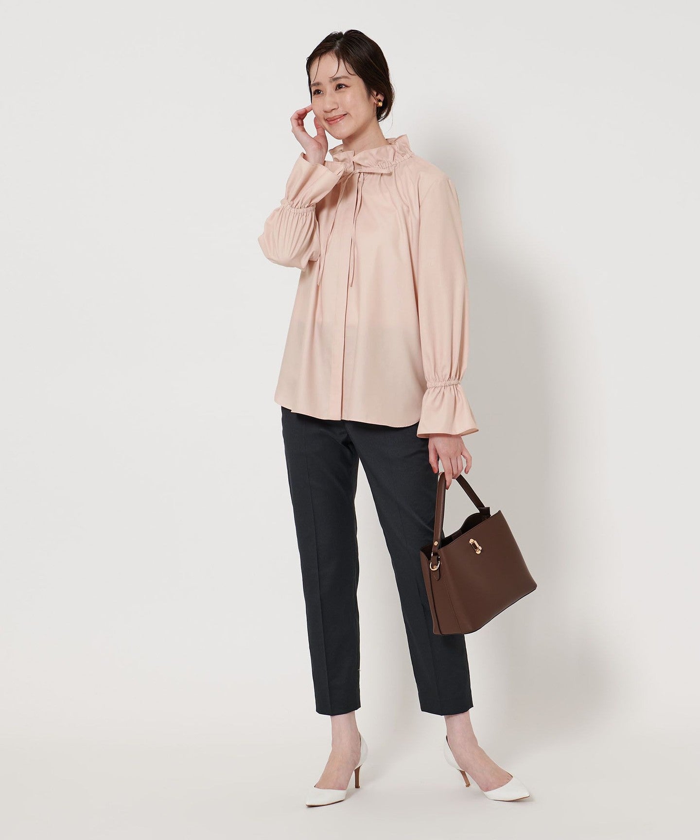 A feminine blouse with a ruffle and drawstring collar and bell sleeve cuffs.