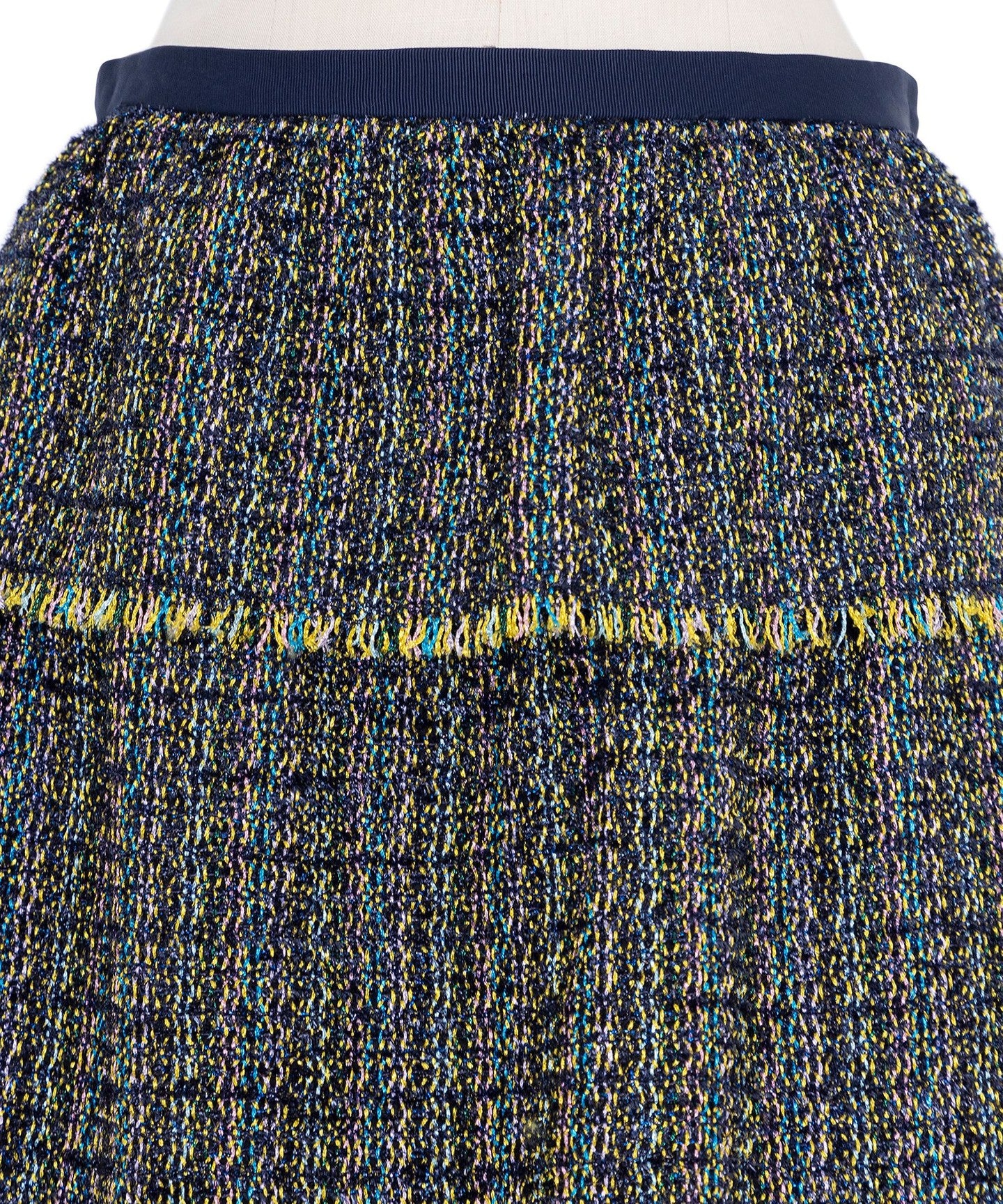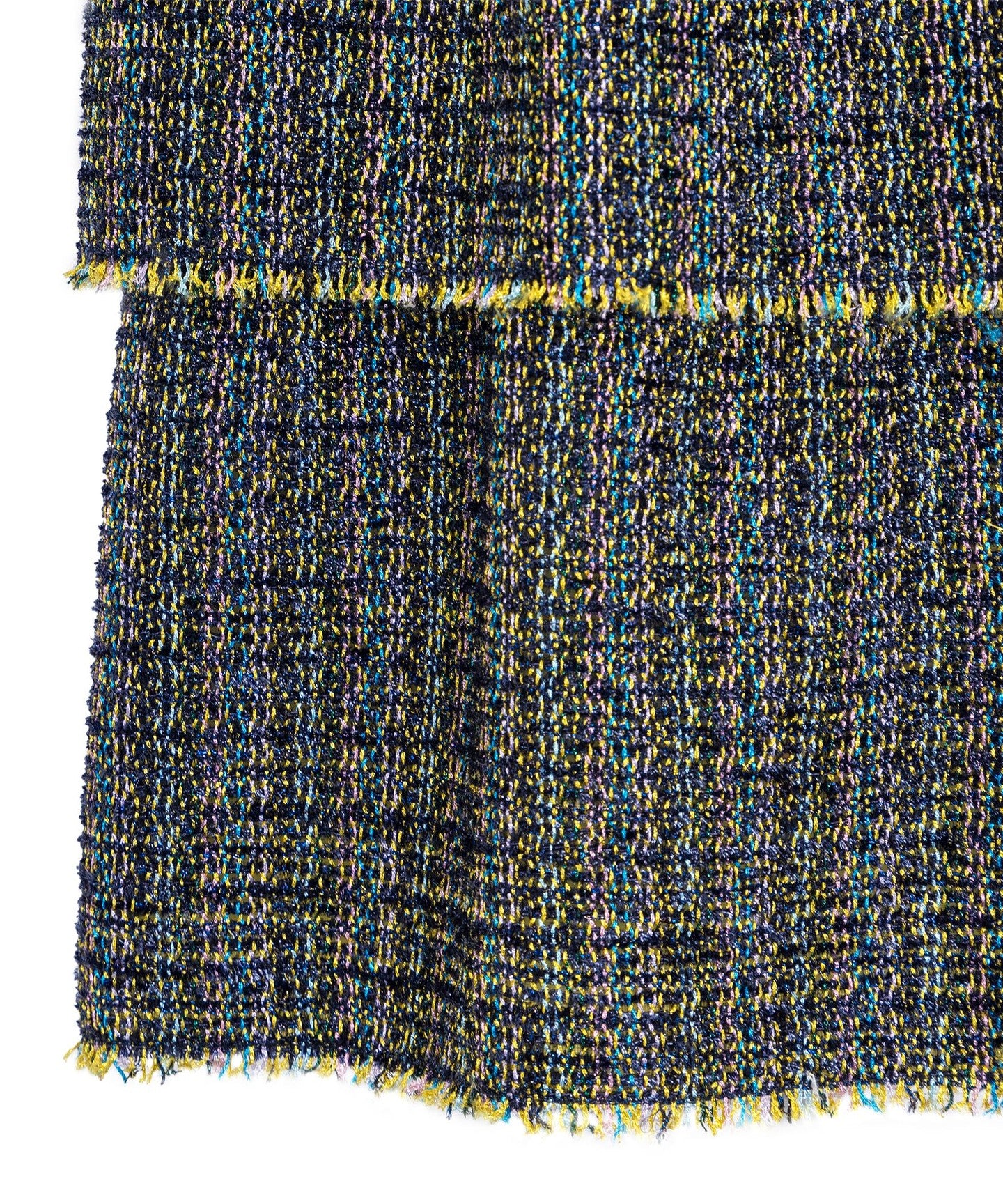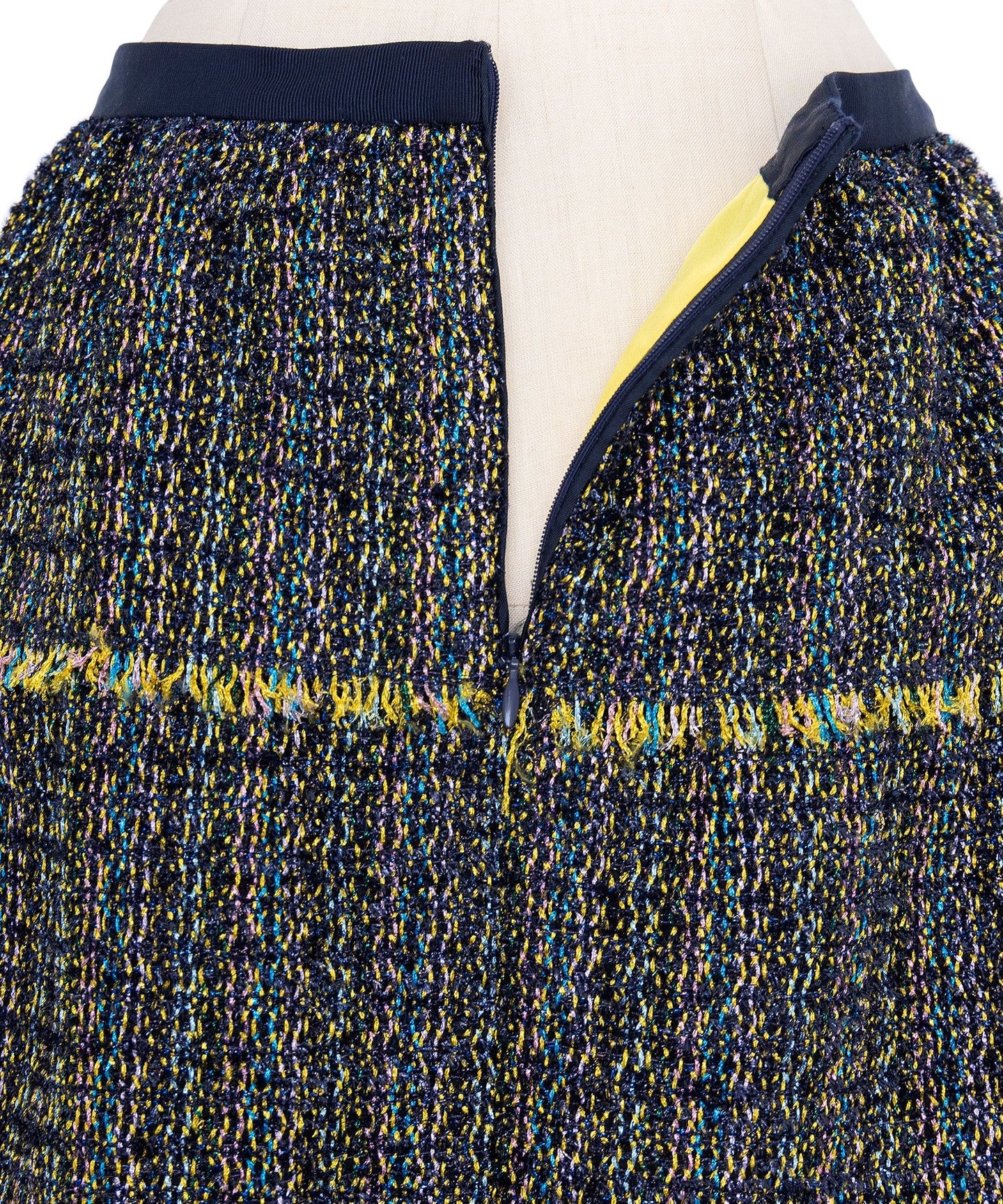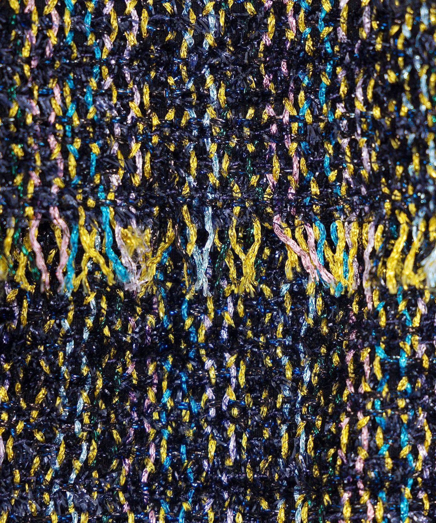 The tweed fabric used is metallic with a navy base and yellow warp threads.