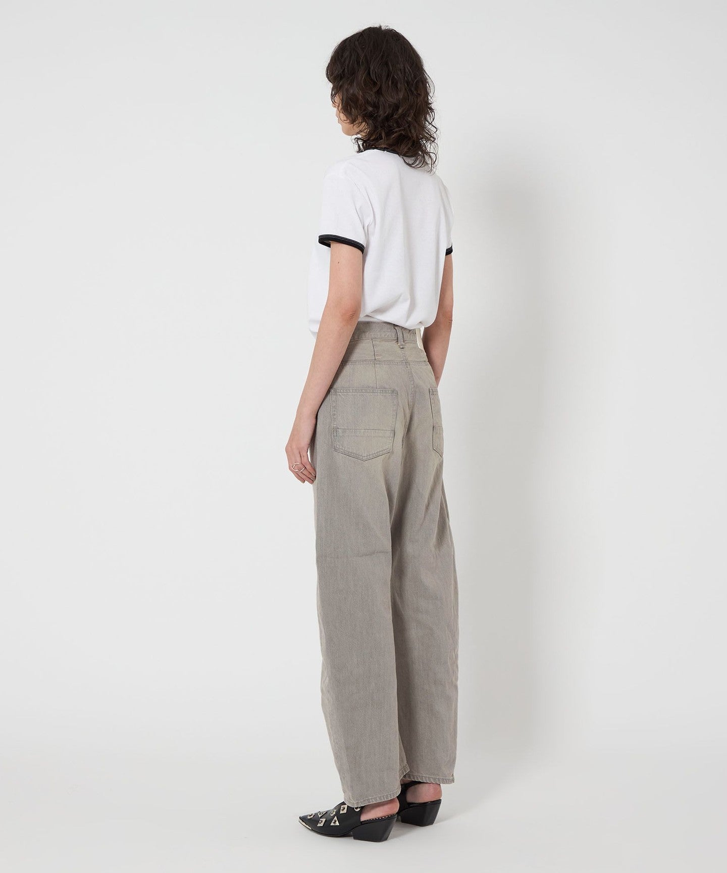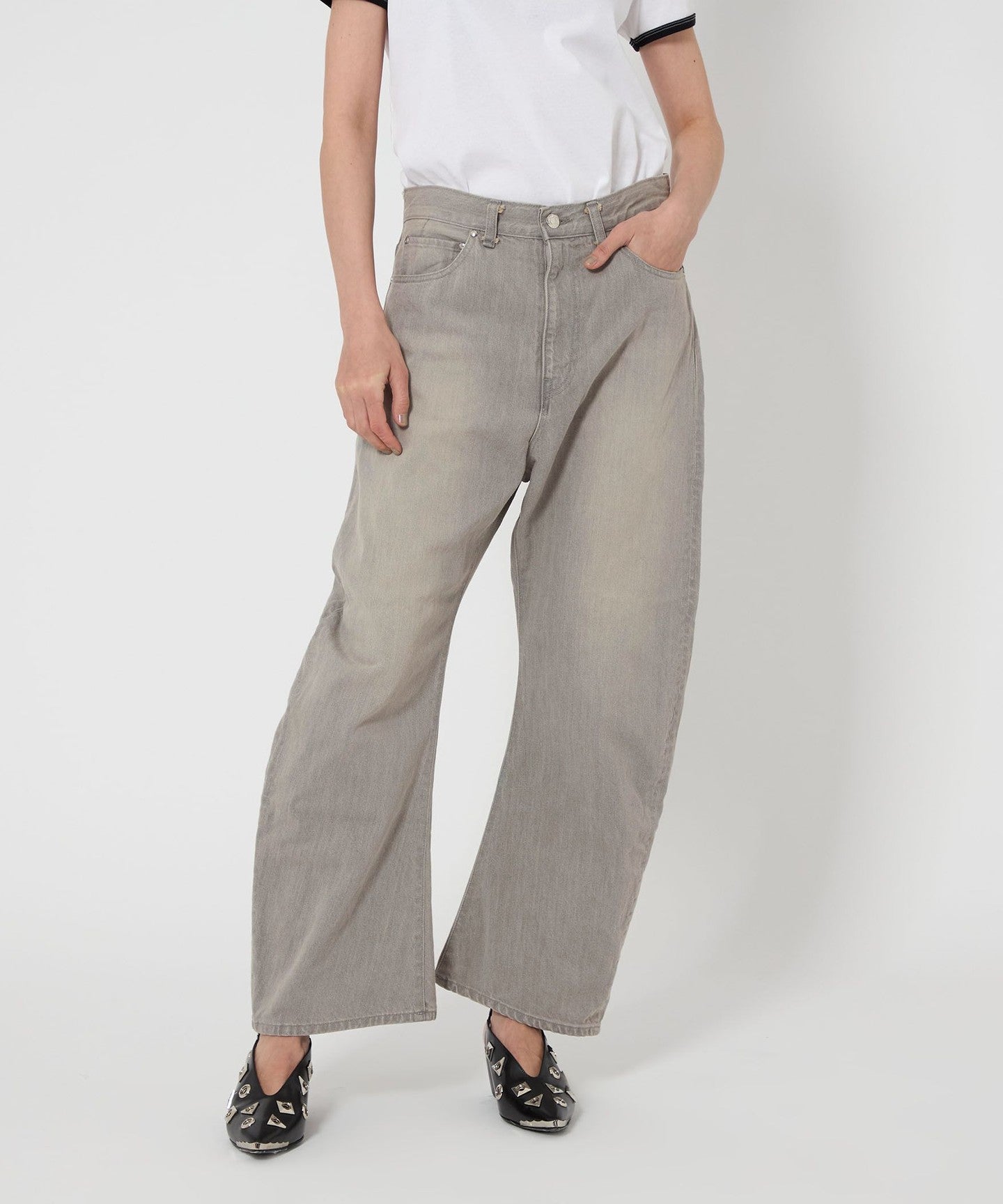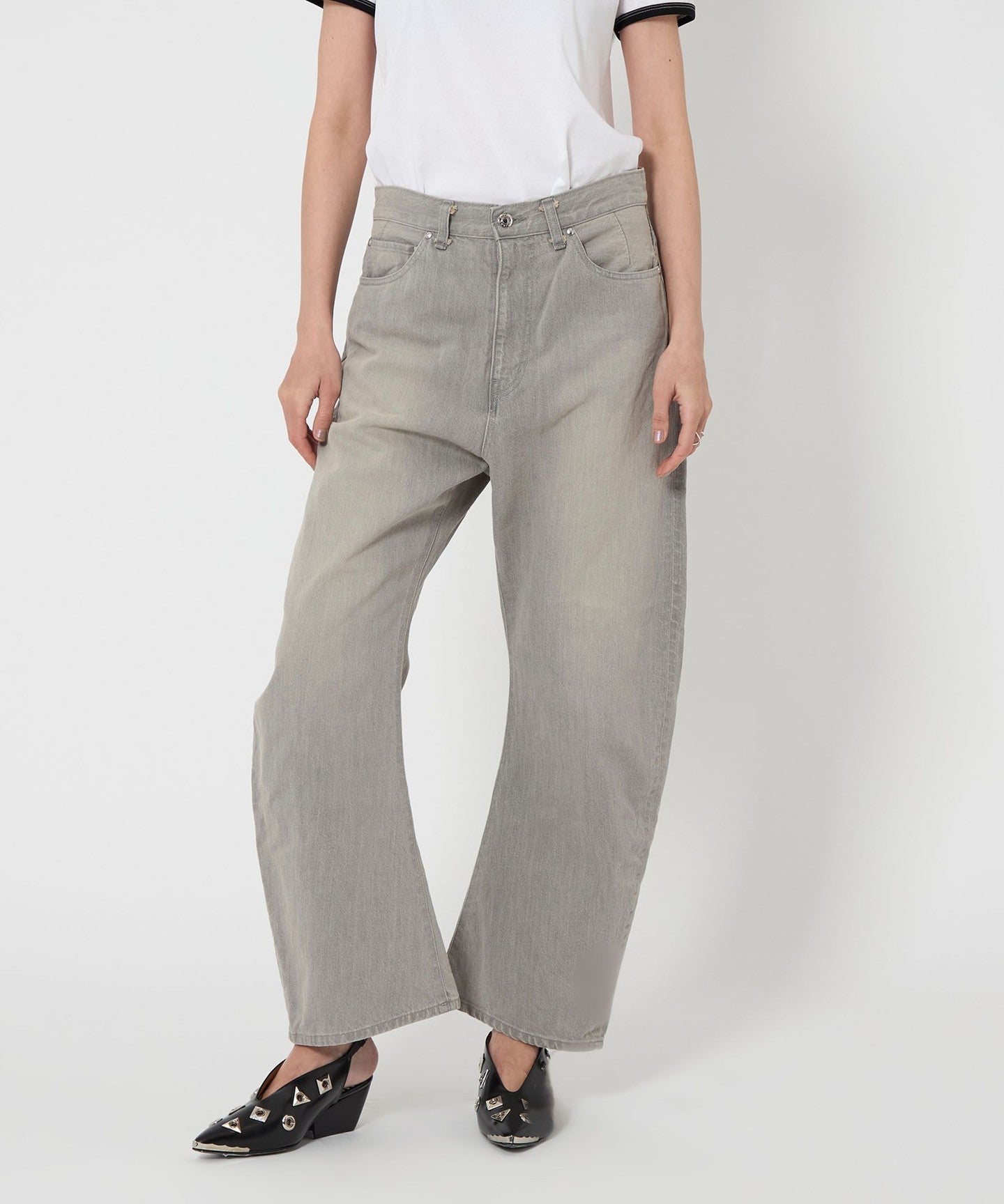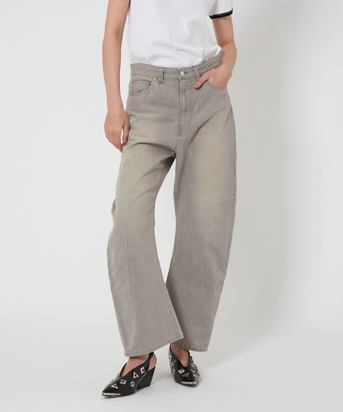 These denim pants have a curved silhouette with just the right amount of volume that gives them a striking look.