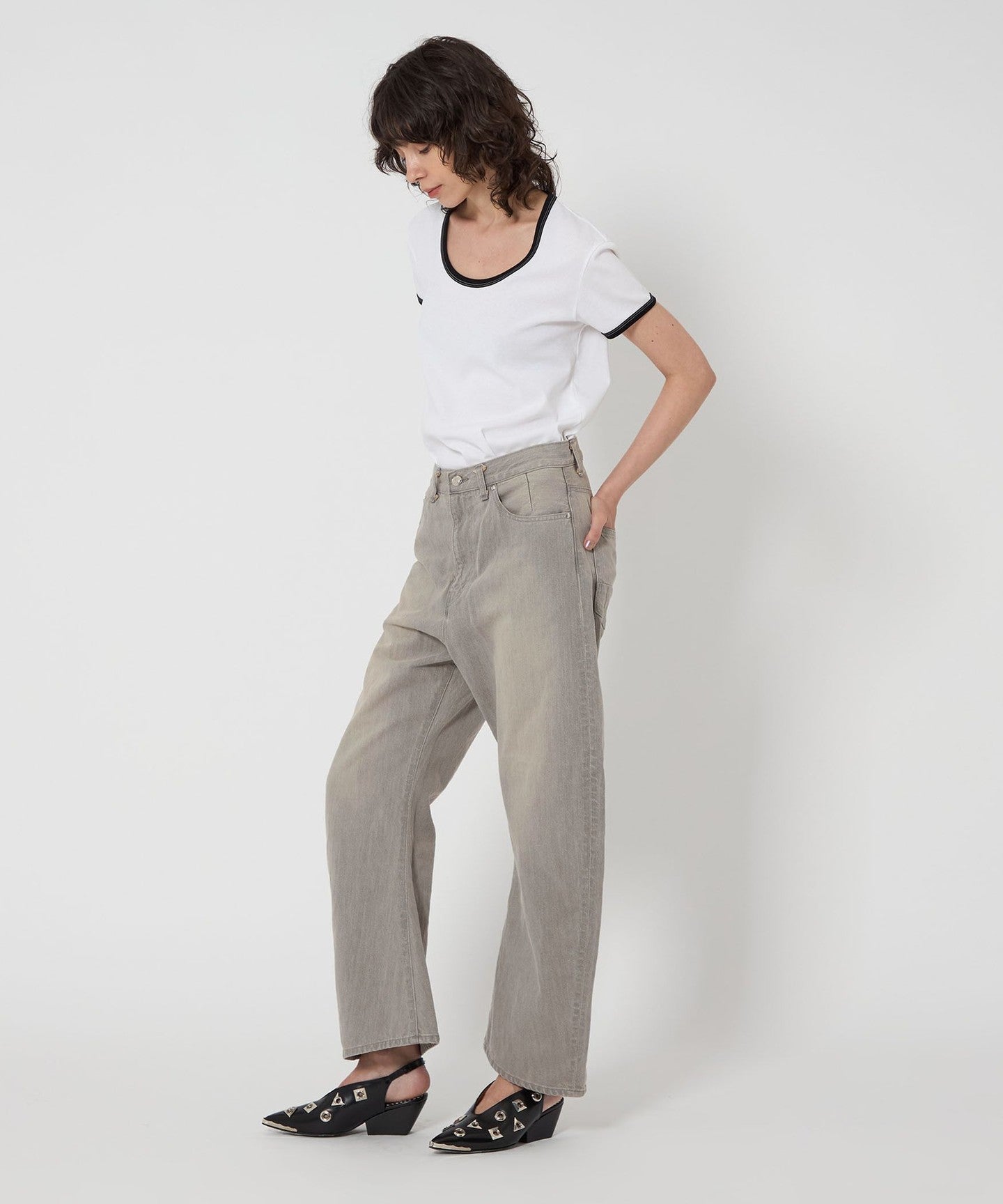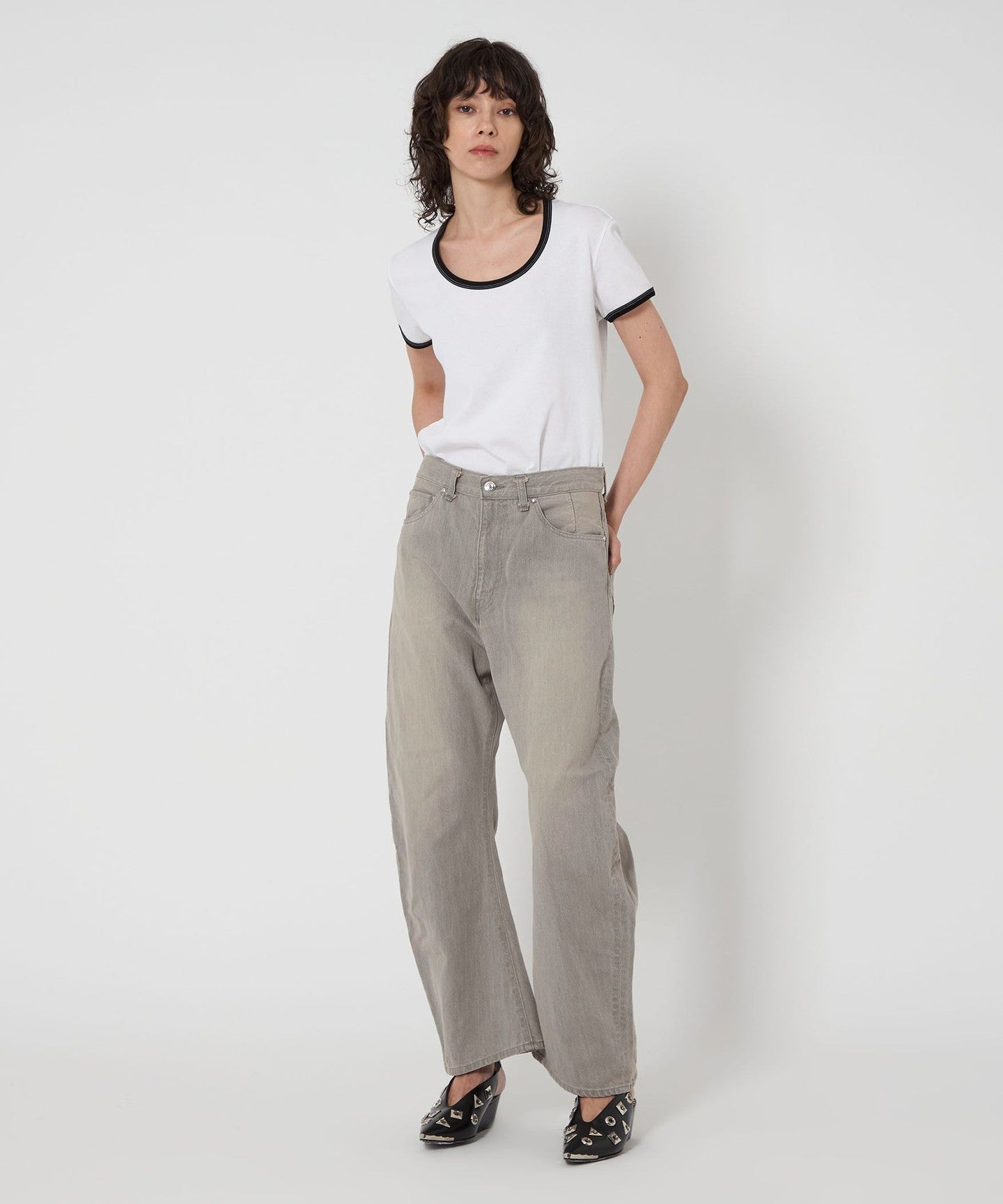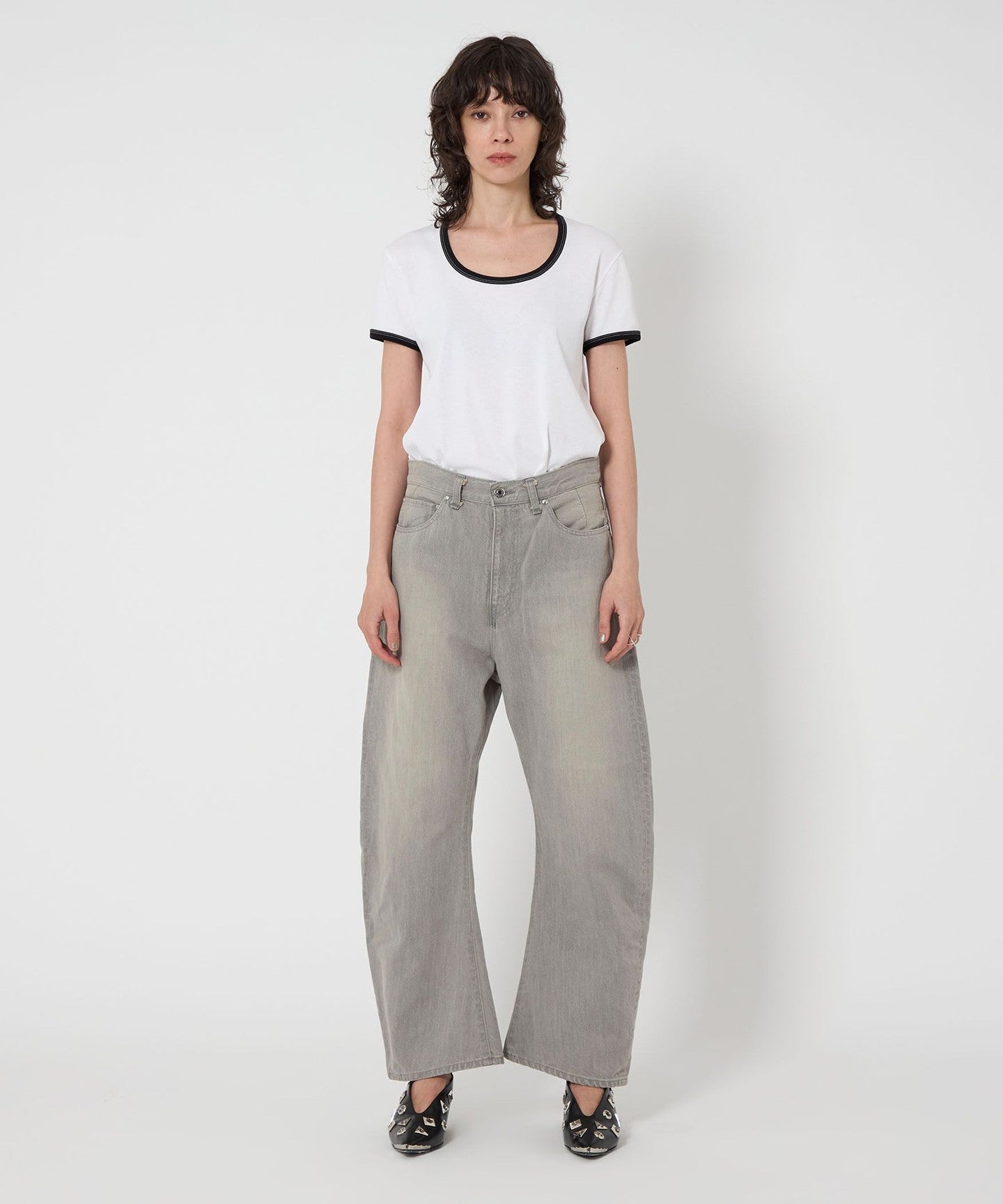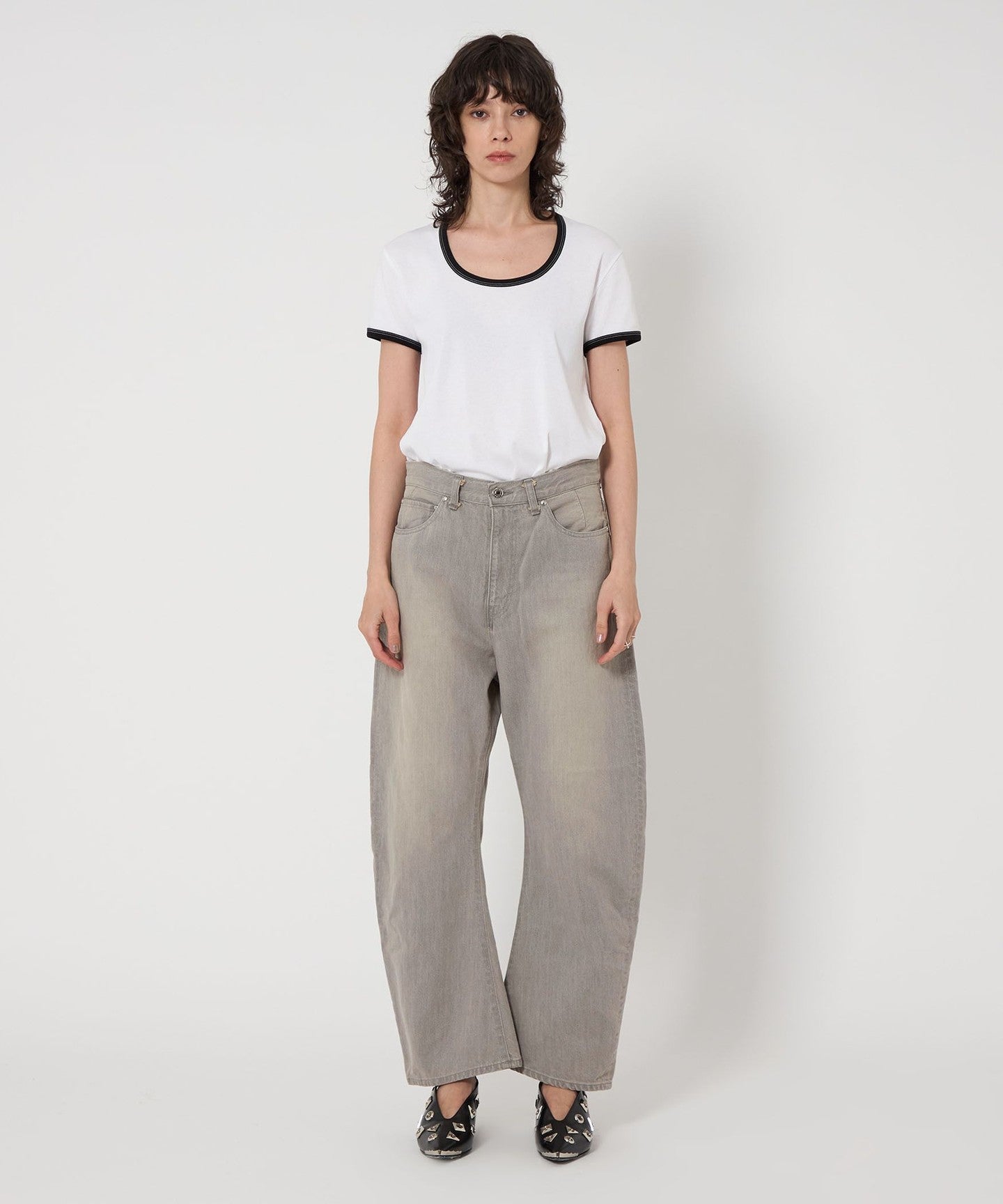 These denim pants have a curved silhouette with just the right amount of volume that gives them a striking look.