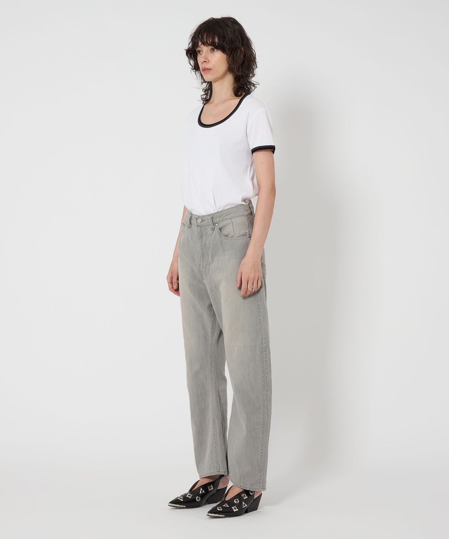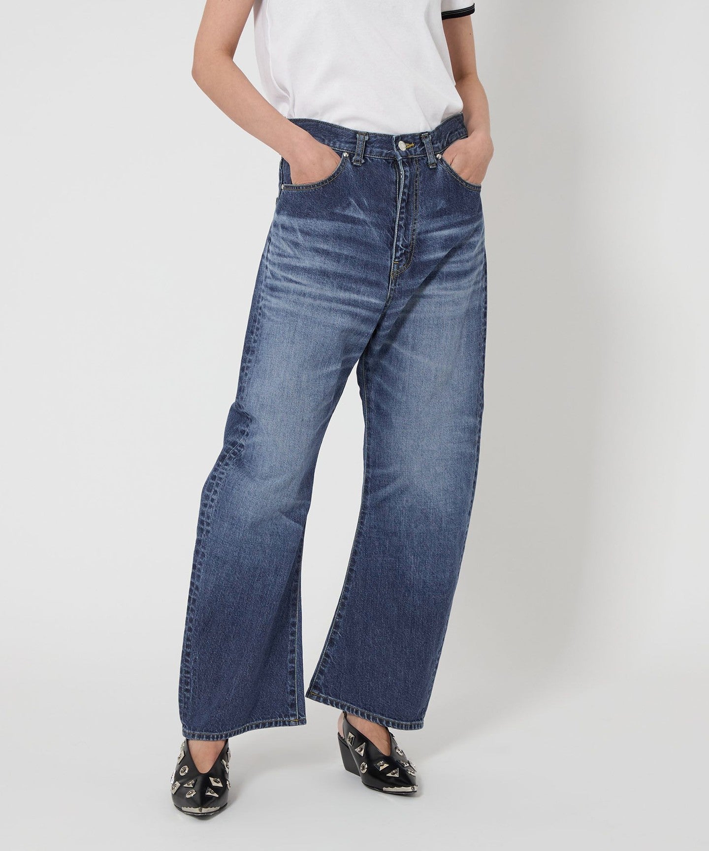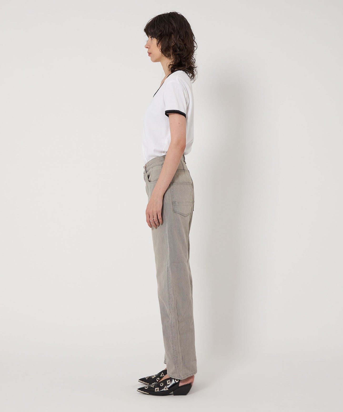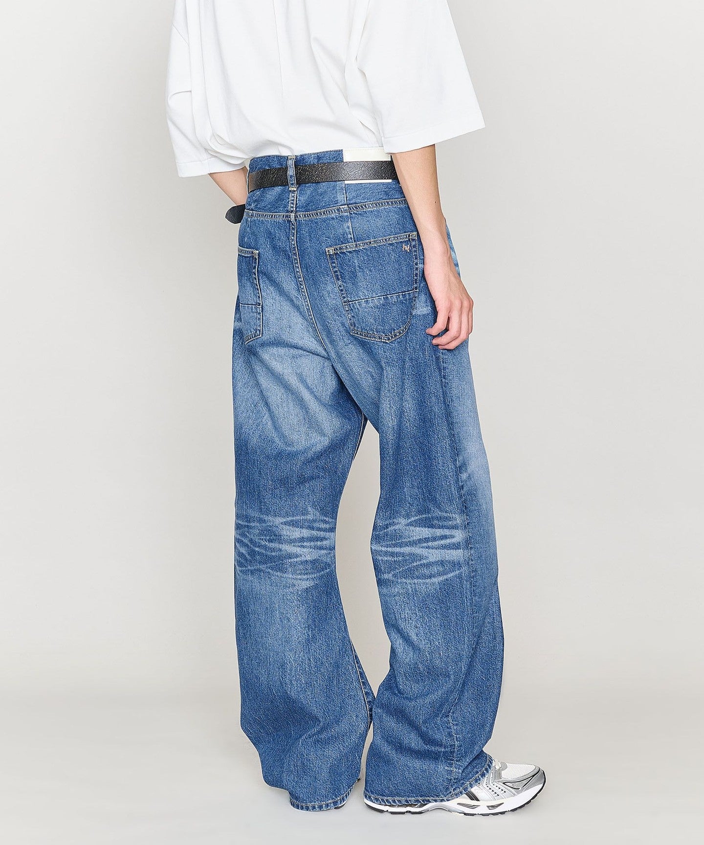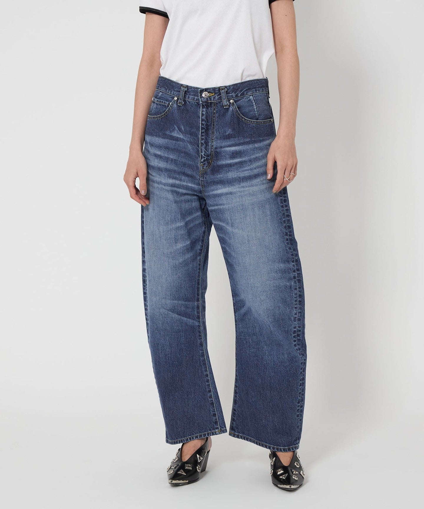 These denim pants have a curved silhouette with just the right amount of volume that gives them a striking look.