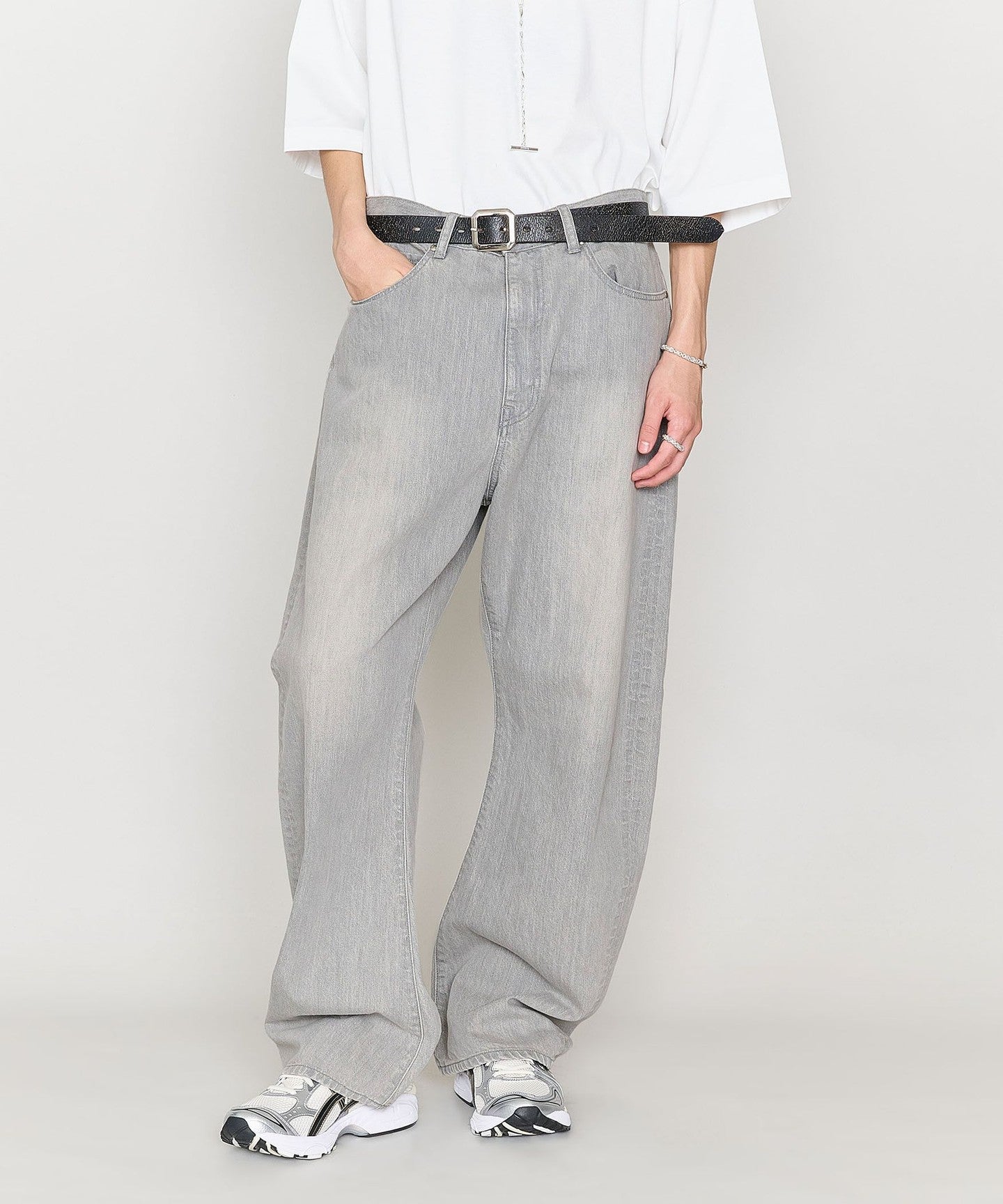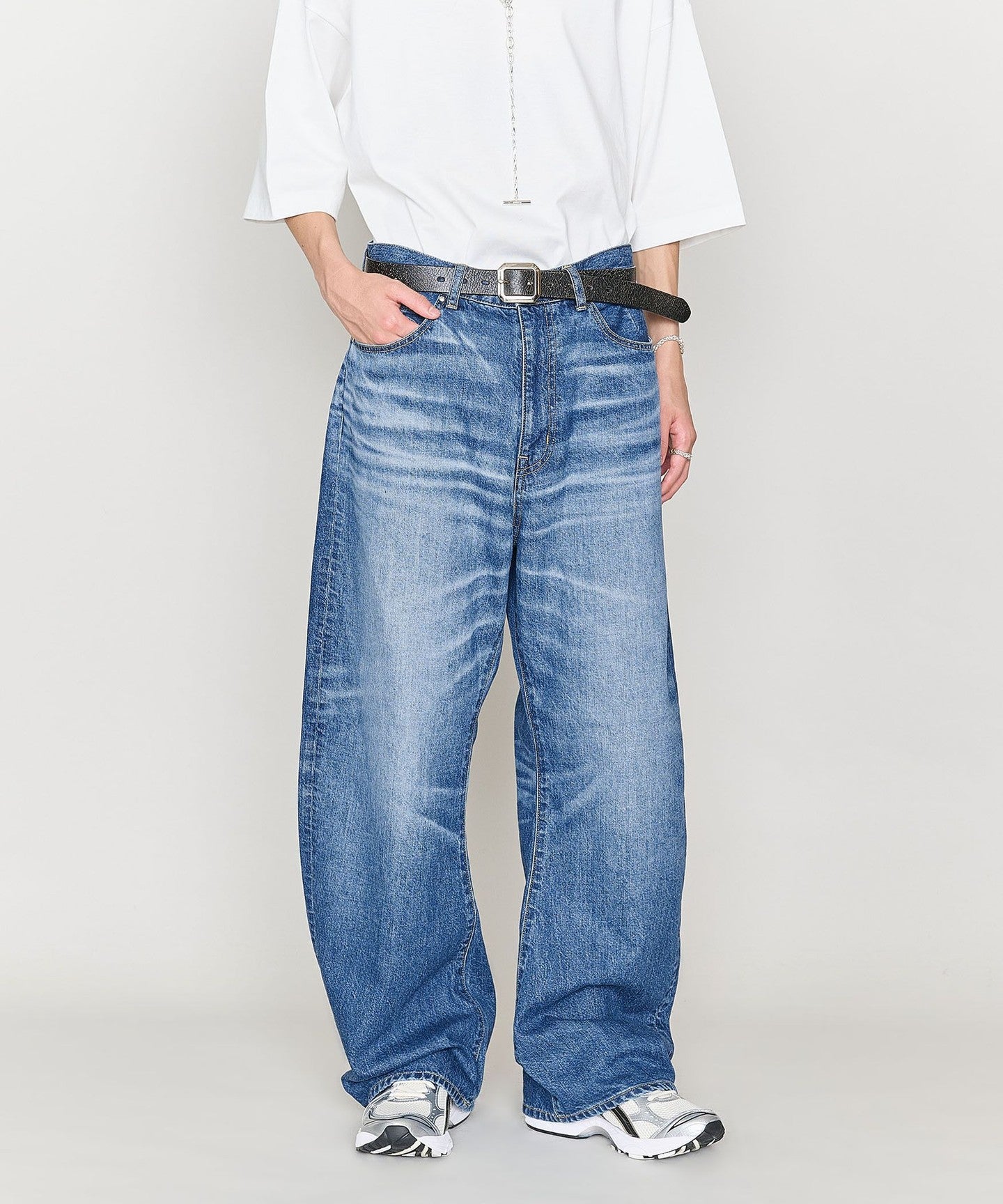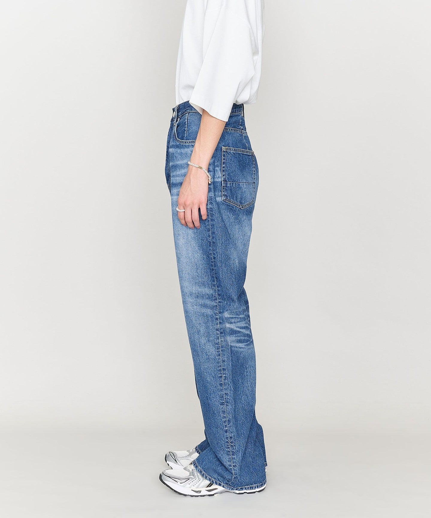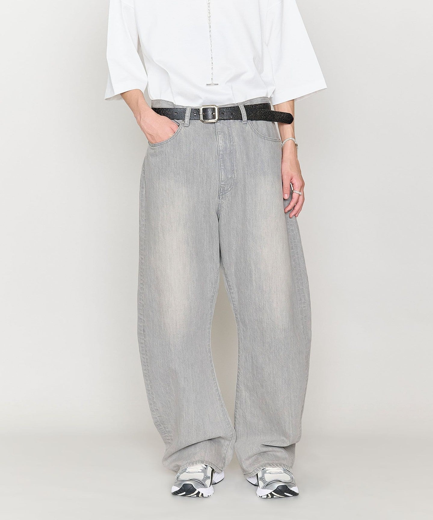 These denim pants have a curved silhouette with just the right amount of volume that gives them a striking look.
