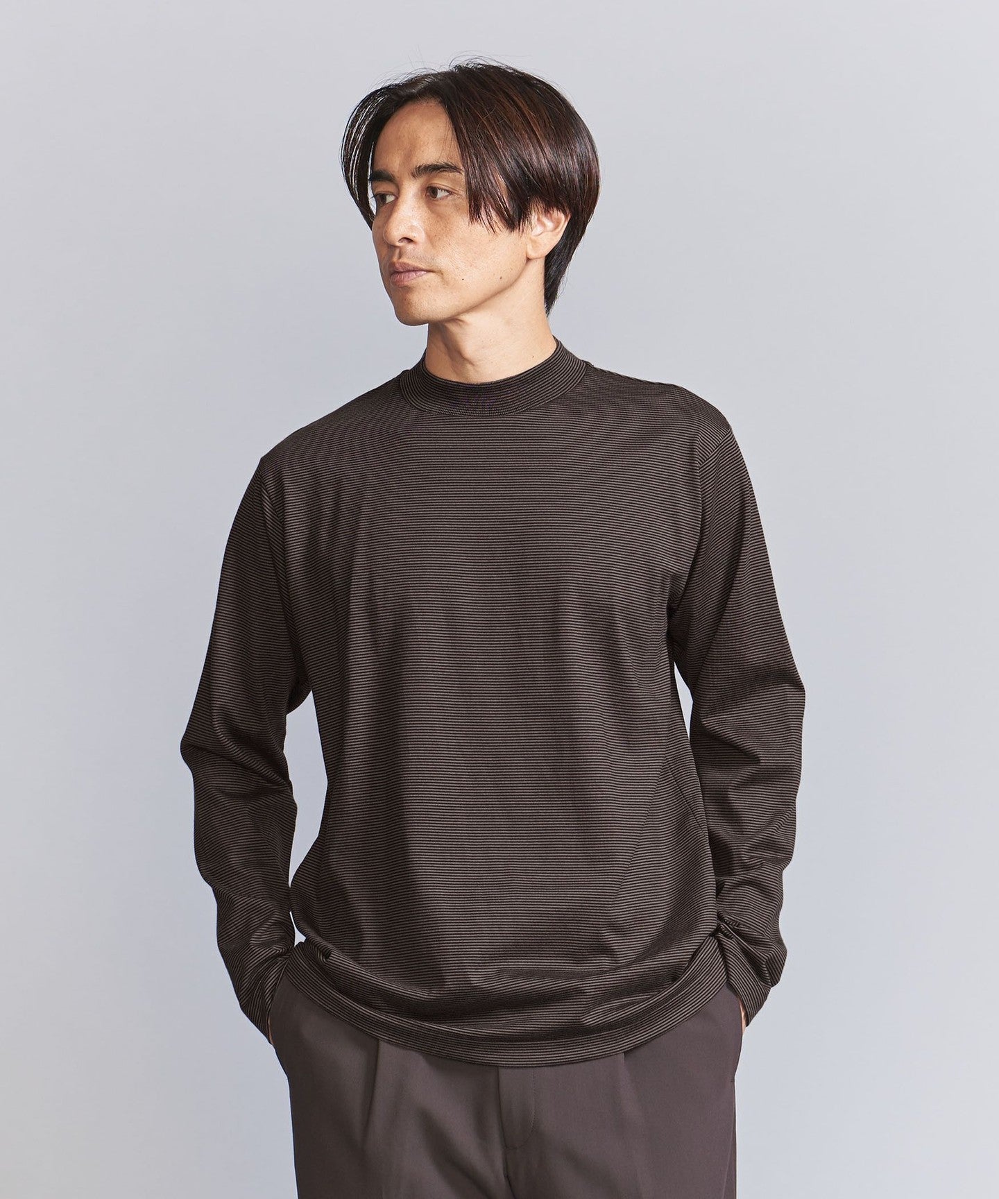 This mock neck cut-and-sew features a fine striped pattern that is easy to wear and feels like a solid color.