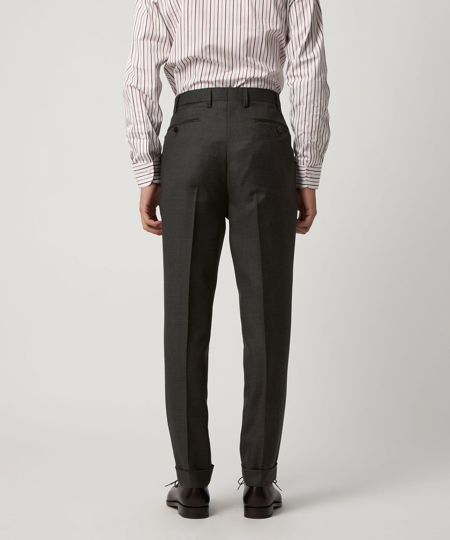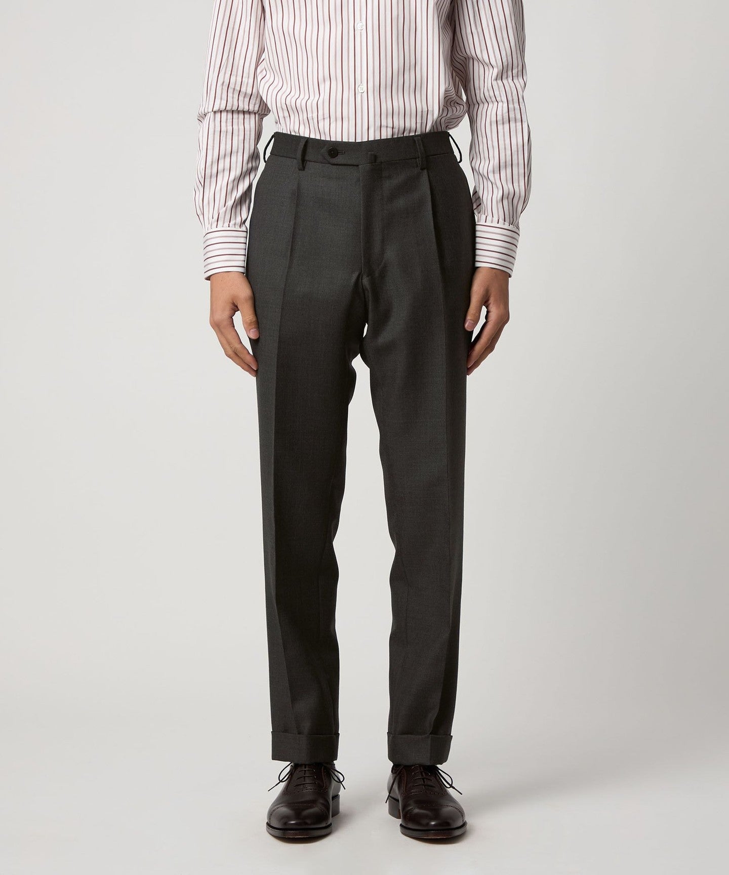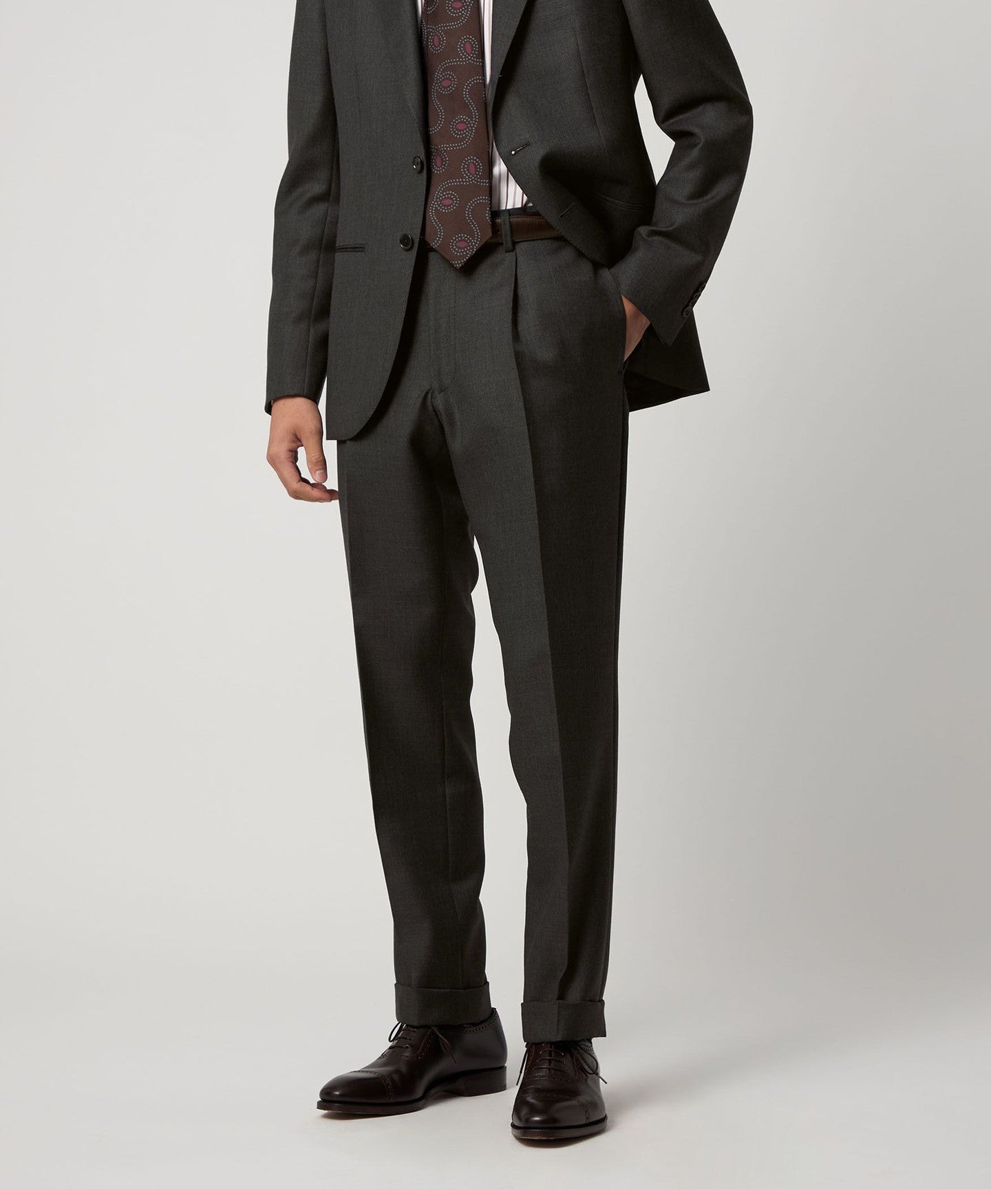 The slacks have deep pleats and ample room around the waist, creating a tapered silhouette that balances well with the tailored jacket.