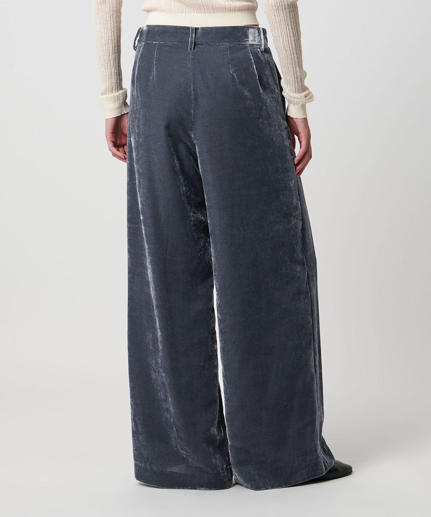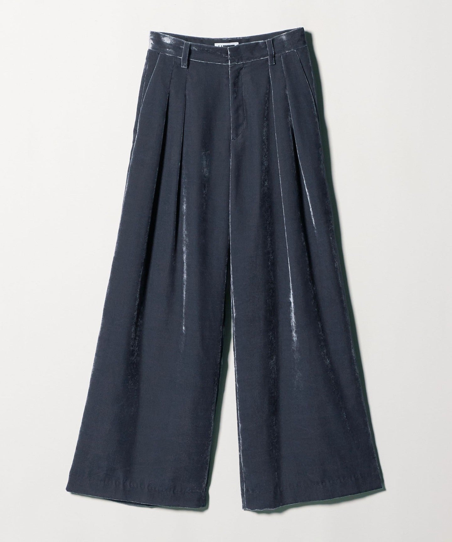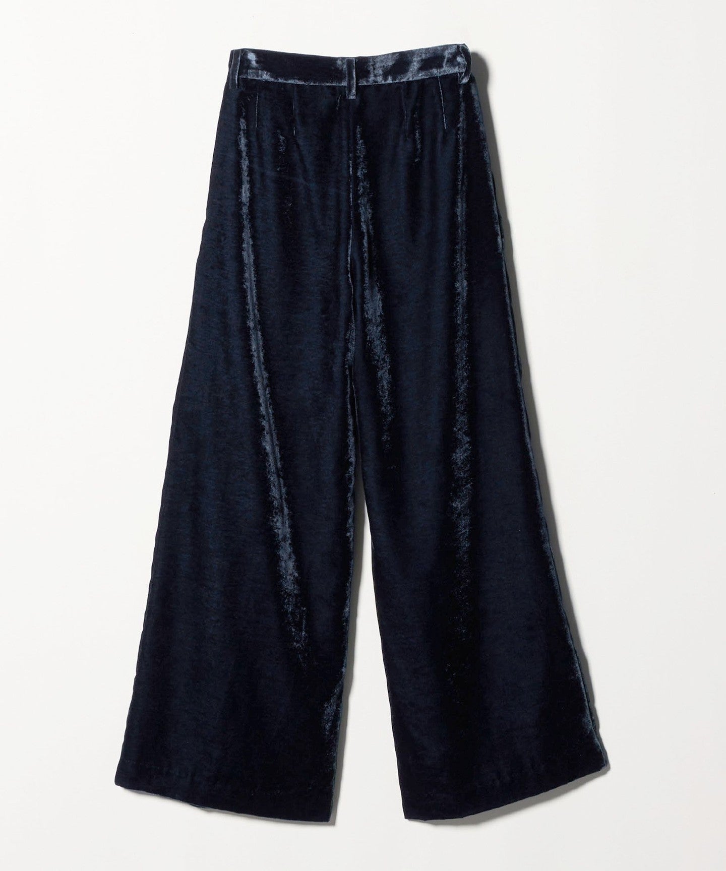 These wide-leg velvet pants create a relaxed yet sophisticated look. The elegant sheen and randomly piled texture, along with the generous volume of the two pleats, add to their glamorous look. The slightly larger waist creates a natural silhouette, allowing you to wear them lower down. Their striking appearance, exuding a warmth perfect for autumn and winter, creates a stylish look even when paired with a simple T-shirt. We also recommend pairing them with a shirt from the same series (item no. 16112000003).