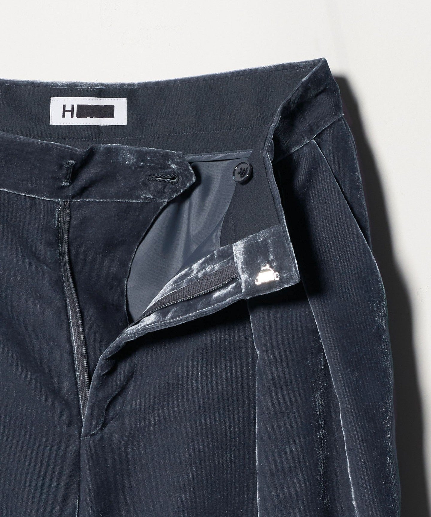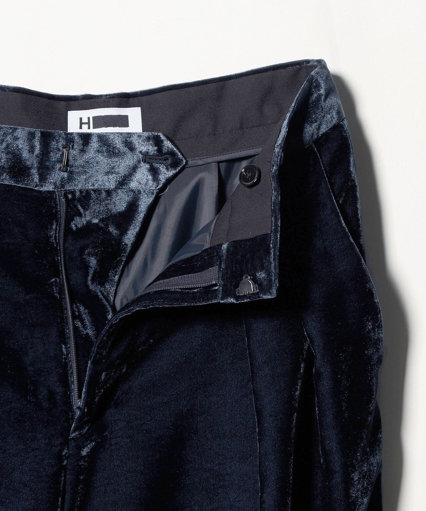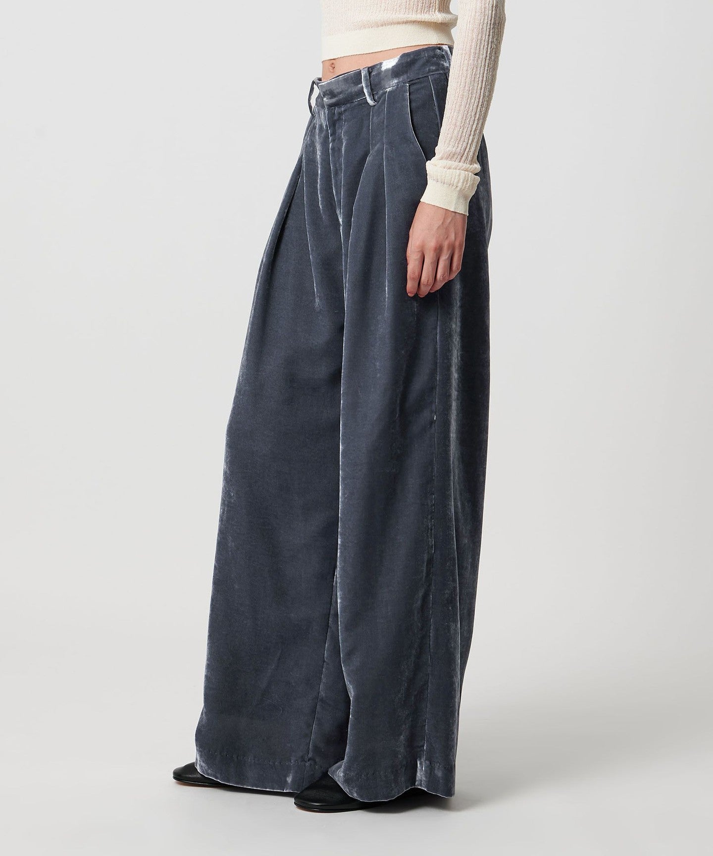 These wide-leg velvet pants create a relaxed yet sophisticated look. The elegant sheen and randomly piled texture, along with the generous volume of the two pleats, add to their glamorous look. The slightly larger waist creates a natural silhouette, allowing you to wear them lower down. Their striking appearance, exuding a warmth perfect for autumn and winter, creates a stylish look even when paired with a simple T-shirt. We also recommend pairing them with a shirt from the same series (item no. 16112000003).