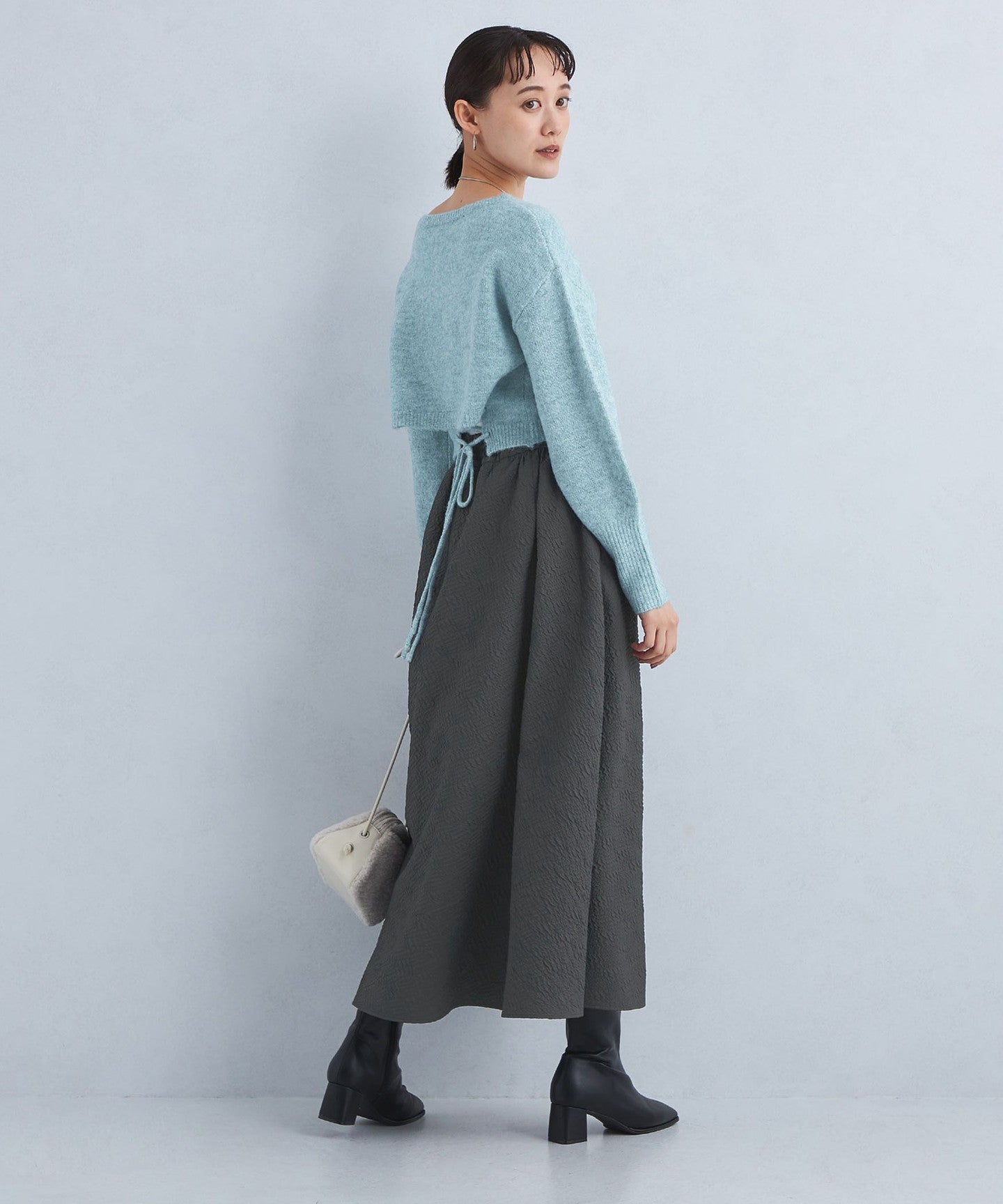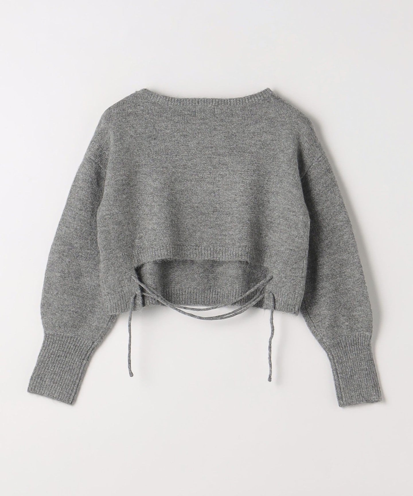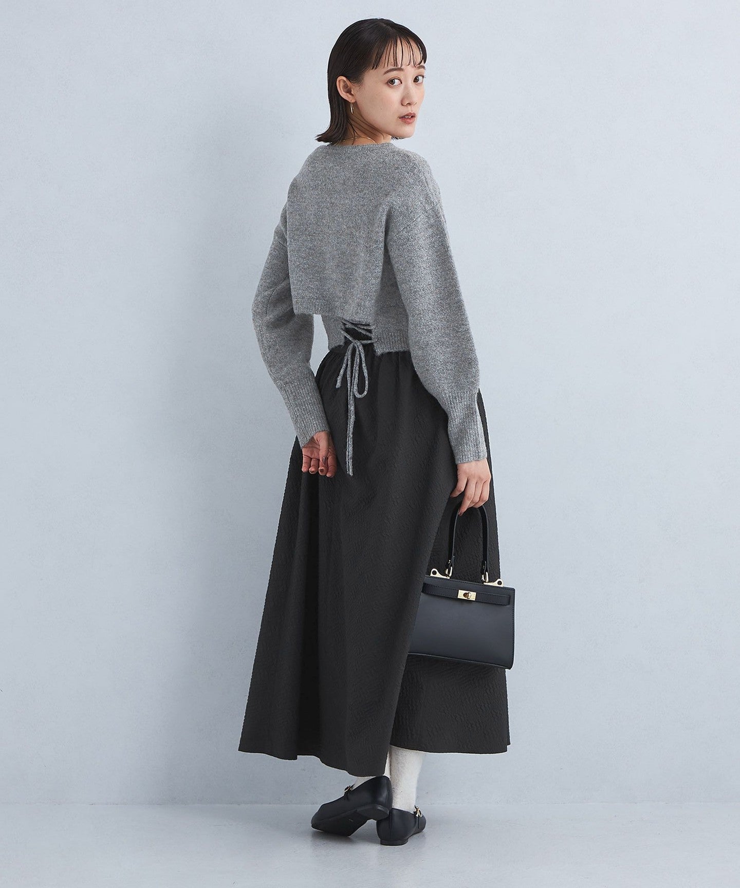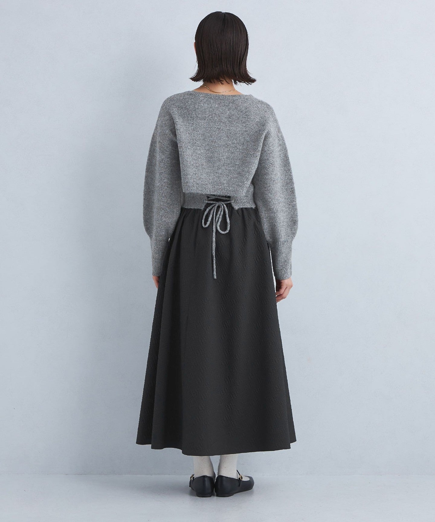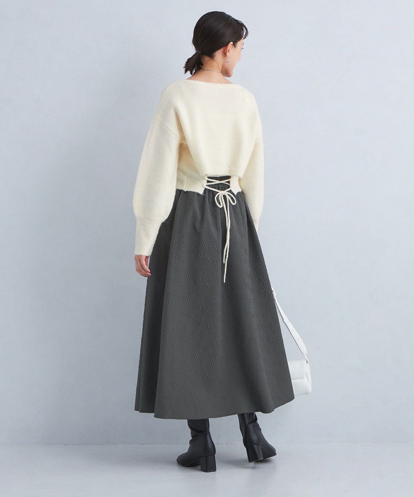 The back lace-up knit has been designed with special attention to its length and lace-up details so that it can be worn stylishly even when paired with a voluminous skirt.