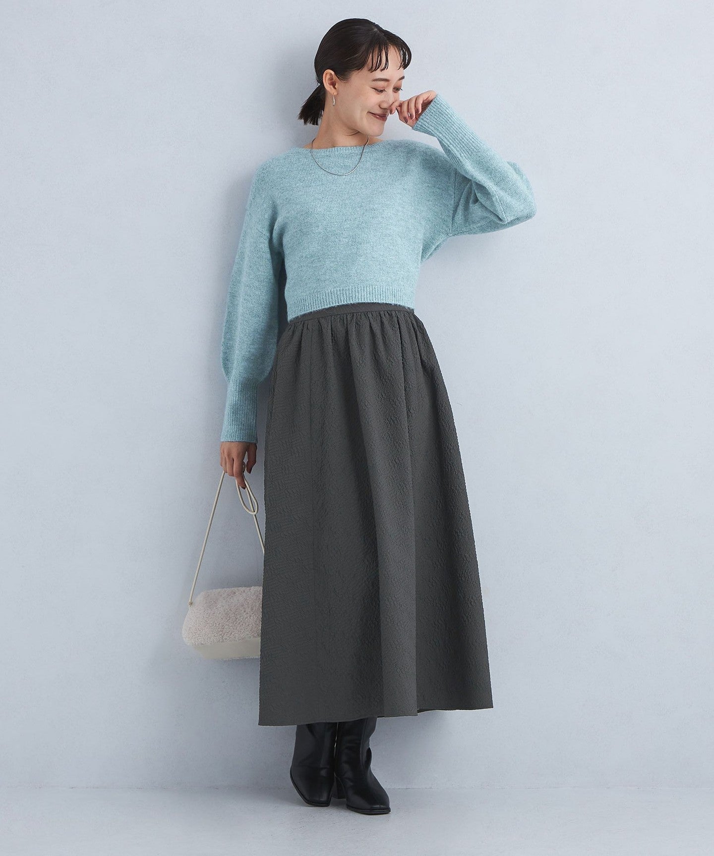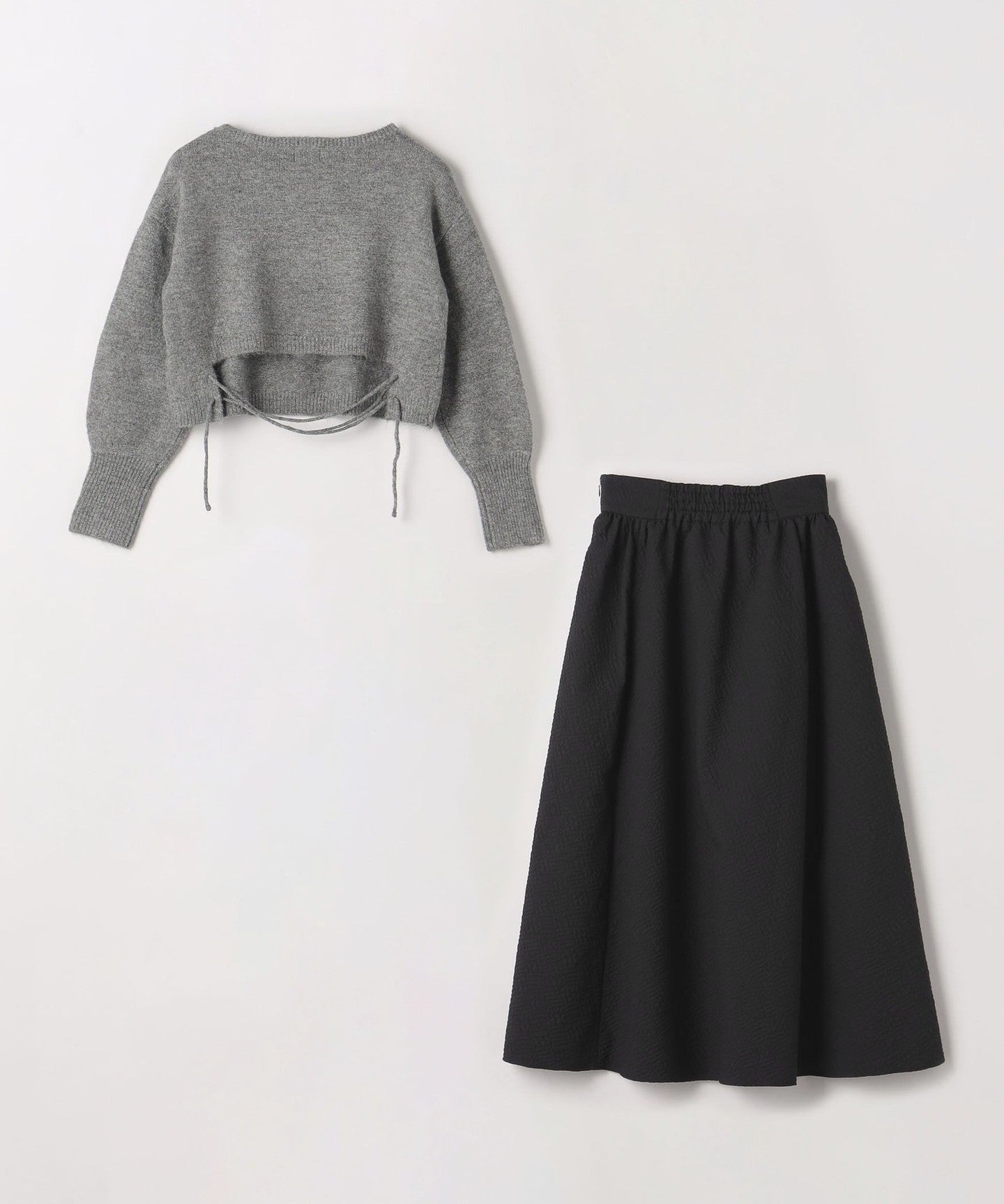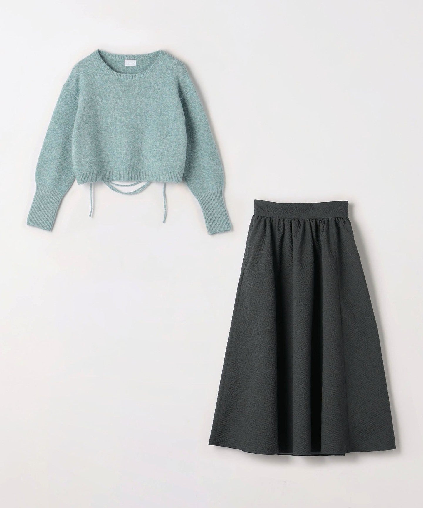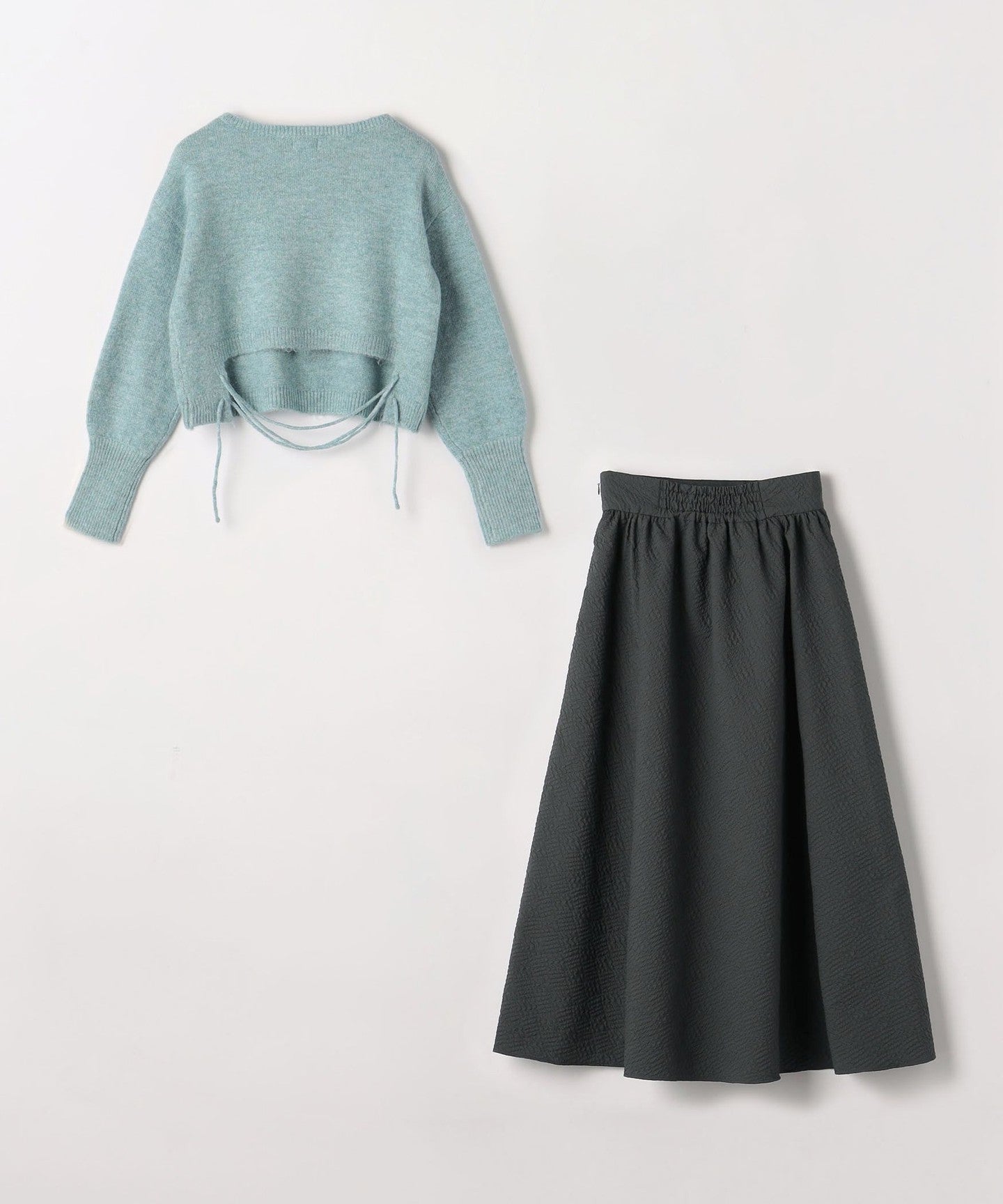 A knit set featuring lace-up detailing at the back, paired with a skirt made of gorgeous puffed jacquard fabric.
