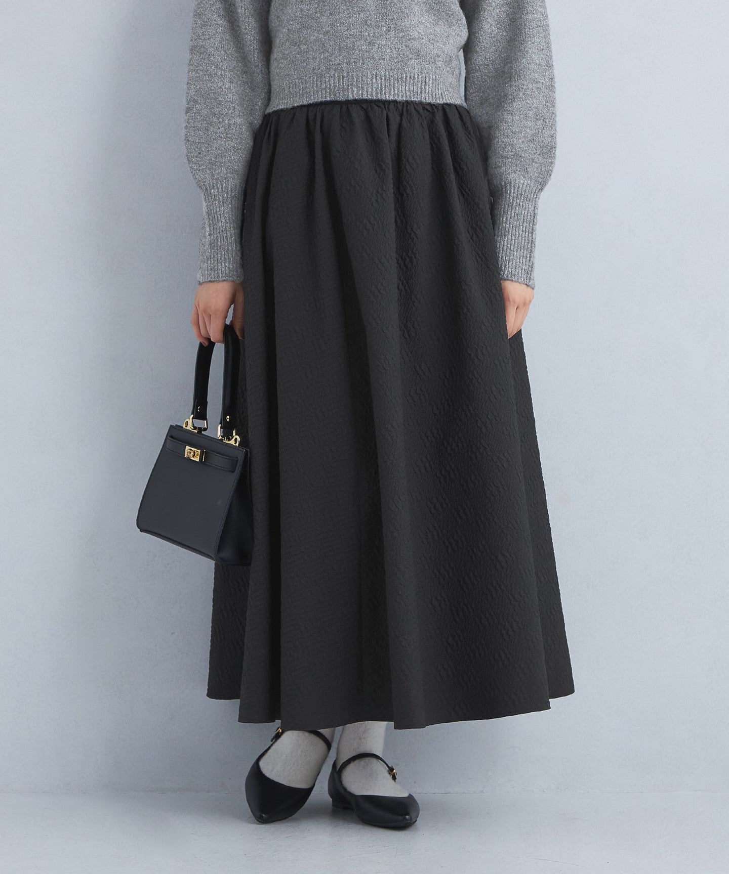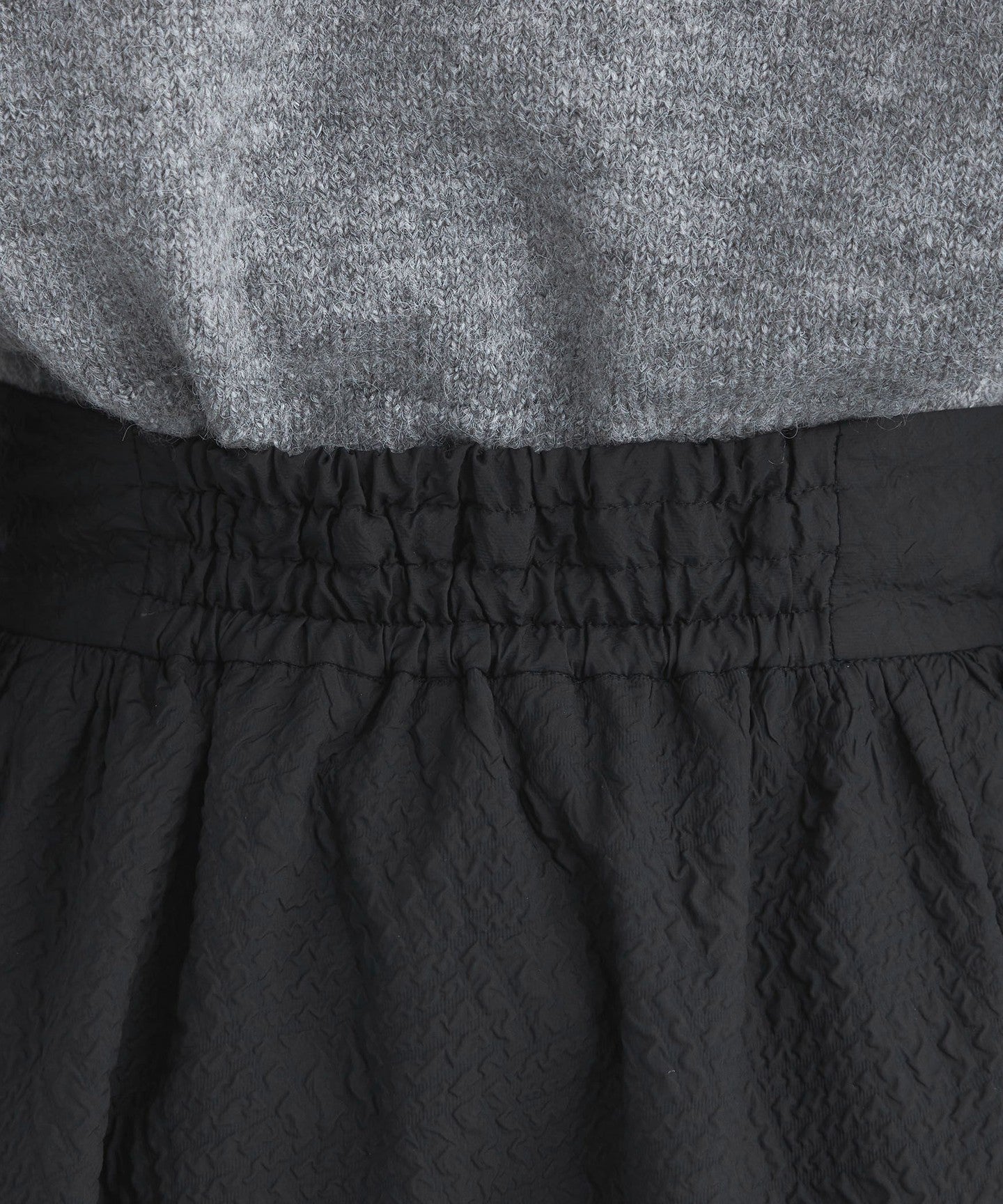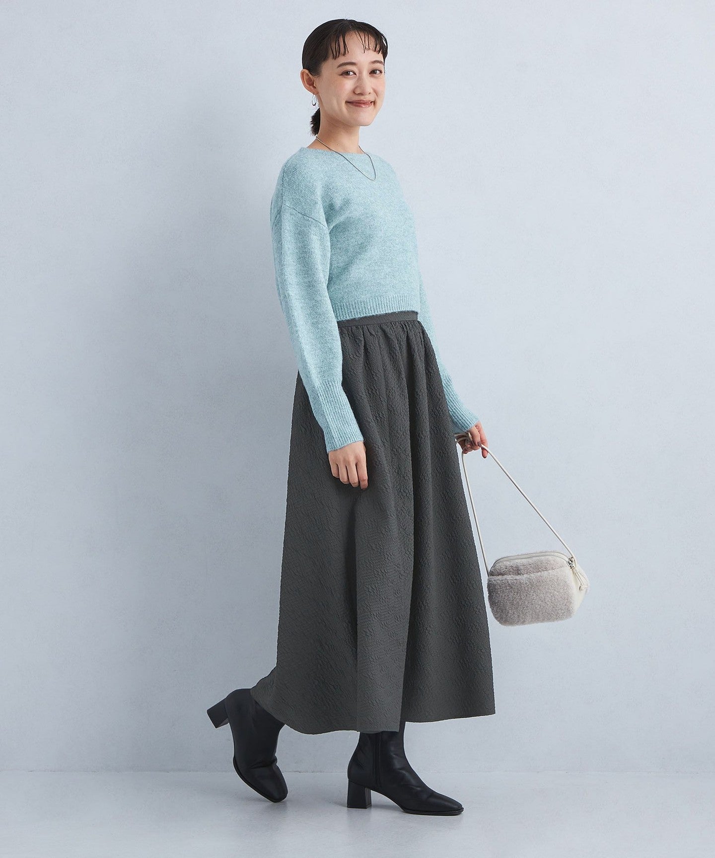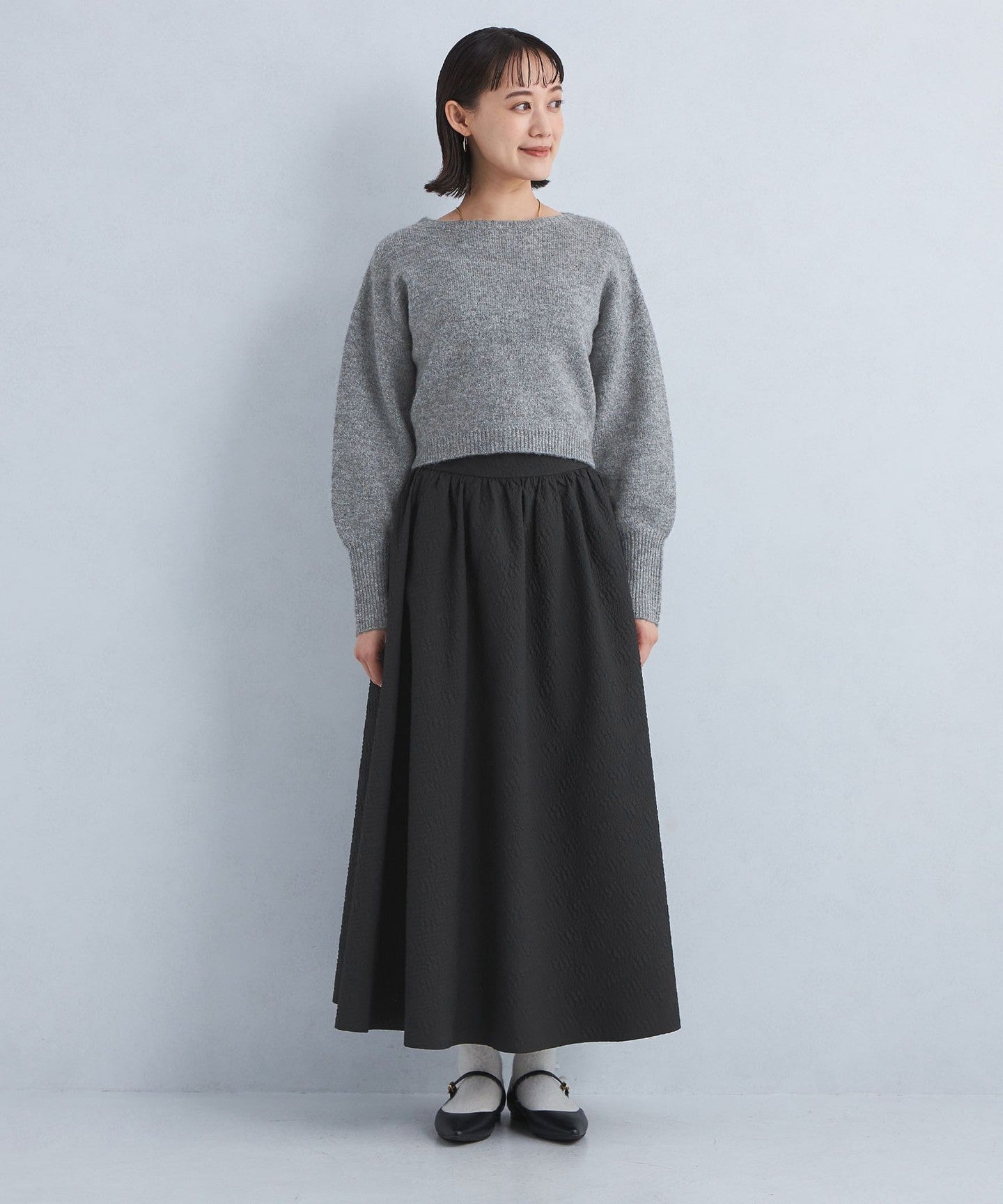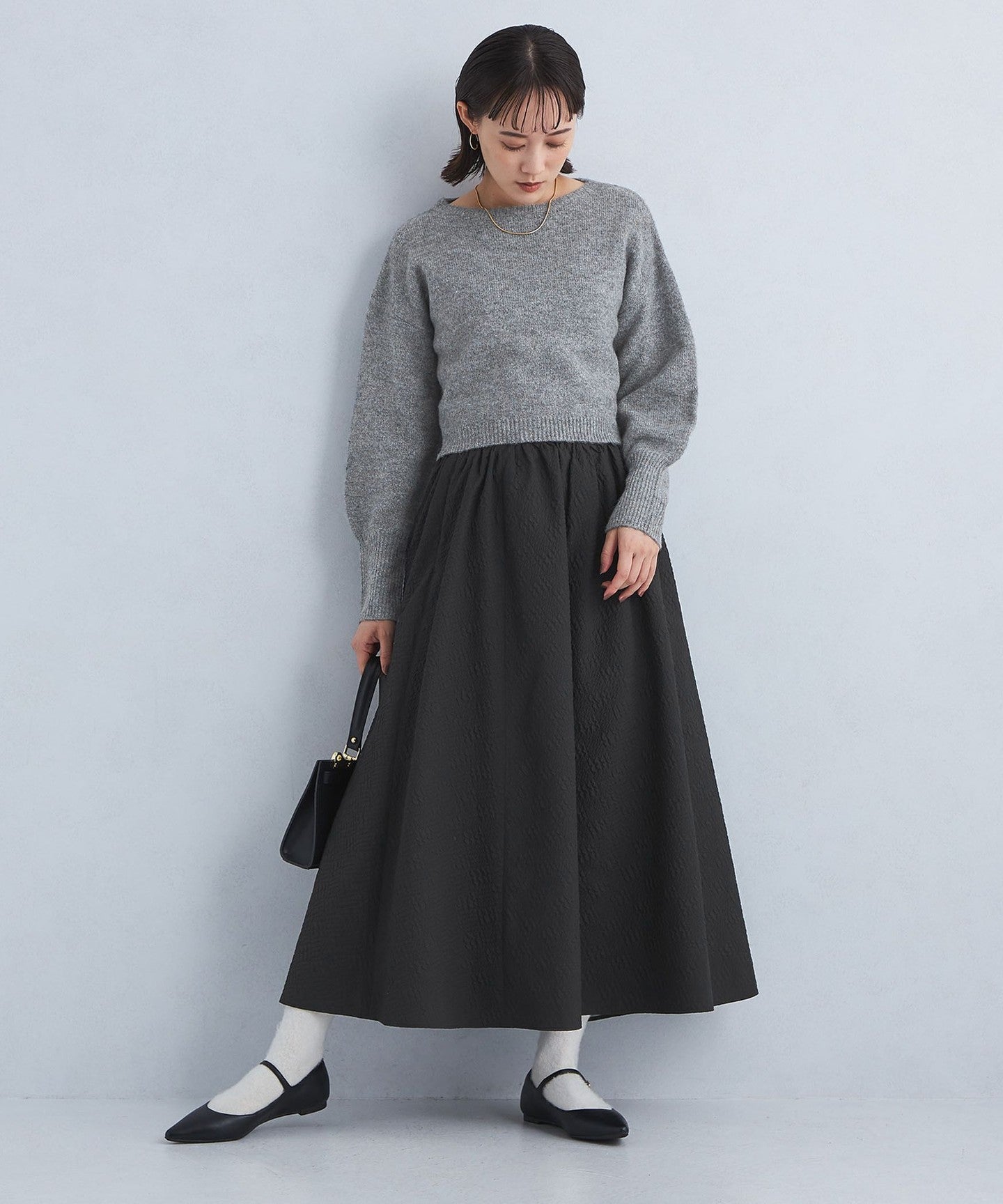 A knit set featuring lace-up detailing at the back, paired with a skirt made of gorgeous puffed jacquard fabric.