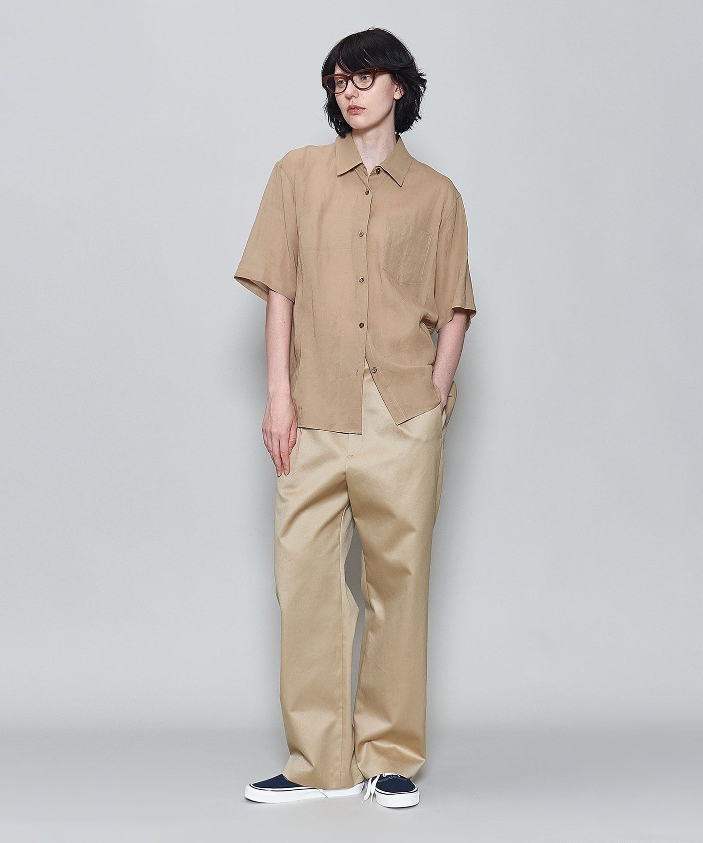 From the waist to the hips, the masculine square shape is maintained, while subtle tucks and volume are added to give a feminine, relaxed feel.