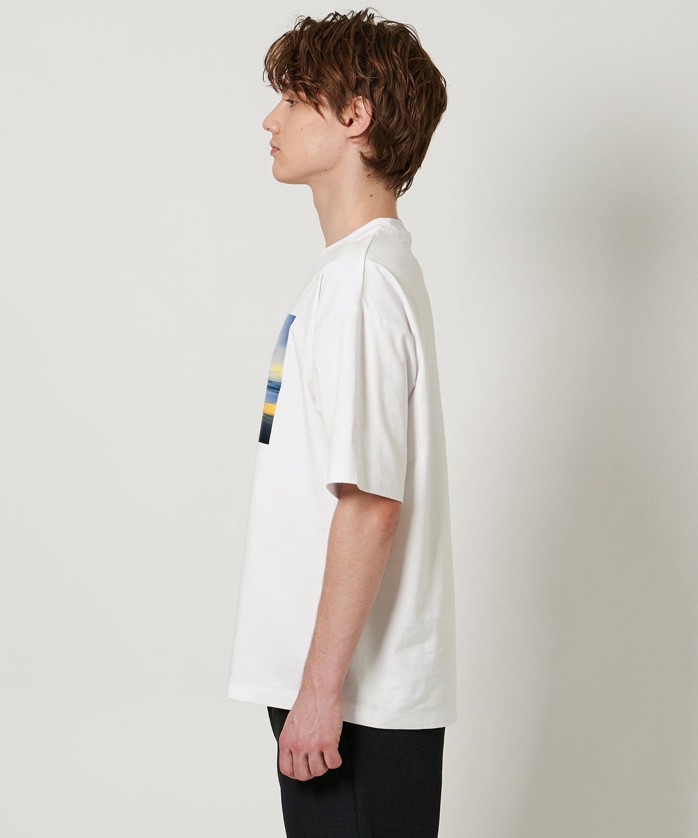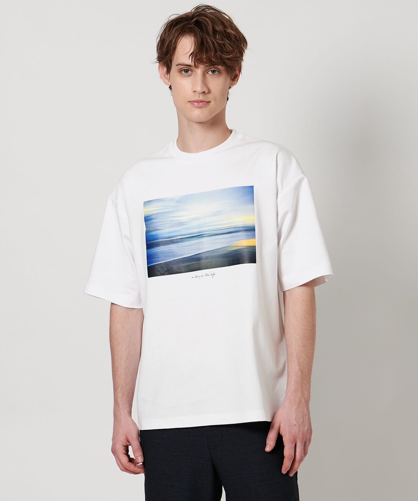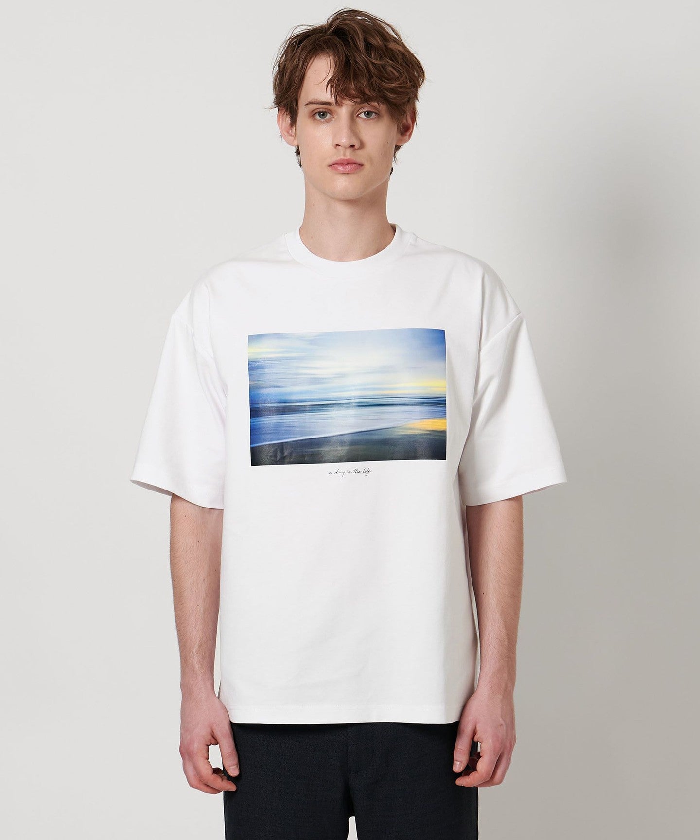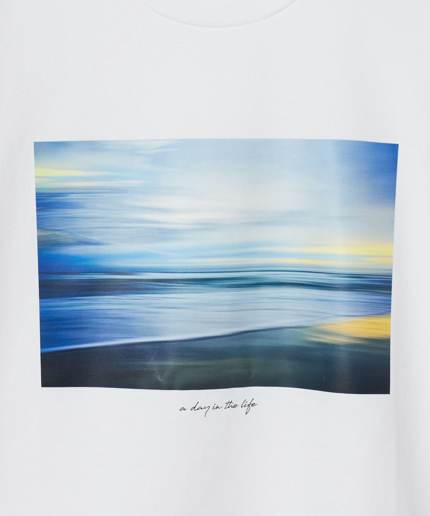 A T-shirt made of crisp ponte material featuring a photograph of a waterside.