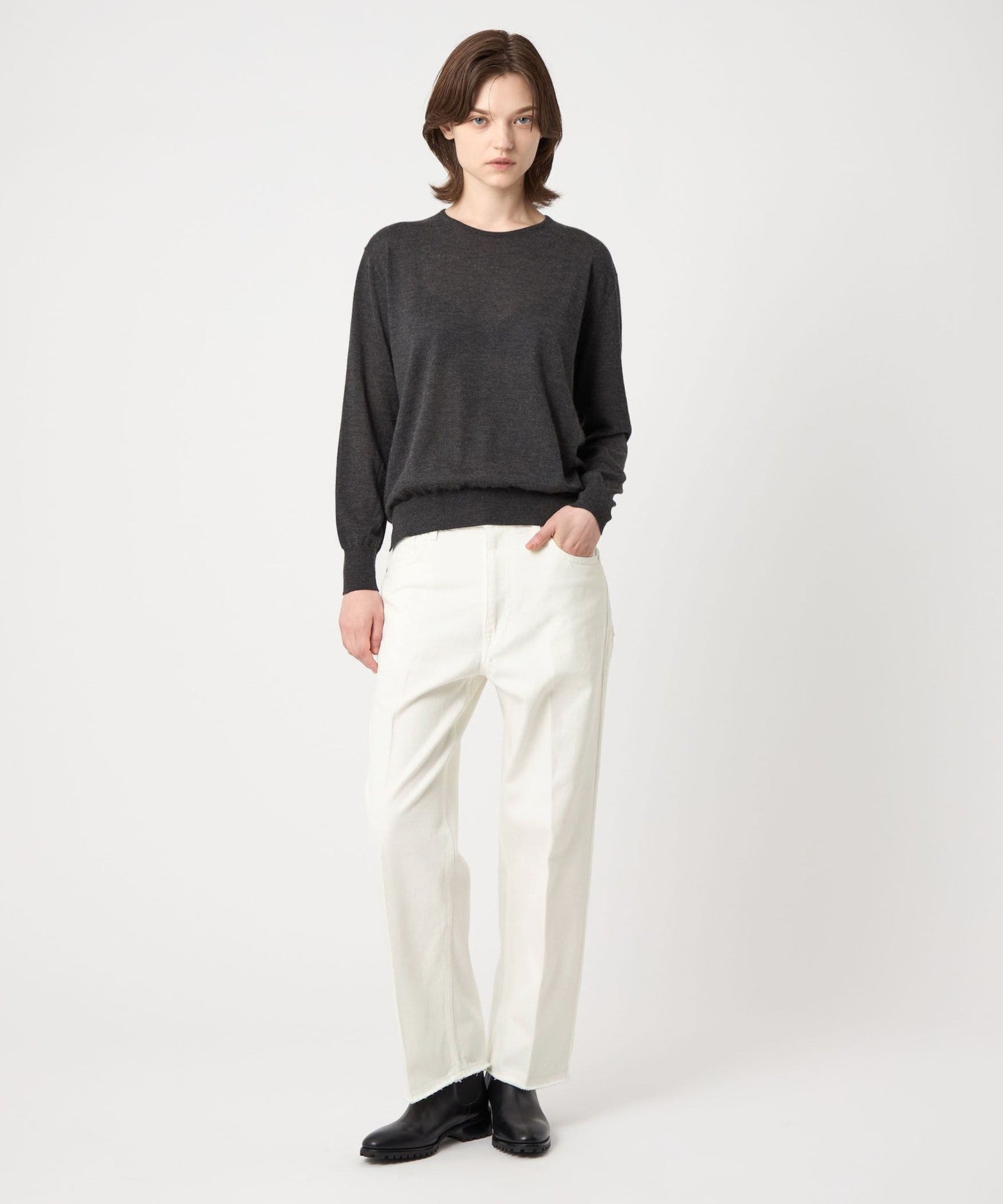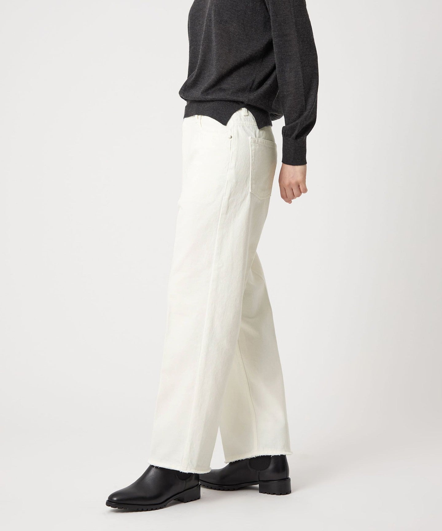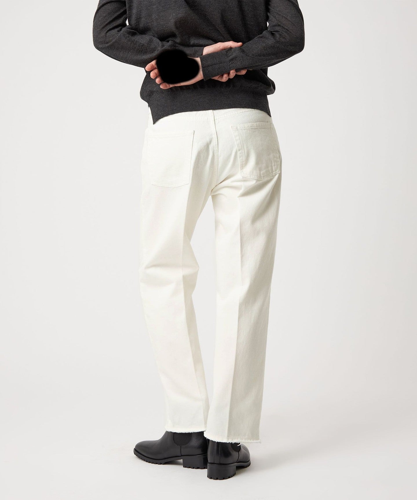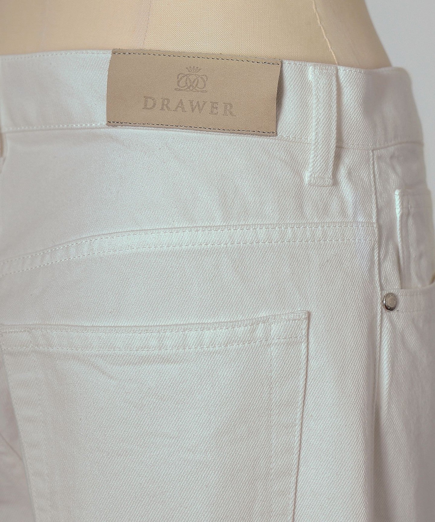 These white denim jeans have a clean, center-pressed form that gives them an elegant impression.