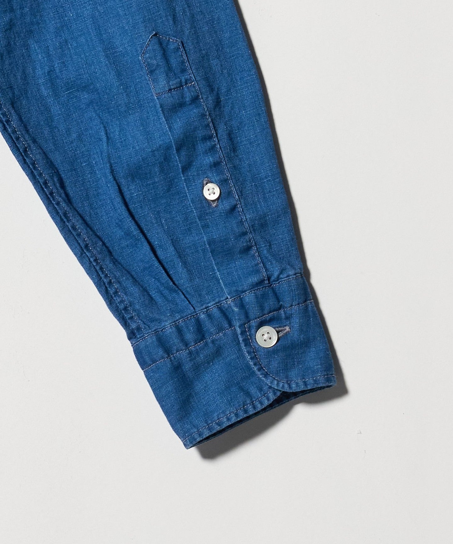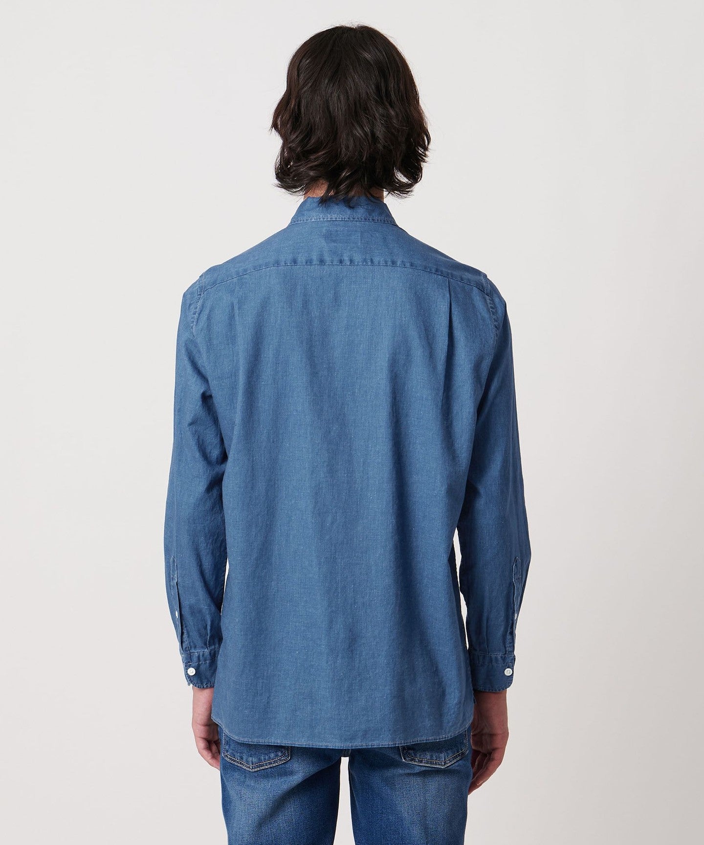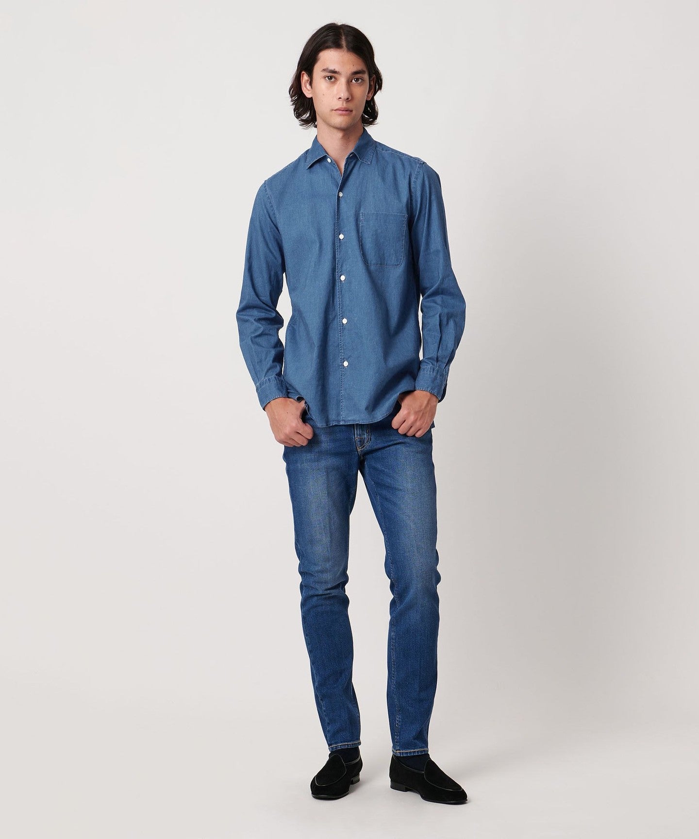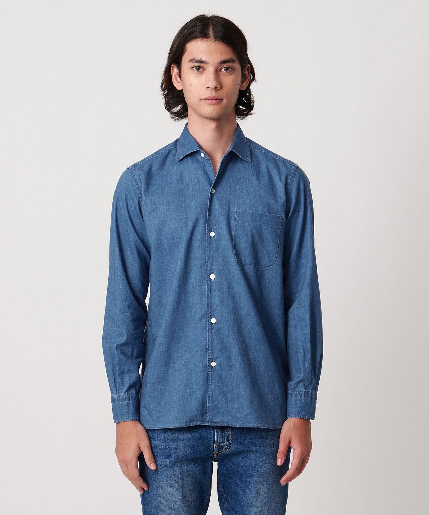 An Italian collar shirt made from indigo-dyed denim fabric with a rich texture.