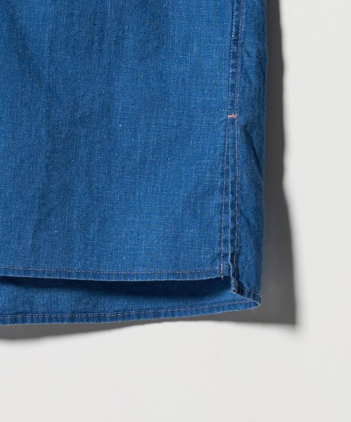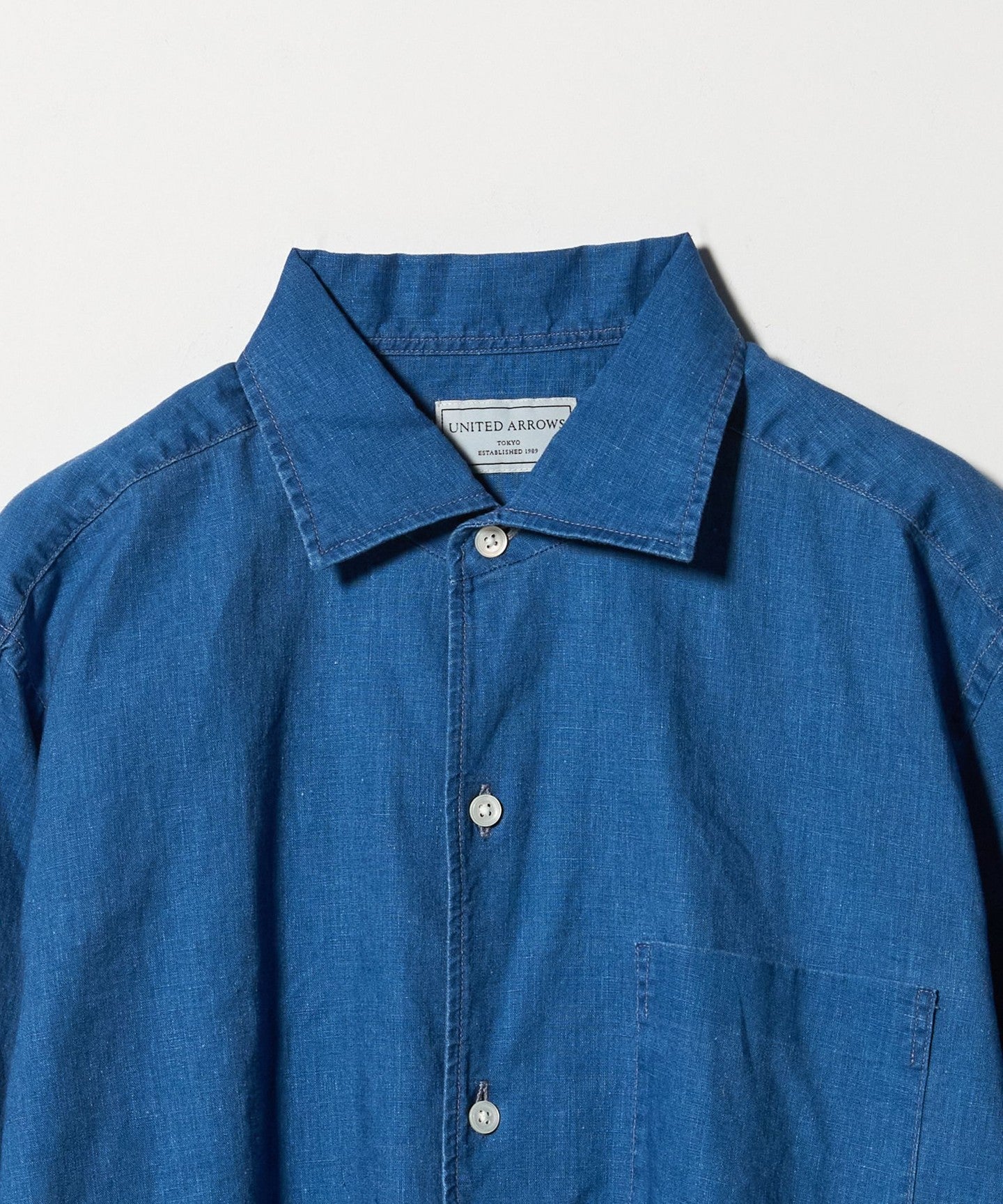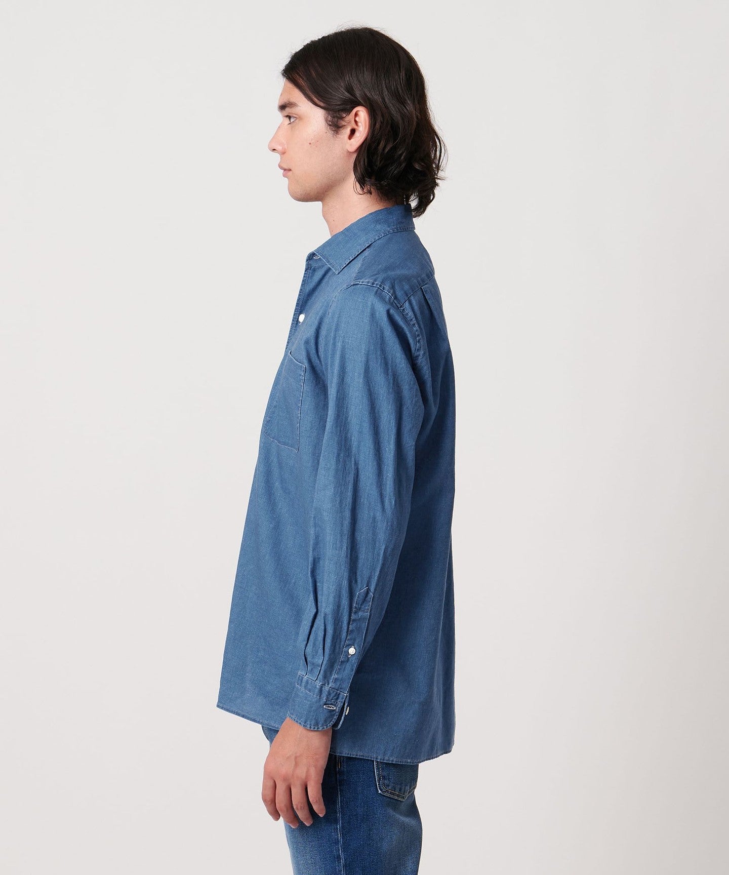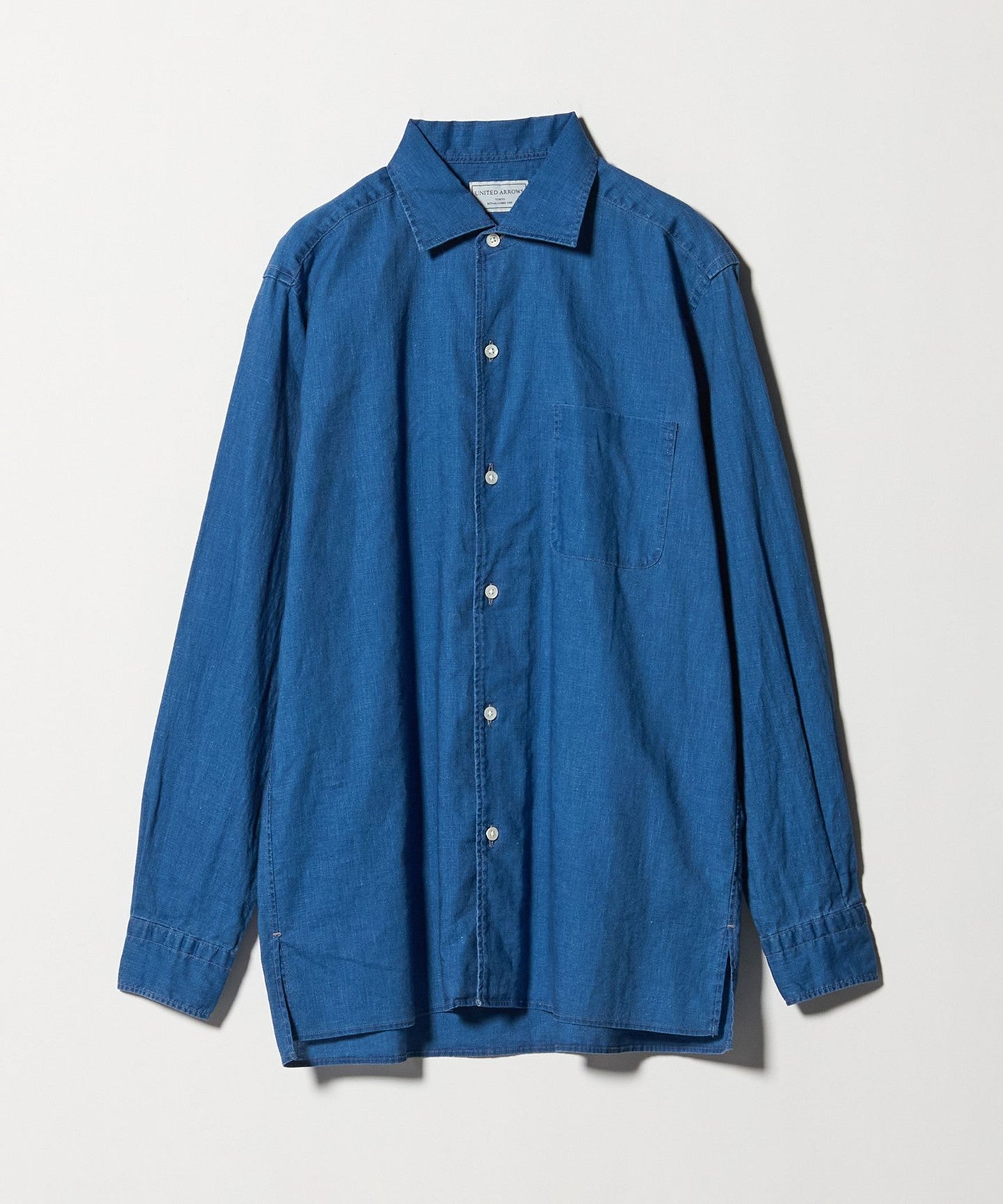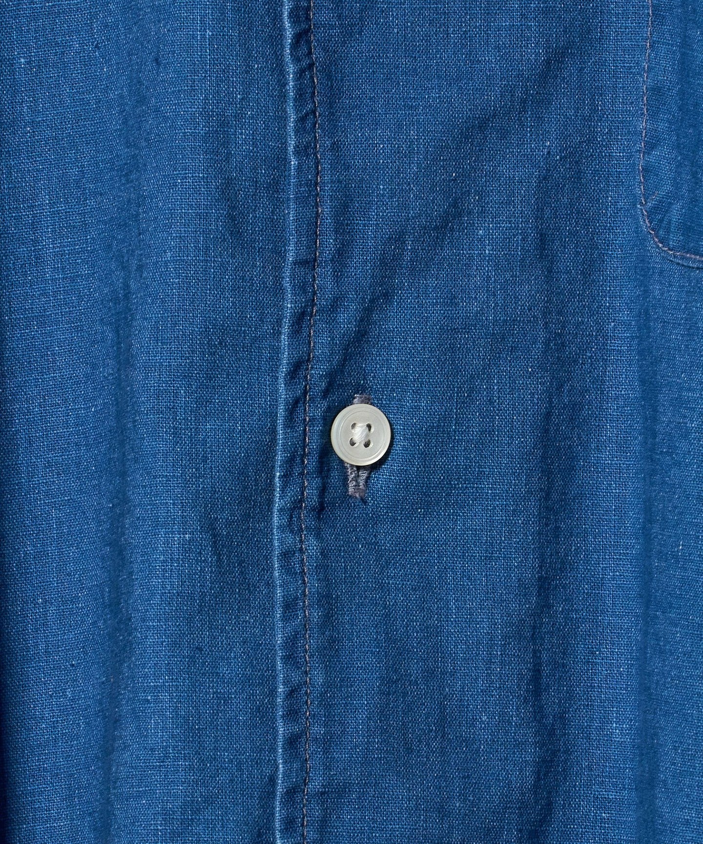 An Italian collar shirt made from indigo-dyed denim fabric with a rich texture.