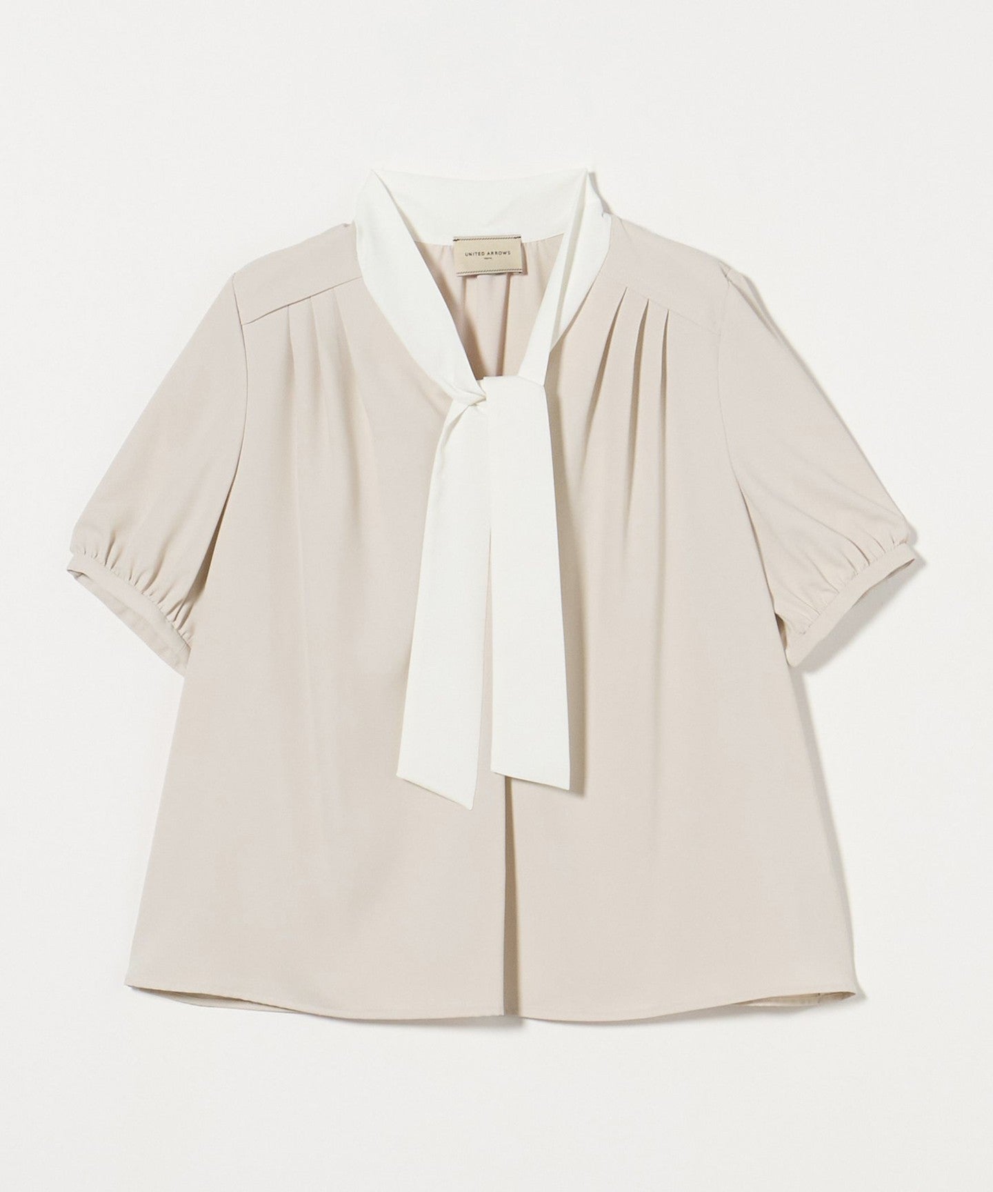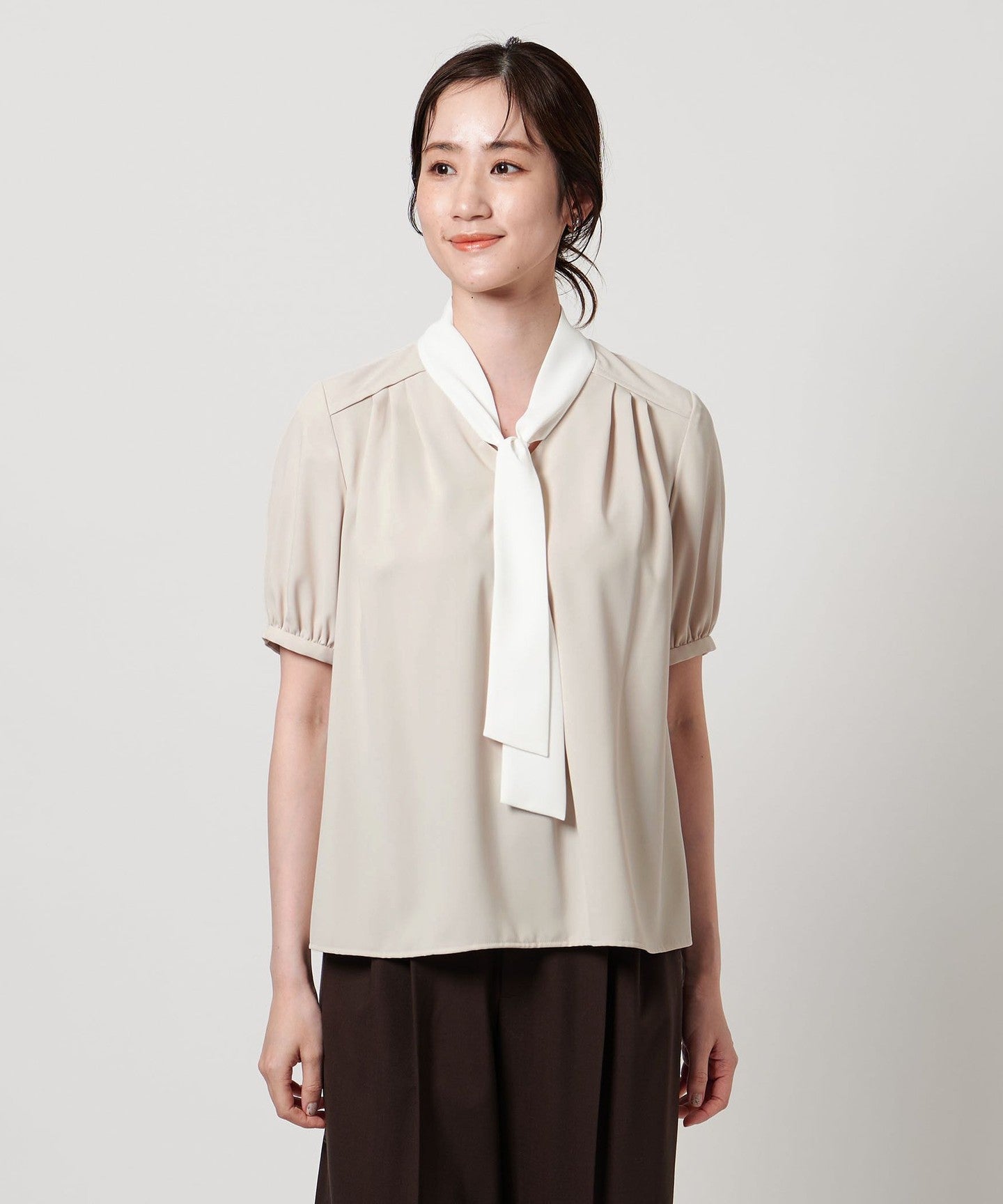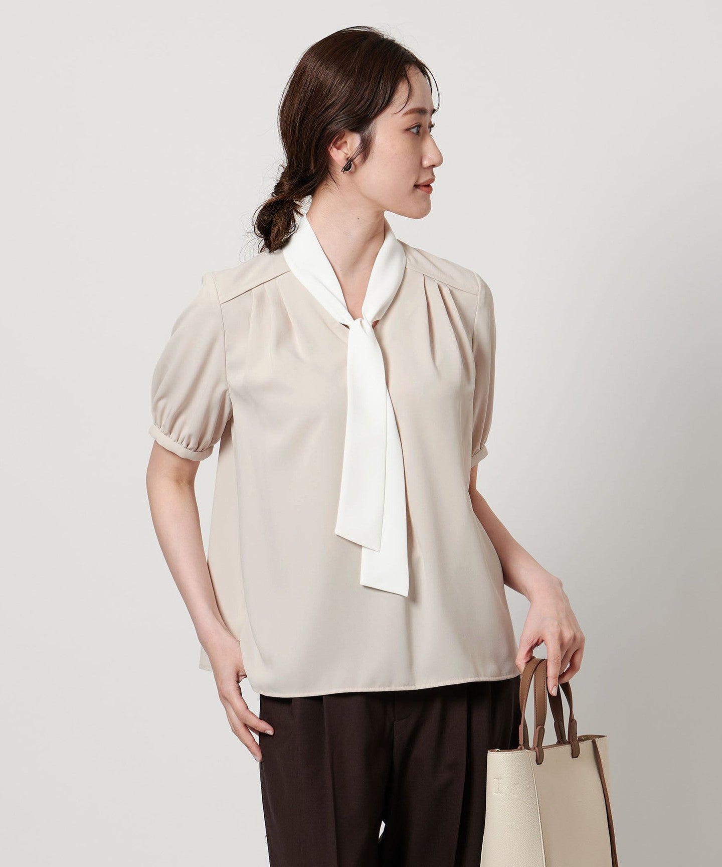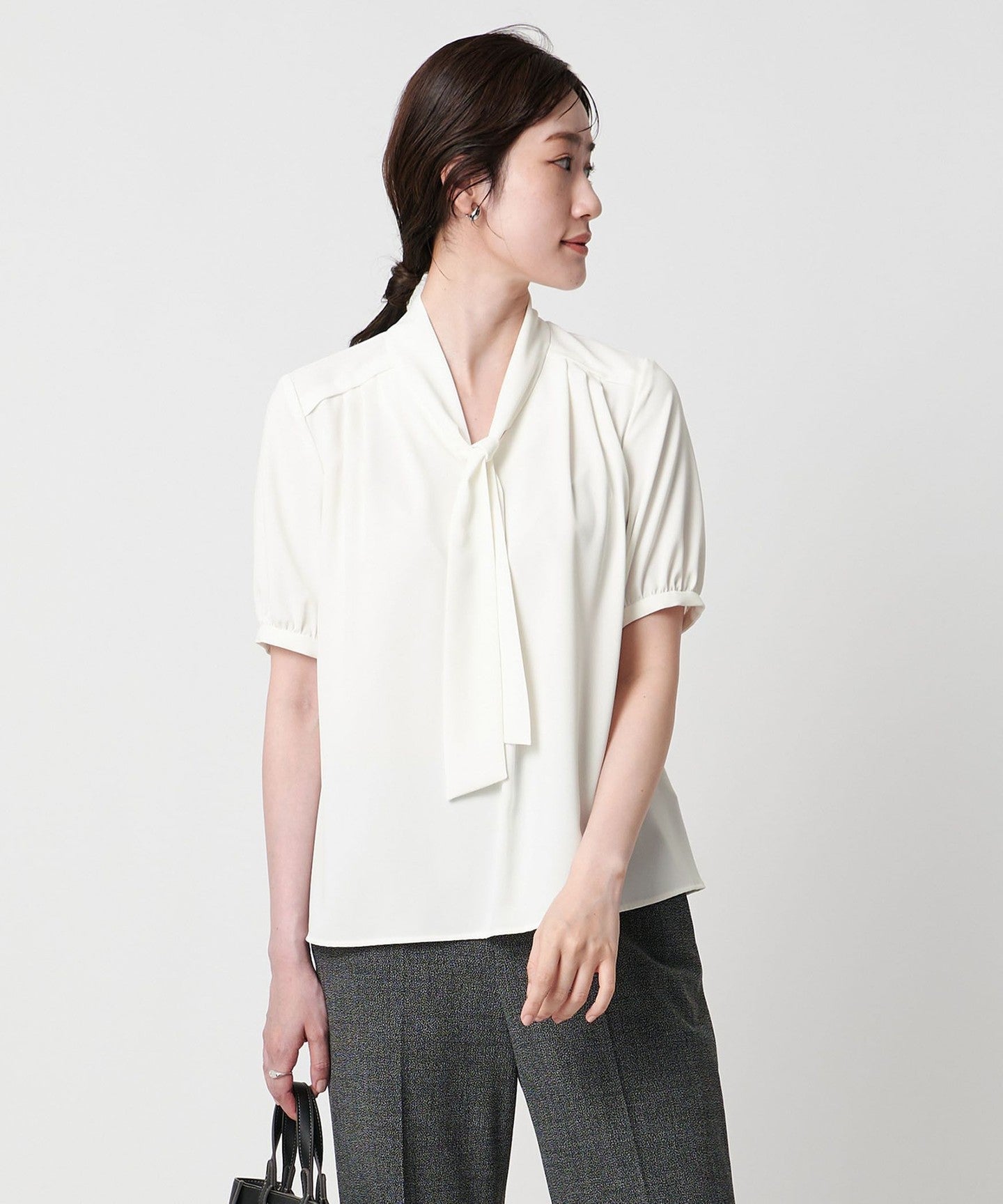 A feminine blouse with a bow tie on the front that adds an elegant accent.