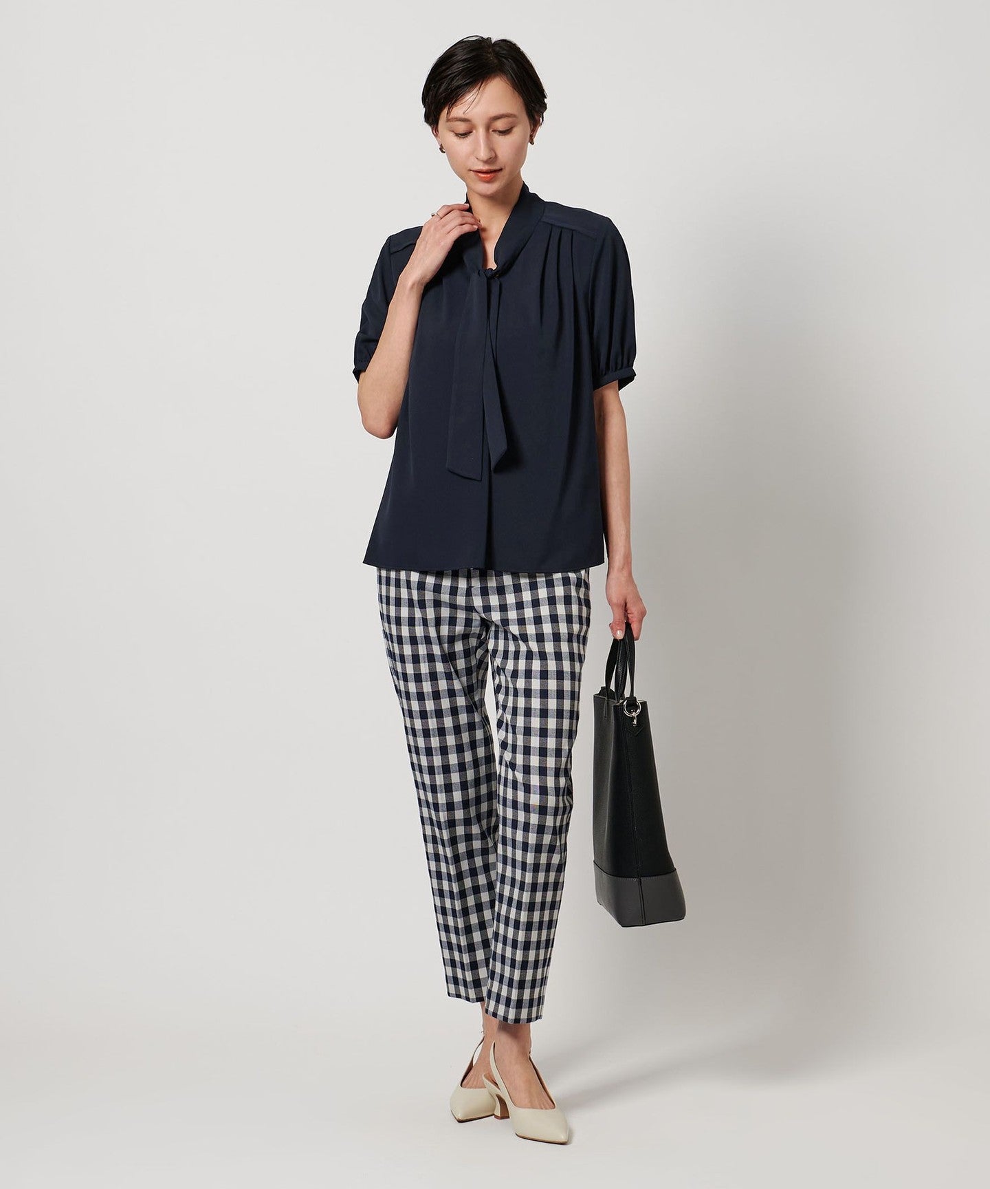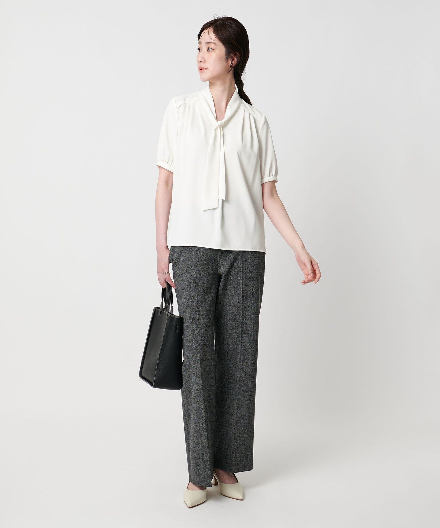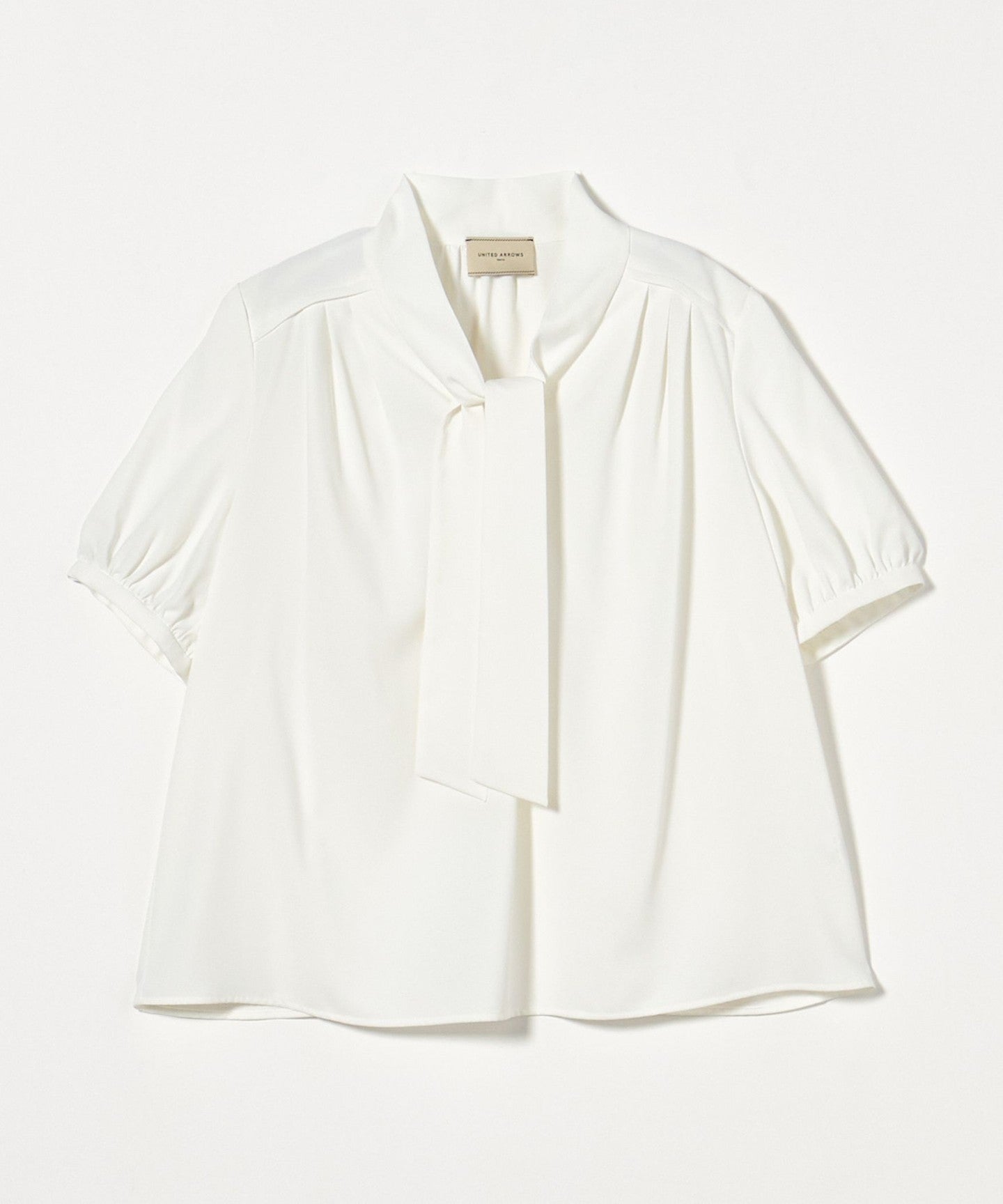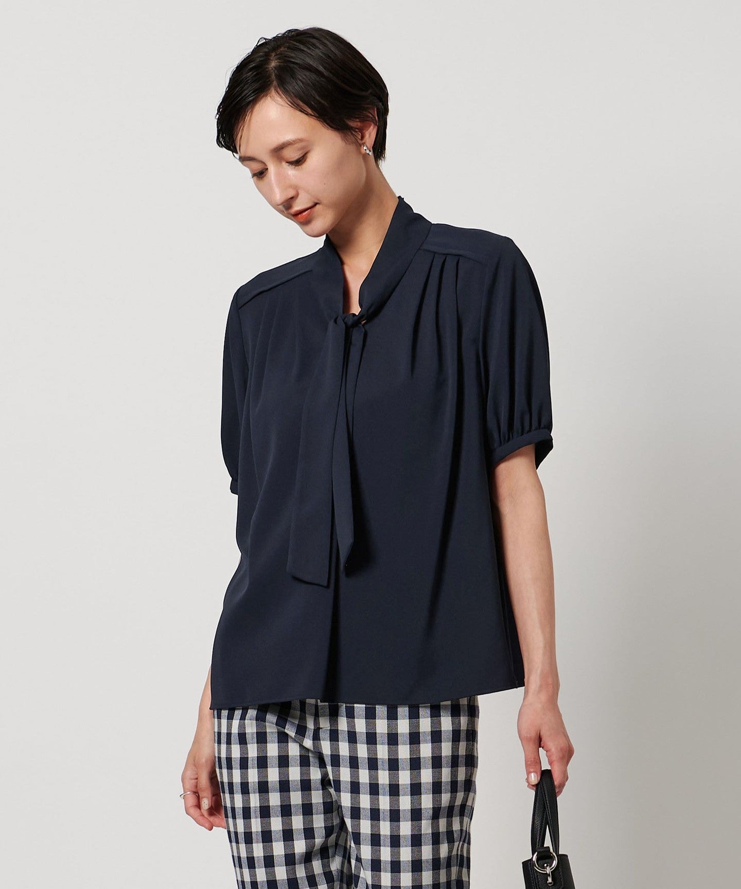 A feminine blouse with a bow tie on the front that adds an elegant accent.