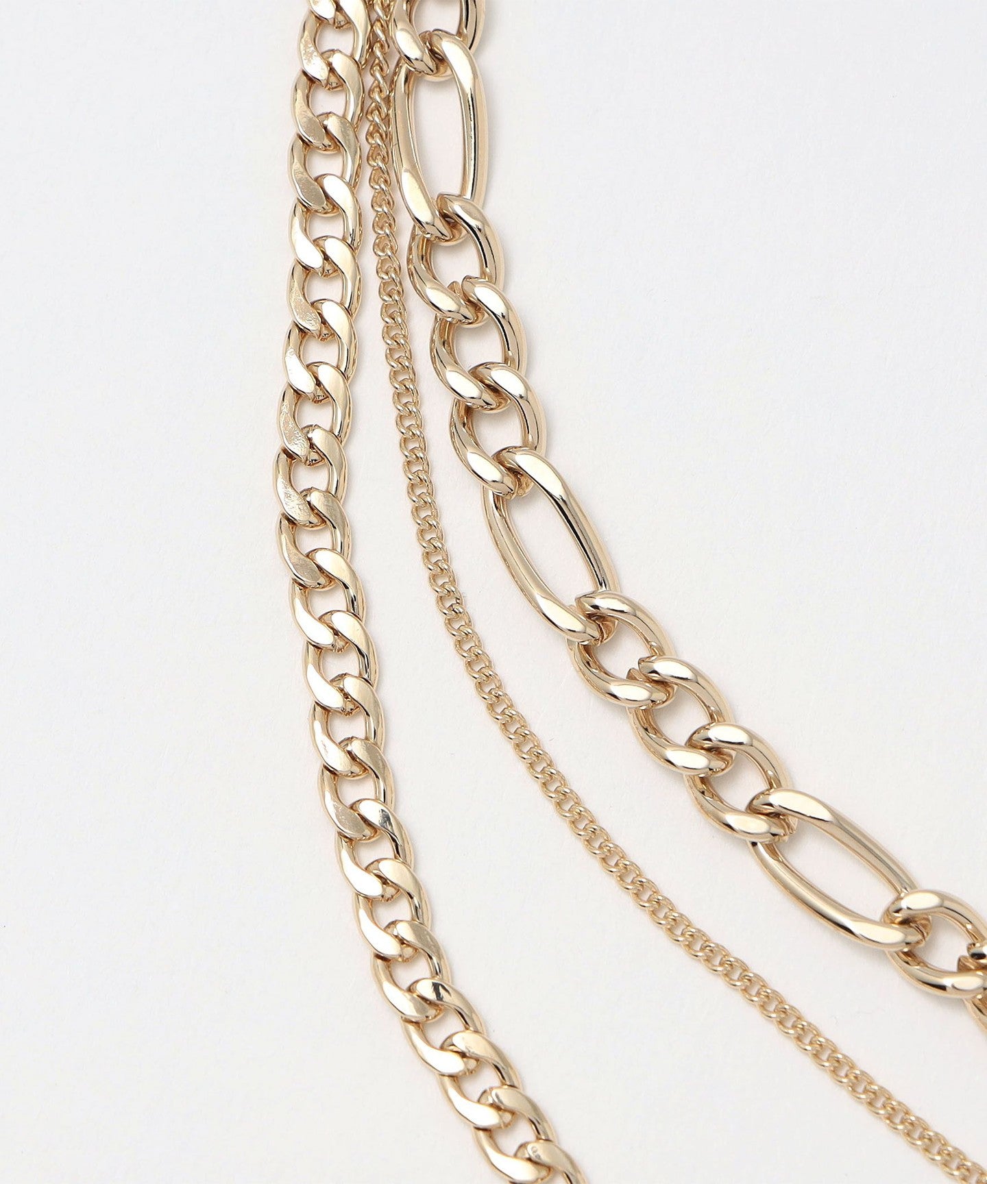 A three-strand necklace with different chain designs and a coin motif.