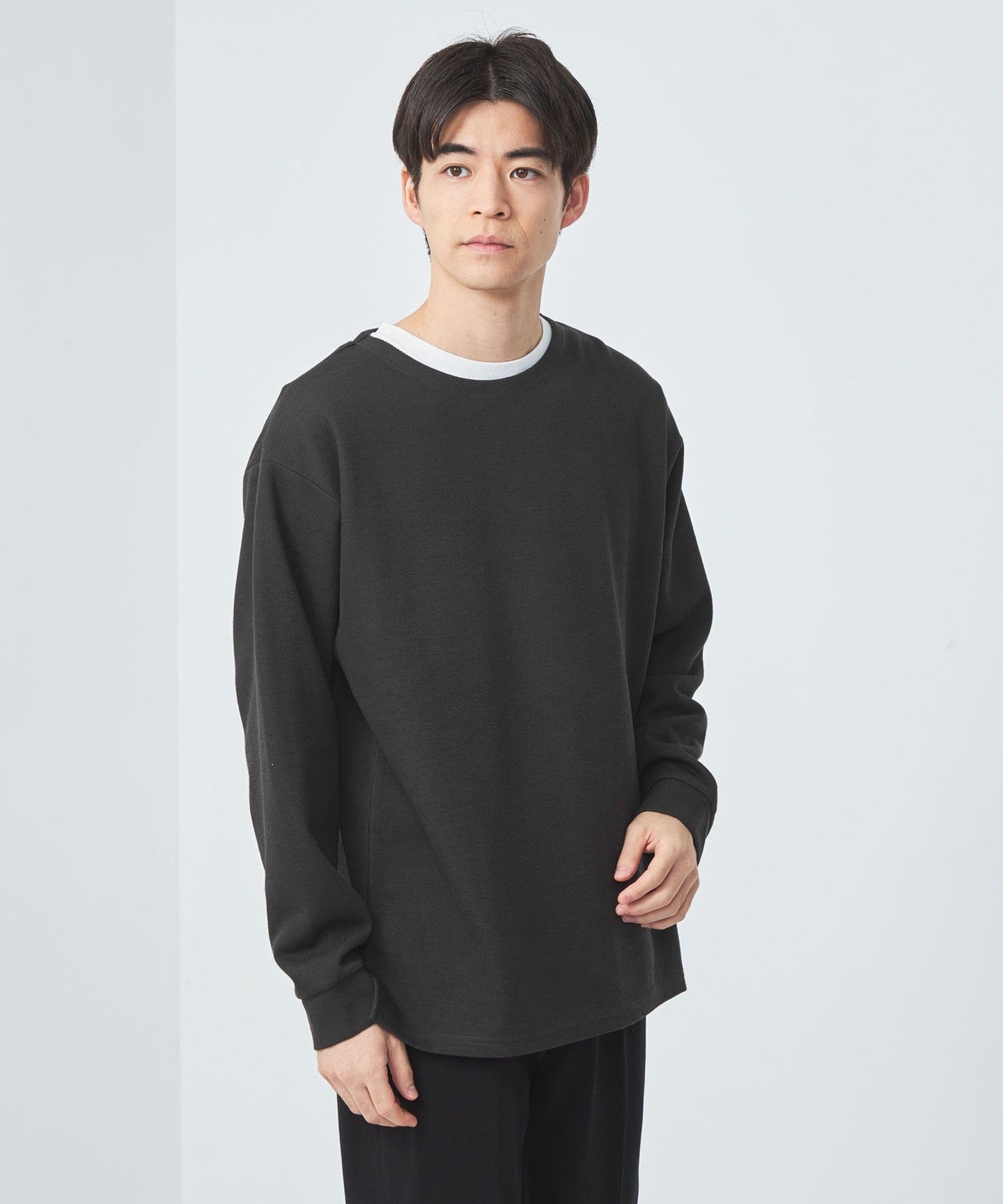 This is a collarless cut-and-sew top with a slight amount of room and just the right thickness.
