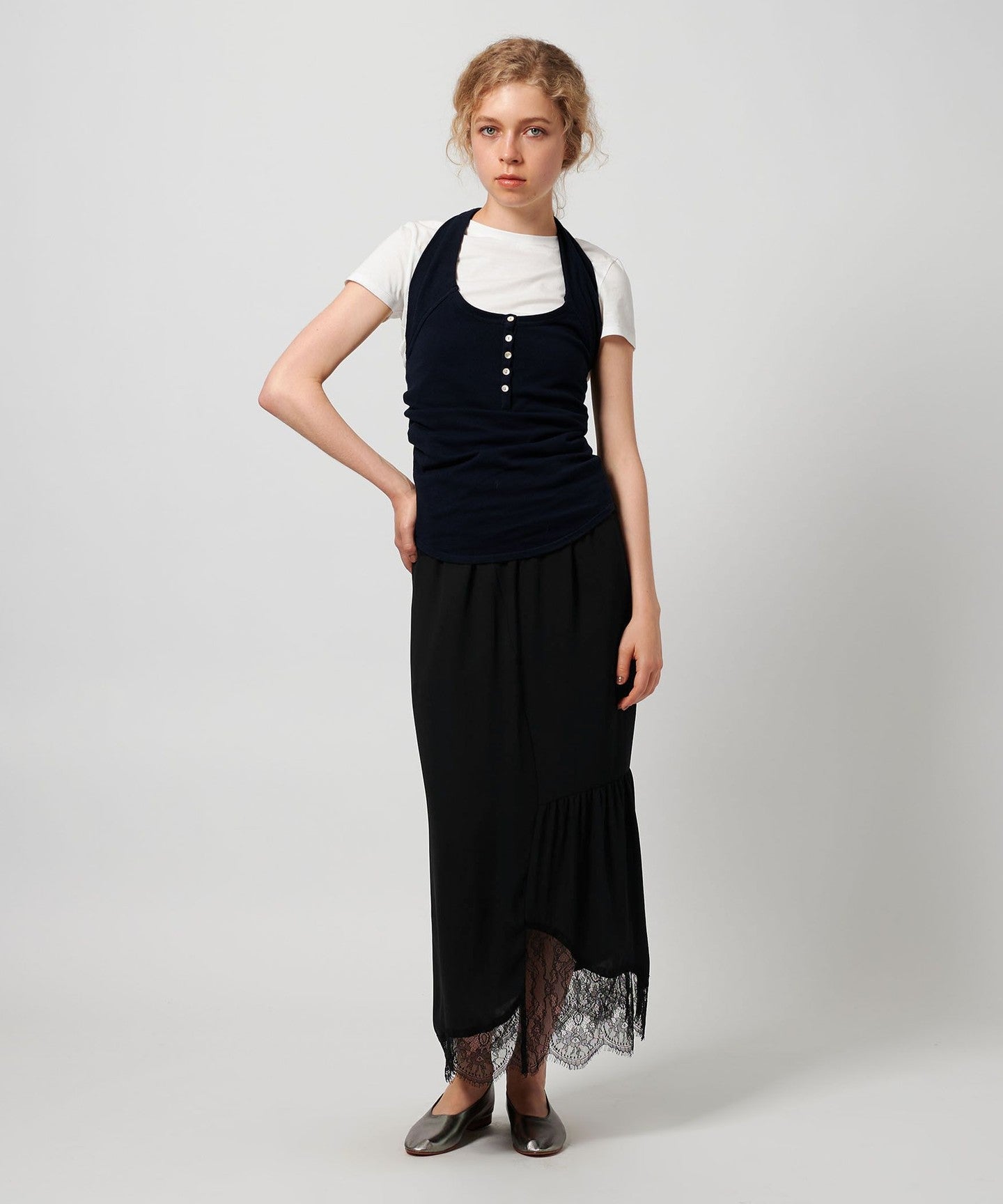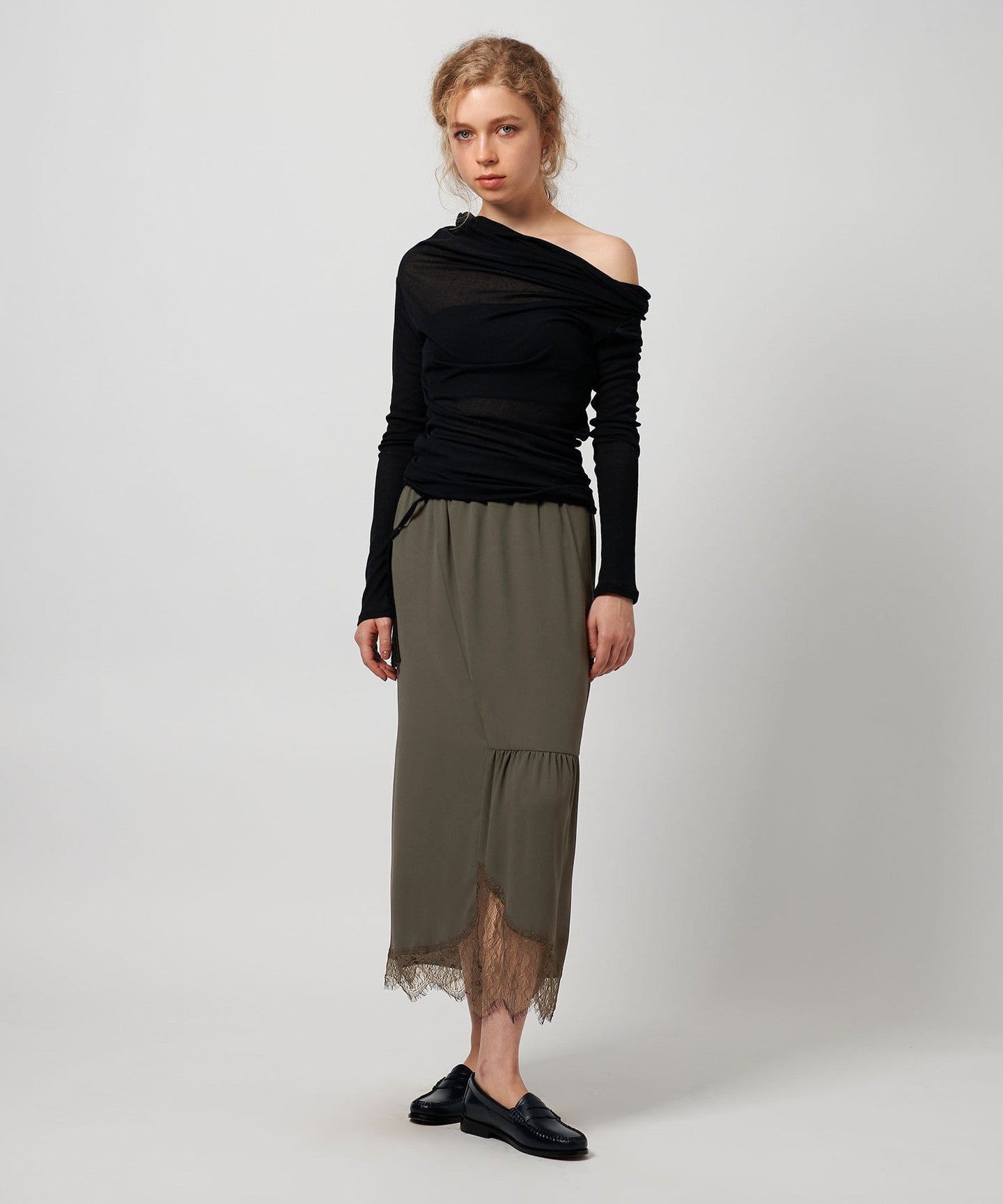 This long skirt features subtle lace at the hem and an asymmetrical design that gives it a ladylike look.