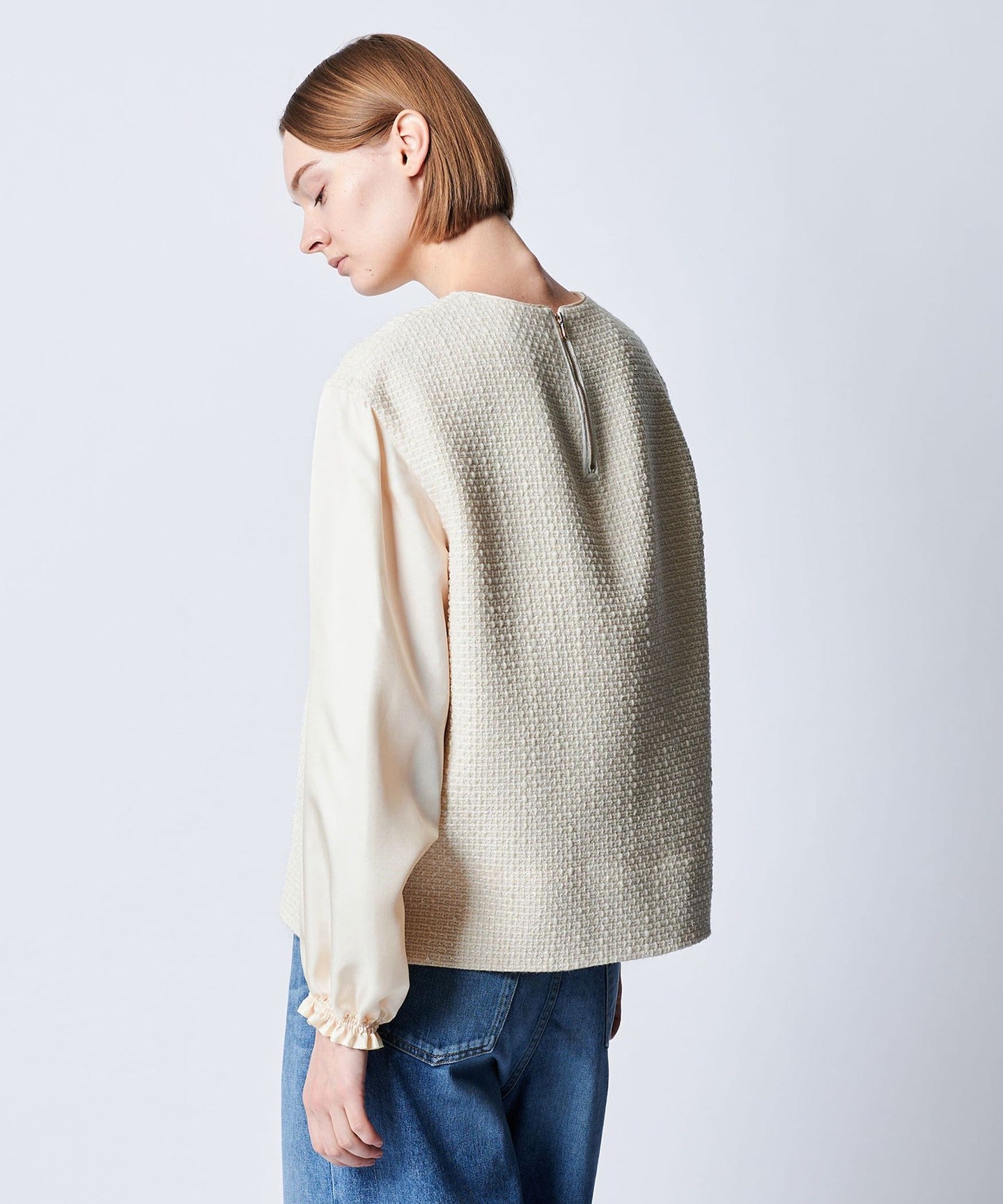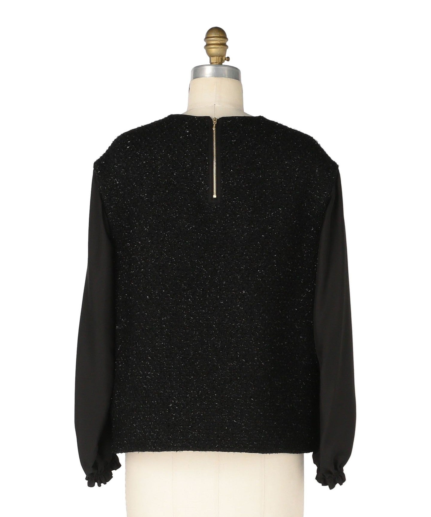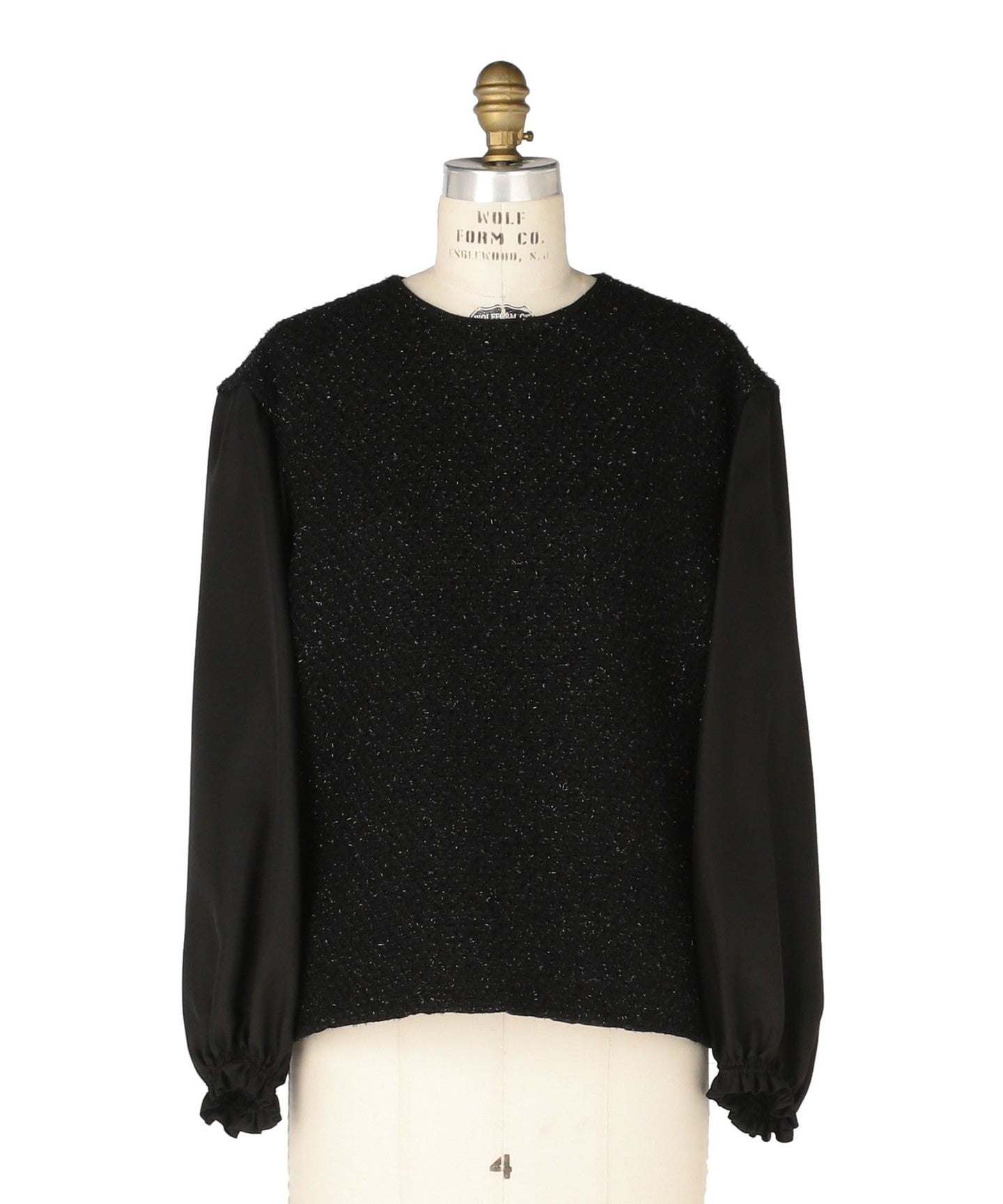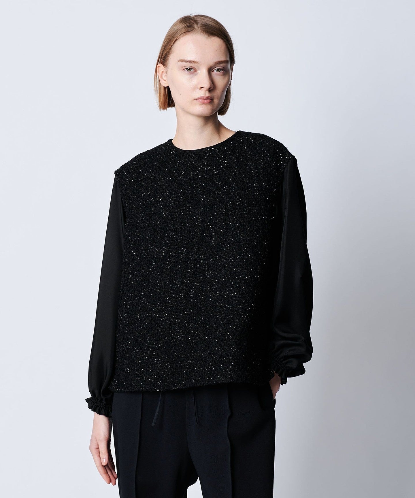 A pullover blouse that combines a dressy, glittery tweed body with glossy twill sleeves.