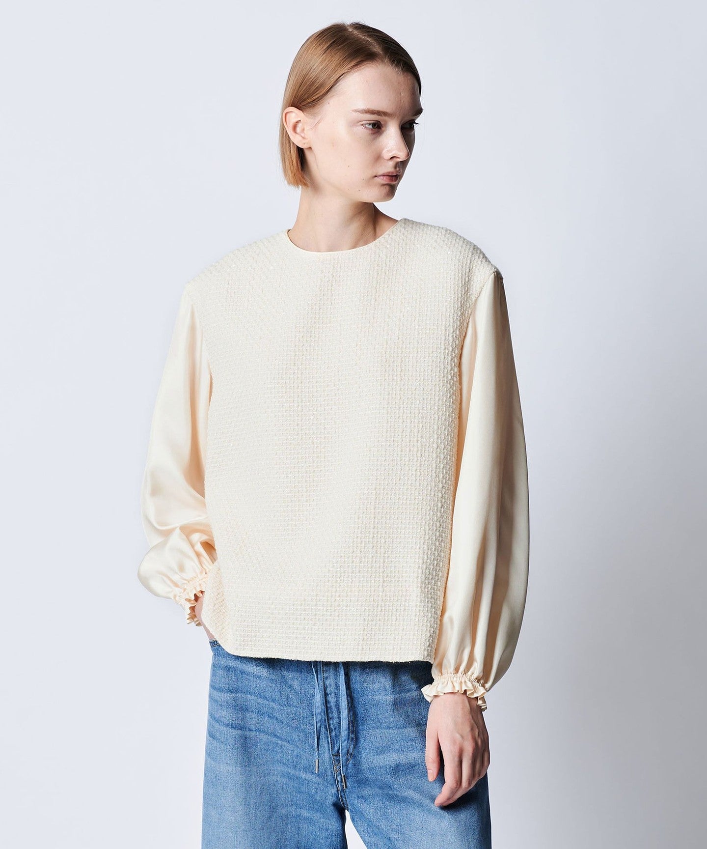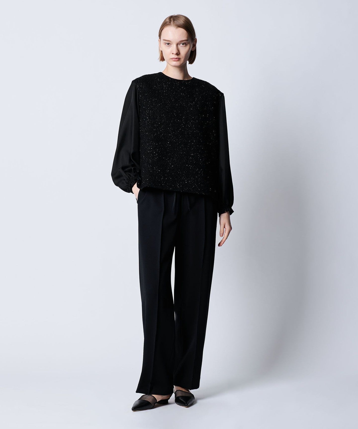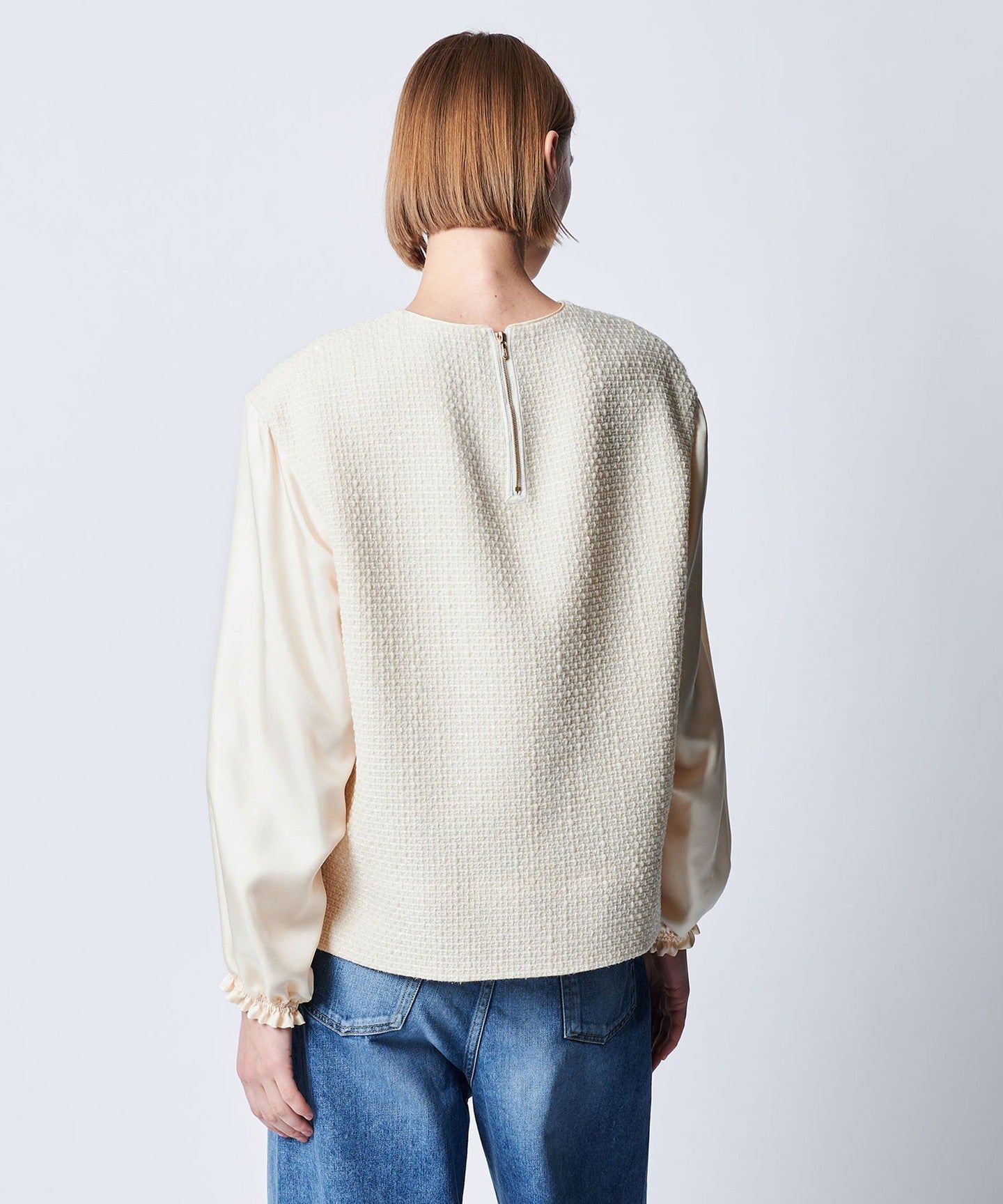 A pullover blouse that combines a dressy, glittery tweed body with glossy twill sleeves.