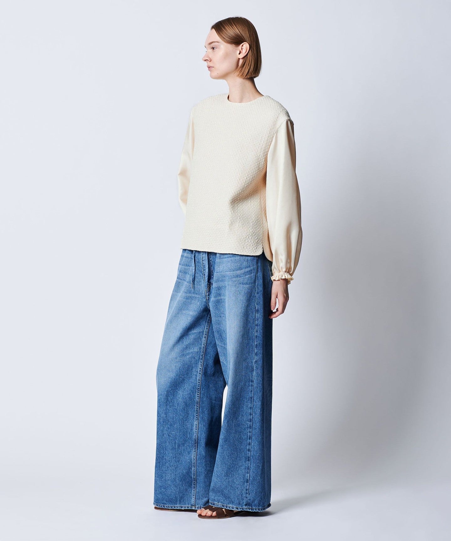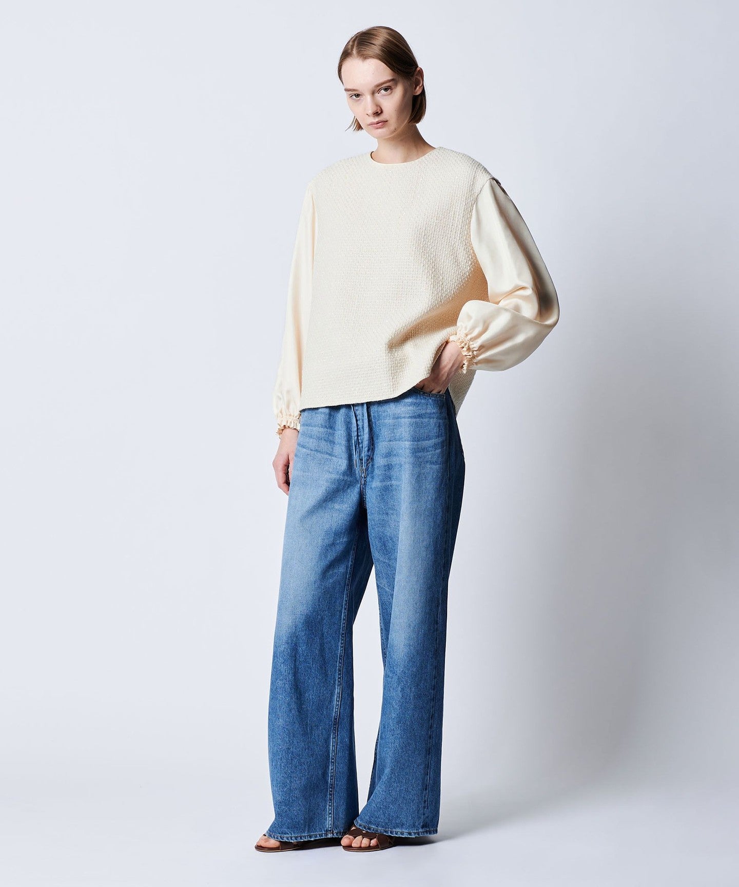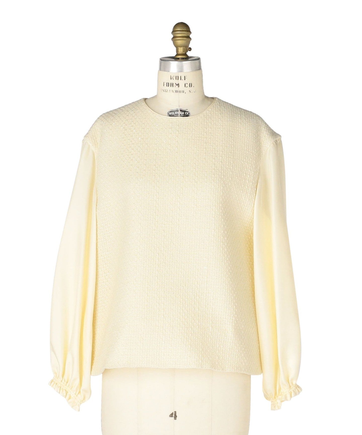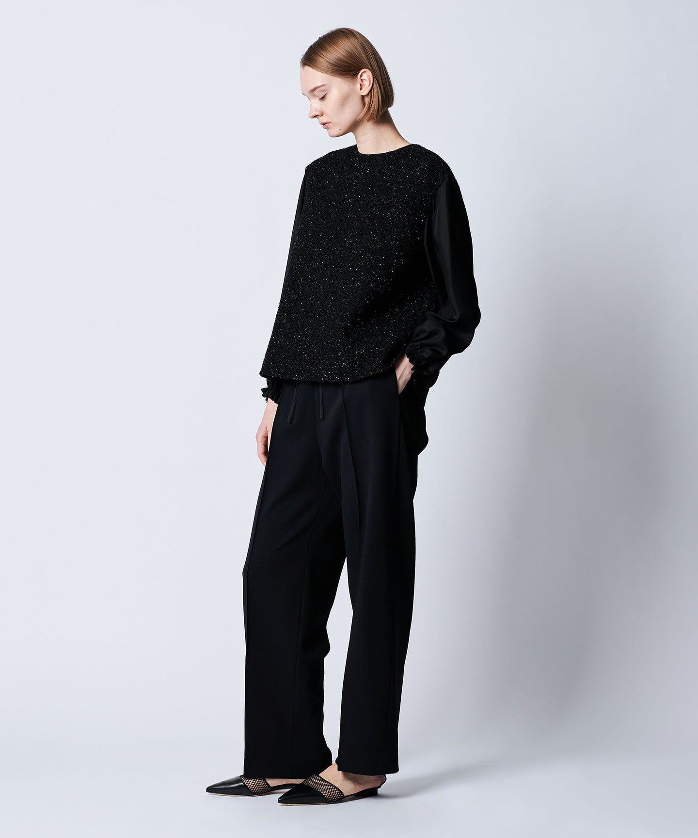 A pullover blouse that combines a dressy, glittery tweed body with glossy twill sleeves.