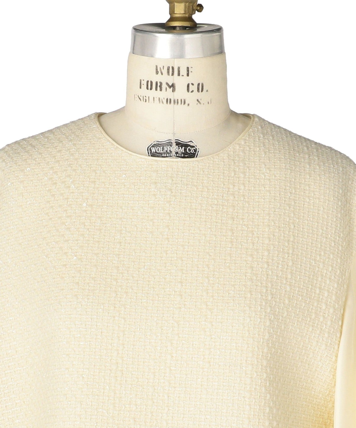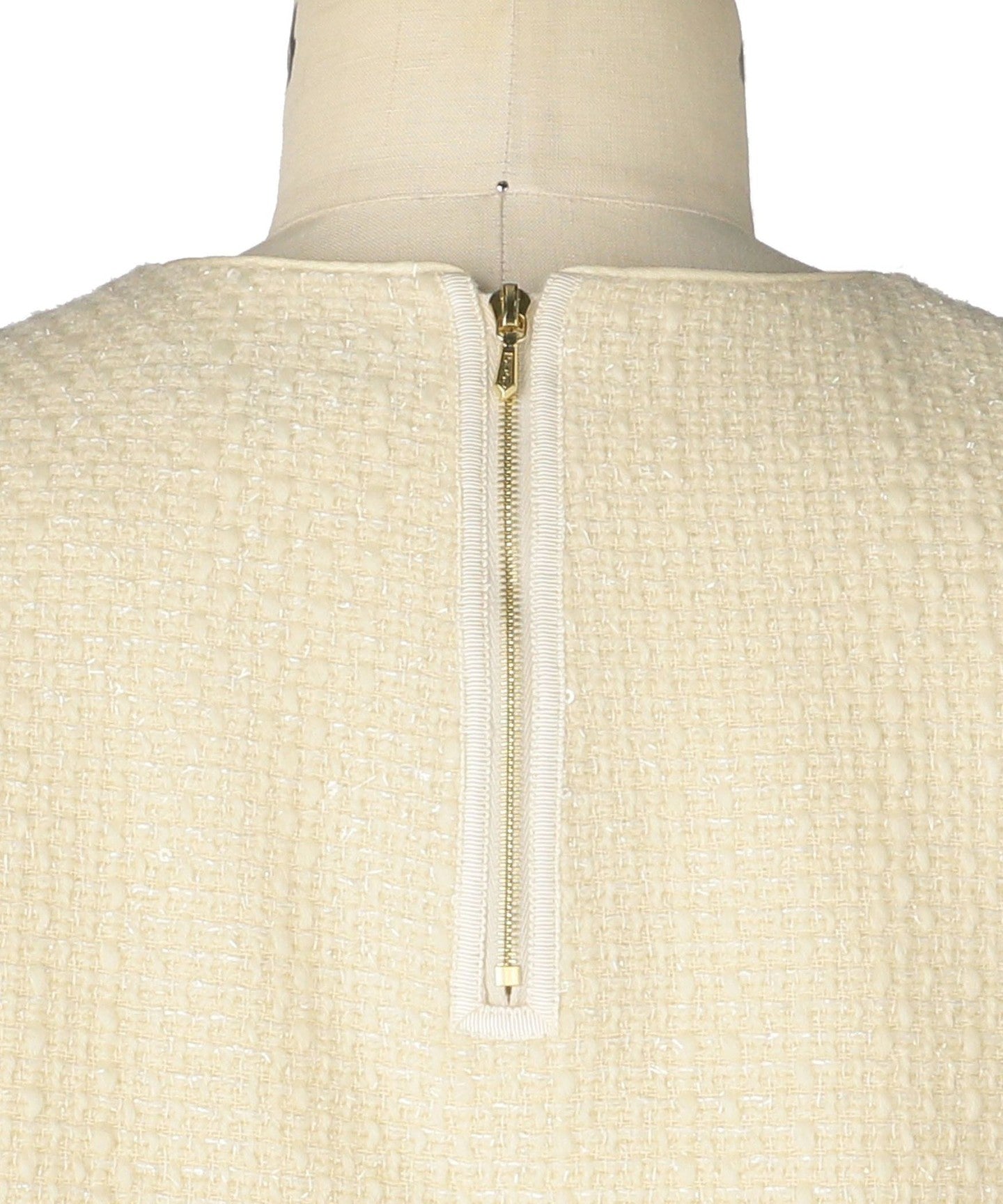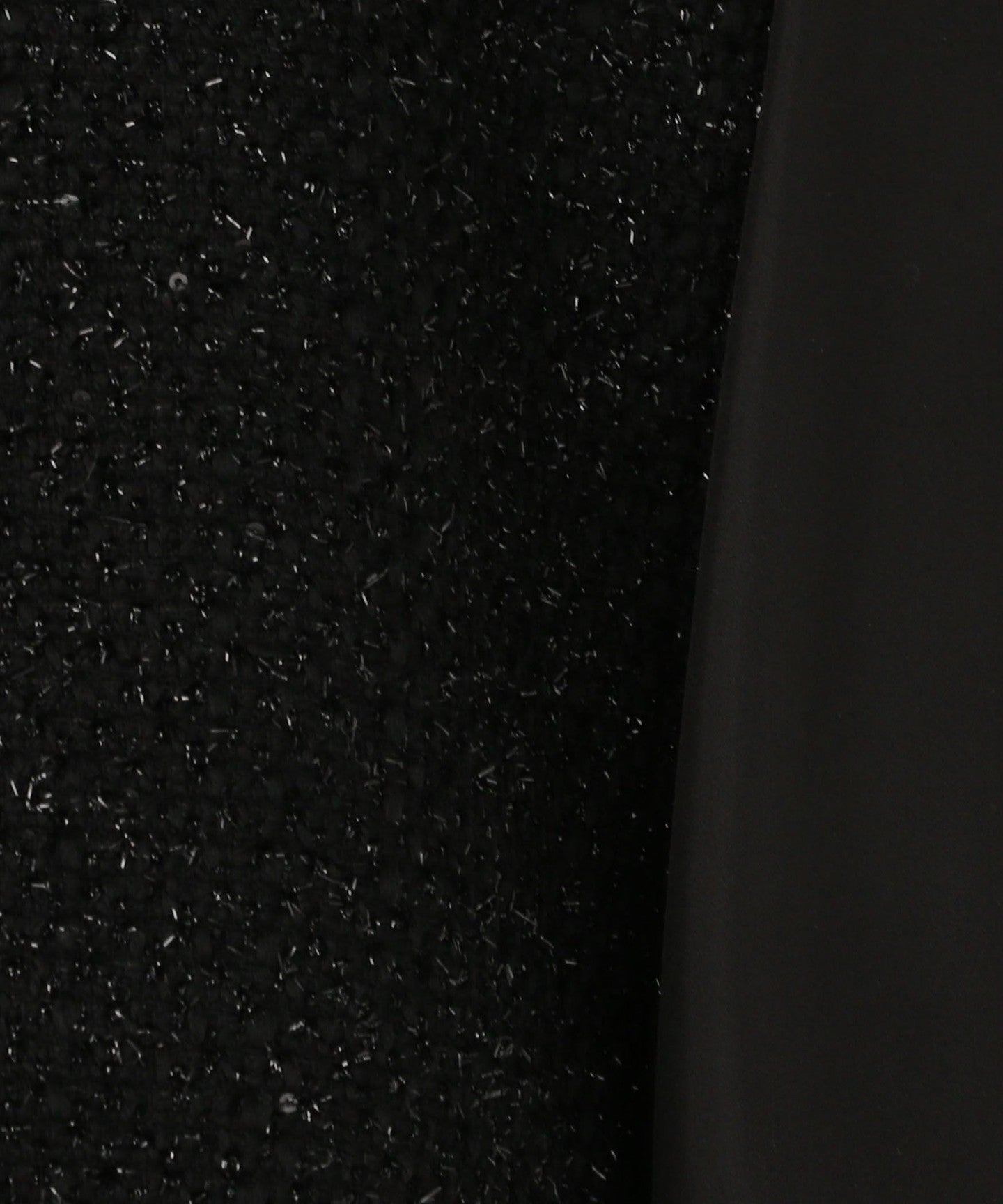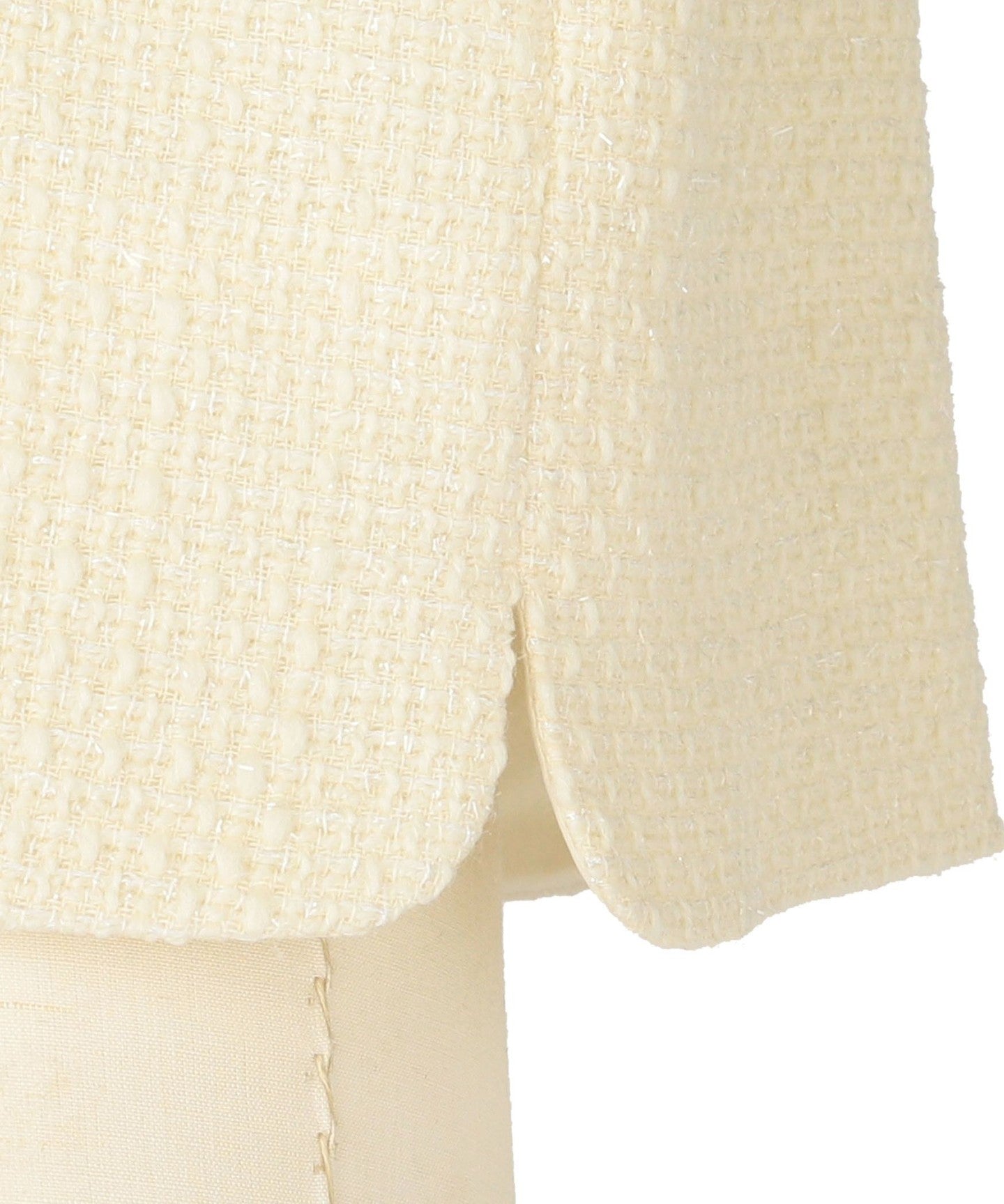 The body is made of gorgeous tweed fabric with slit threads and sequins, while the sleeves are made of silk twill fabric with a moderate sheen and texture.