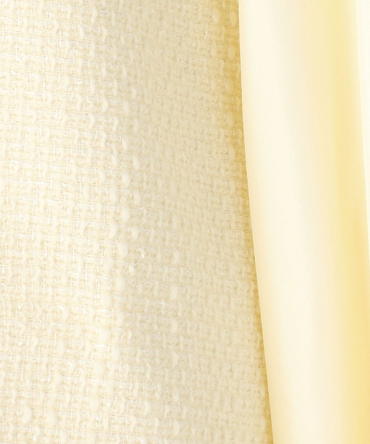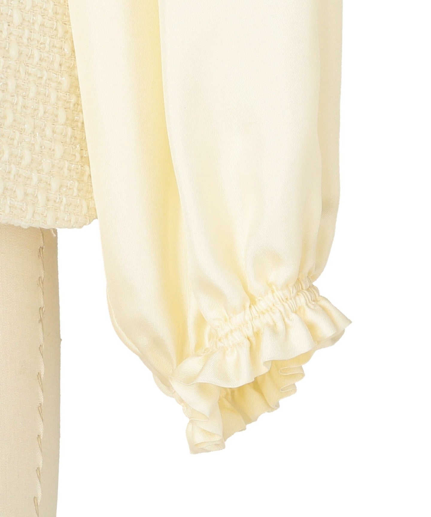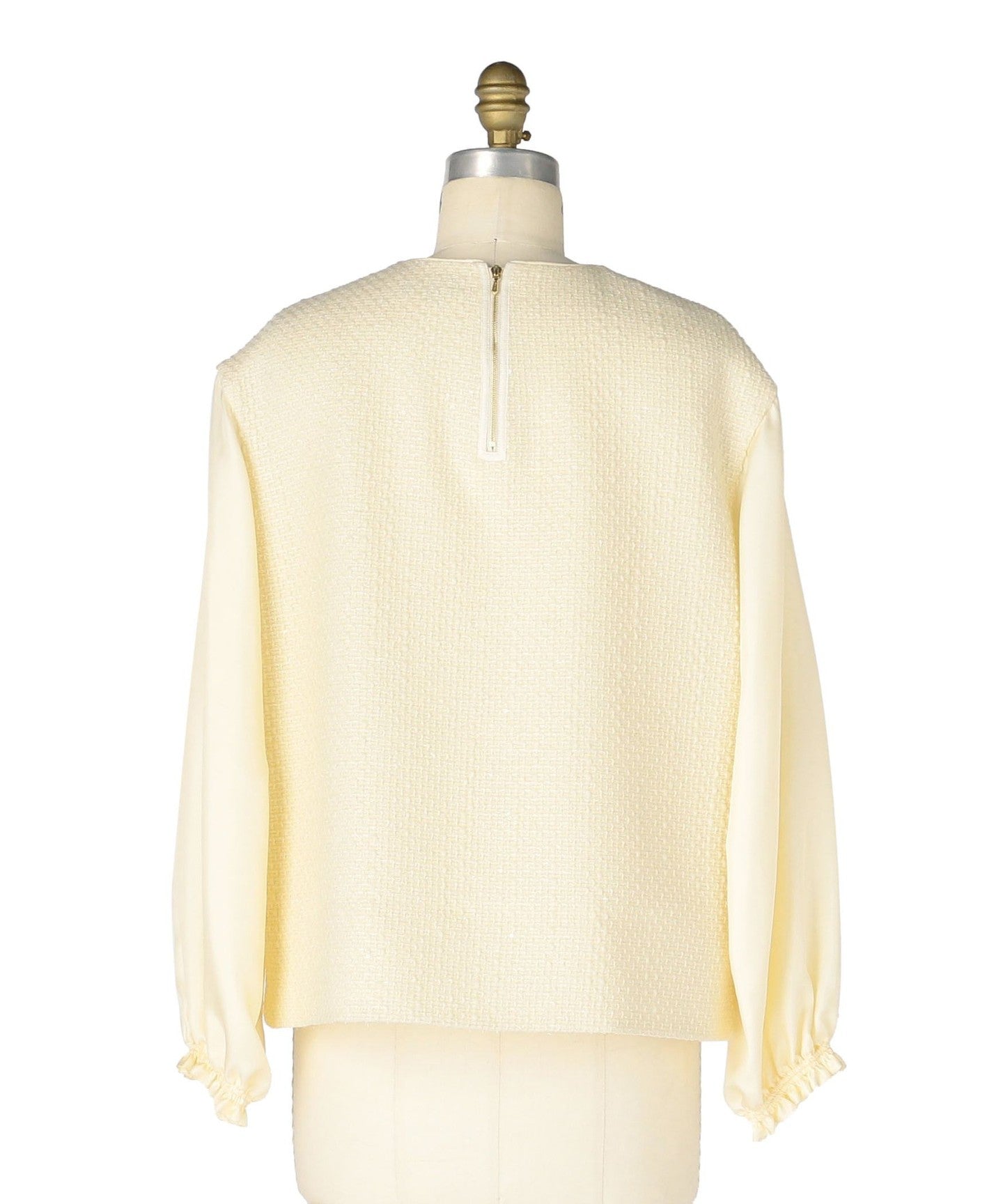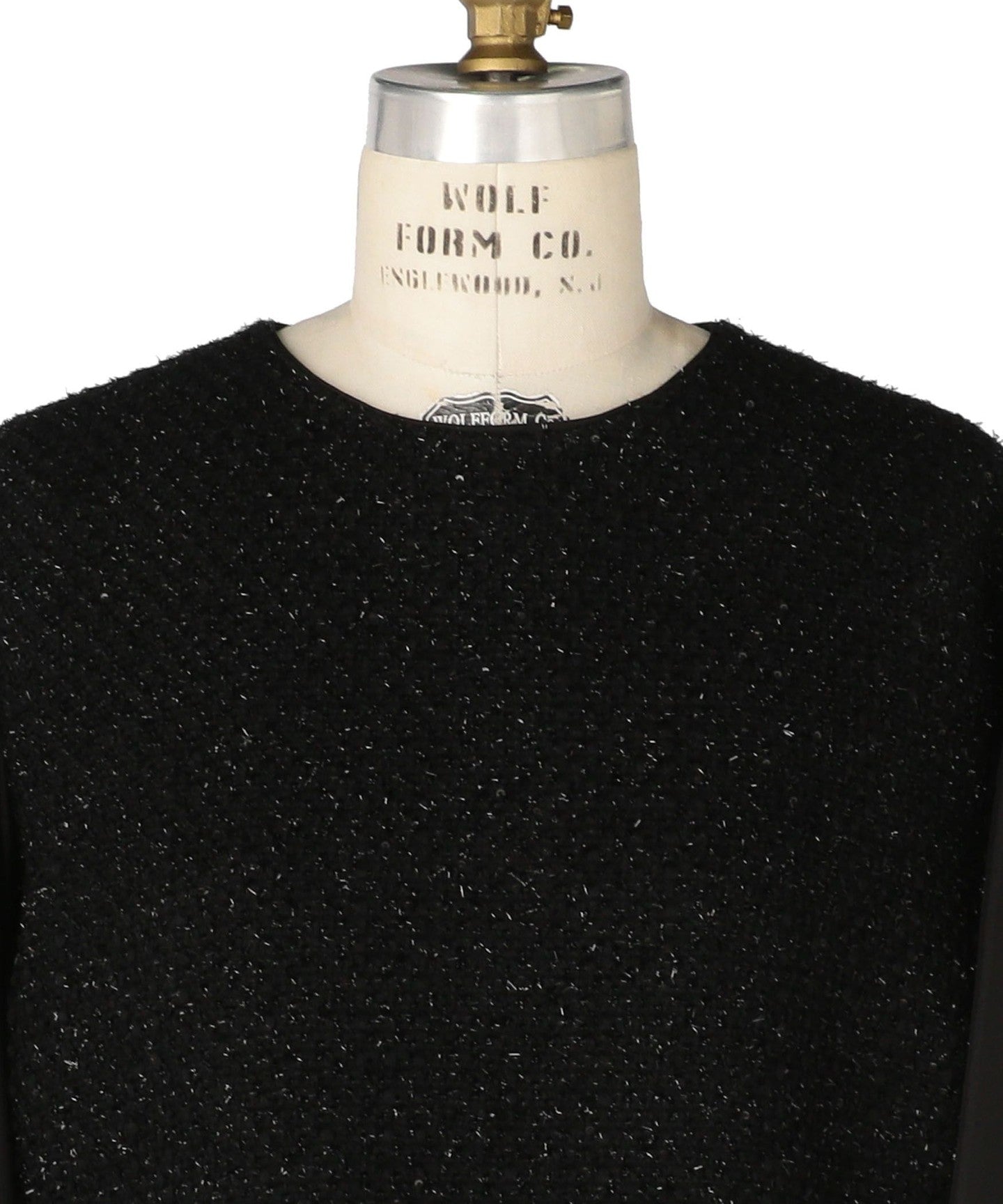 The body is made of gorgeous tweed fabric with slit threads and sequins, while the sleeves are made of silk twill fabric with a moderate sheen and texture.