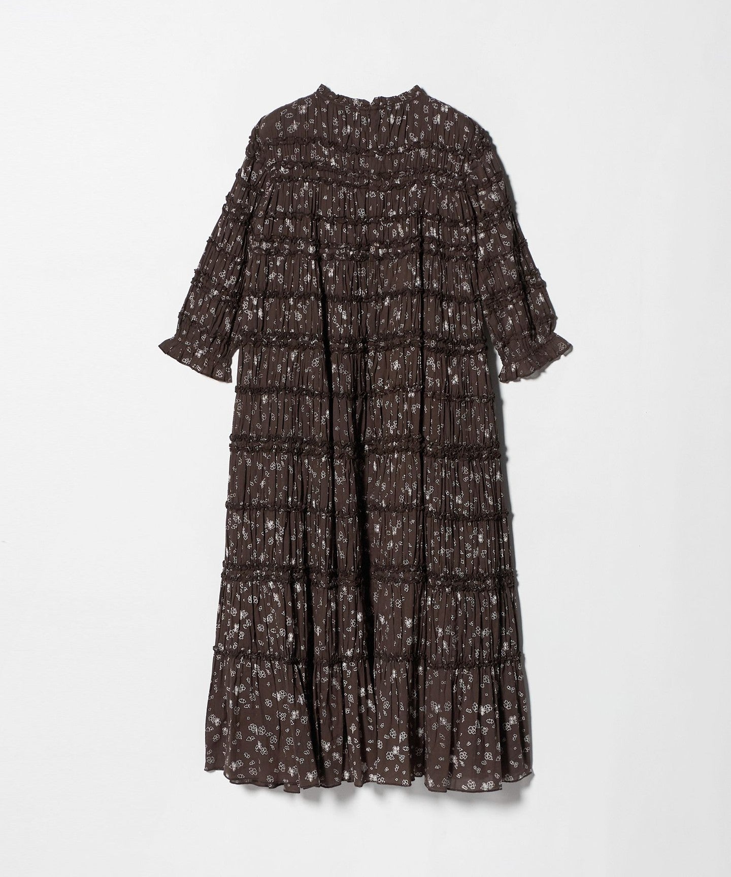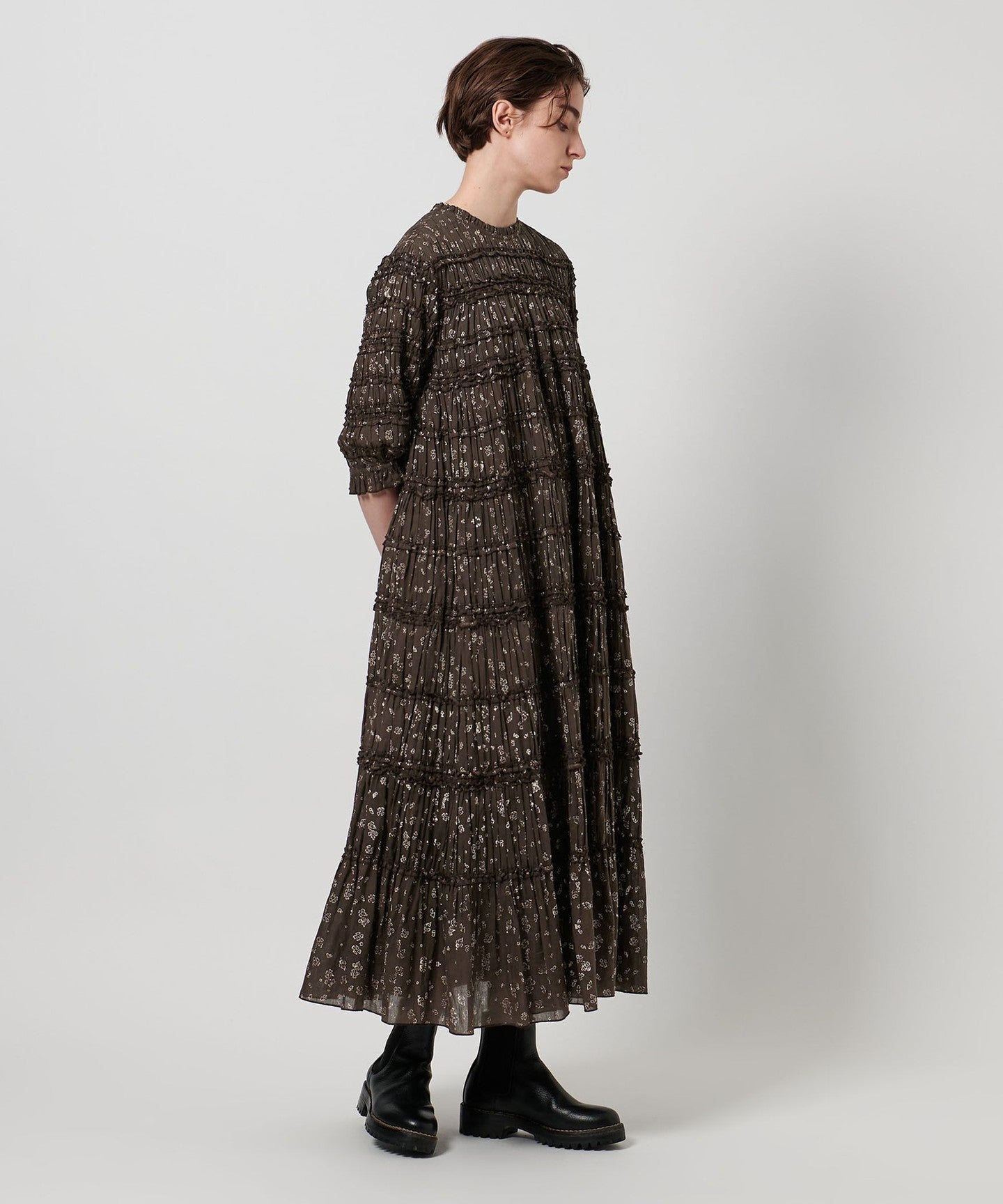 A long dress with a feminine silhouette created by gathered volume and an eye-catching print pattern.