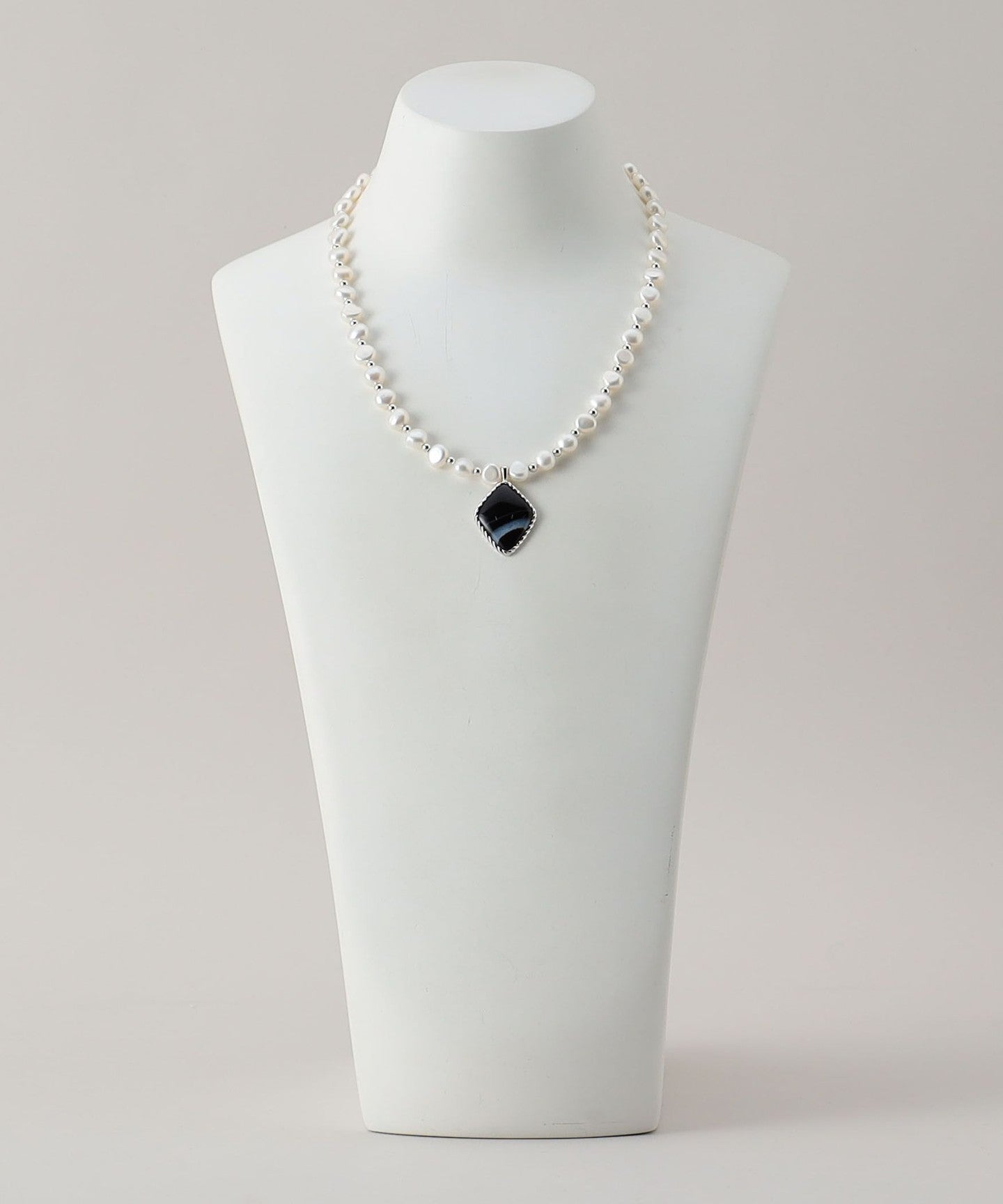 This necklace features a black striped agate pendant top and baroque pearls. Each top is individually carved from a rough stone using traditional gemstone carving techniques, making it a truly special piece. It adds a rich presence to your chest and stylishly accentuates your outfit.