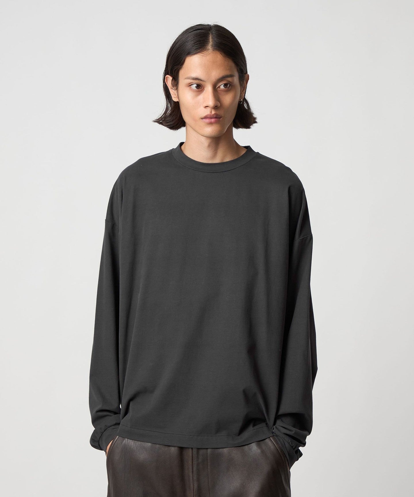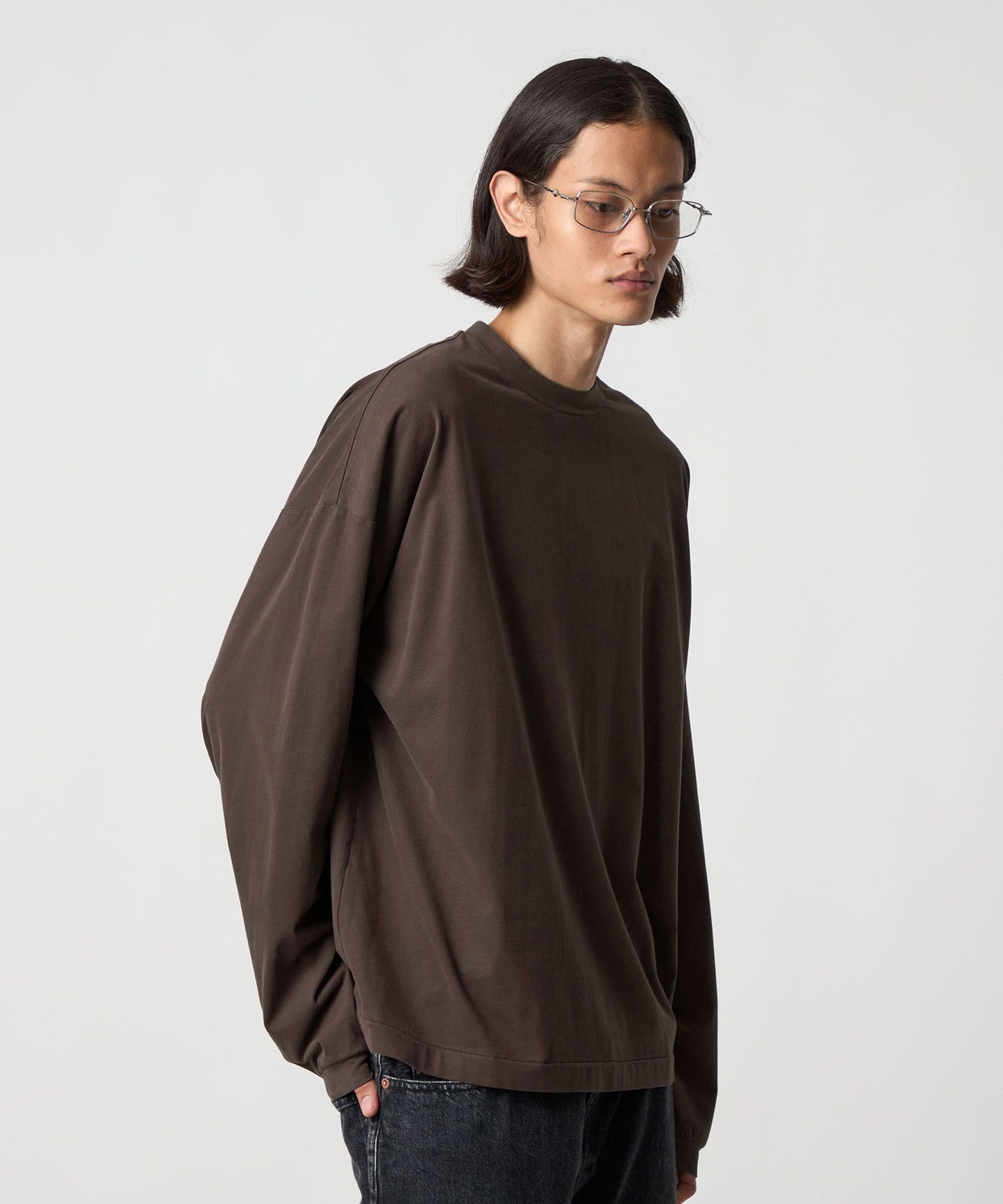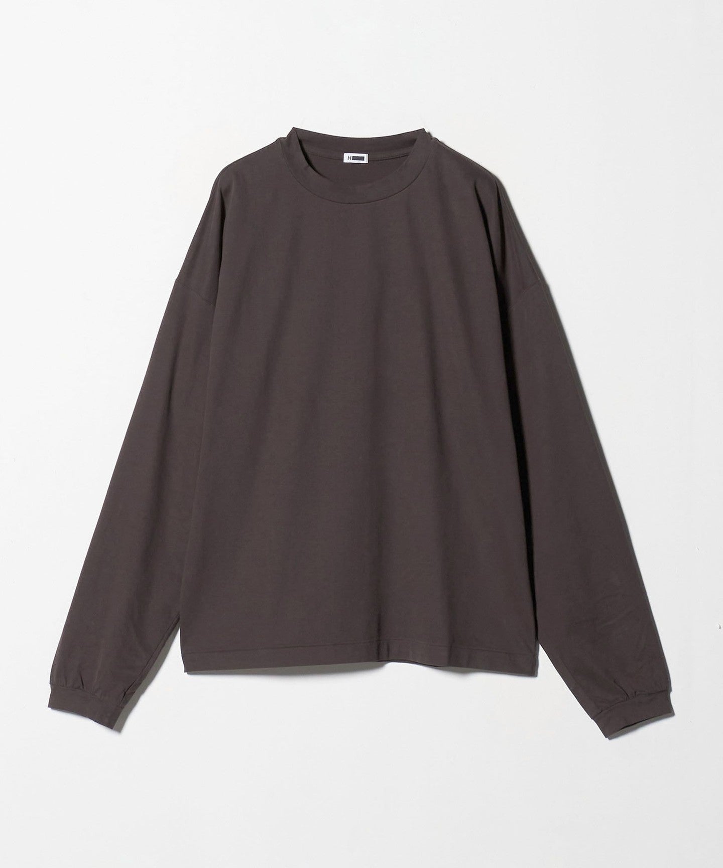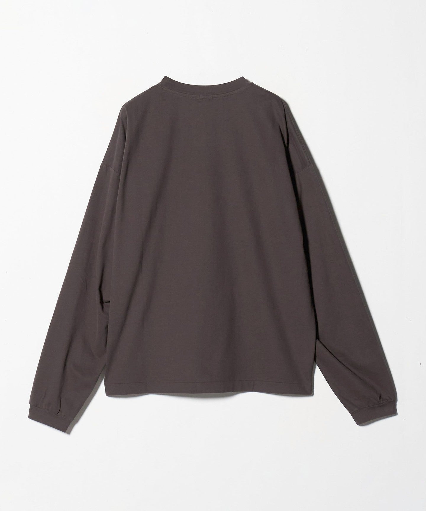 SLEEVE This long-sleeved cut-and-sew features tucked curved sleeves and a smooth, suede-like texture. Cotton Raised on thread Wool It uses a special fabric that has been treated with platinum veil processing. FABRIC The fabric is not too thin, giving it a comfortable feel. The body is wide, with long sleeves and a slightly shorter length, creating a natural silhouette with a tucked-in balance. The neck is made of the same fabric instead of a rib, giving it a clean and sophisticated look. EXTERIOR At first glance, it looks like a simple T SHIRT However, the tucks at the elbows create a unique silhouette, adding an accent that enhances the fashionable mood.