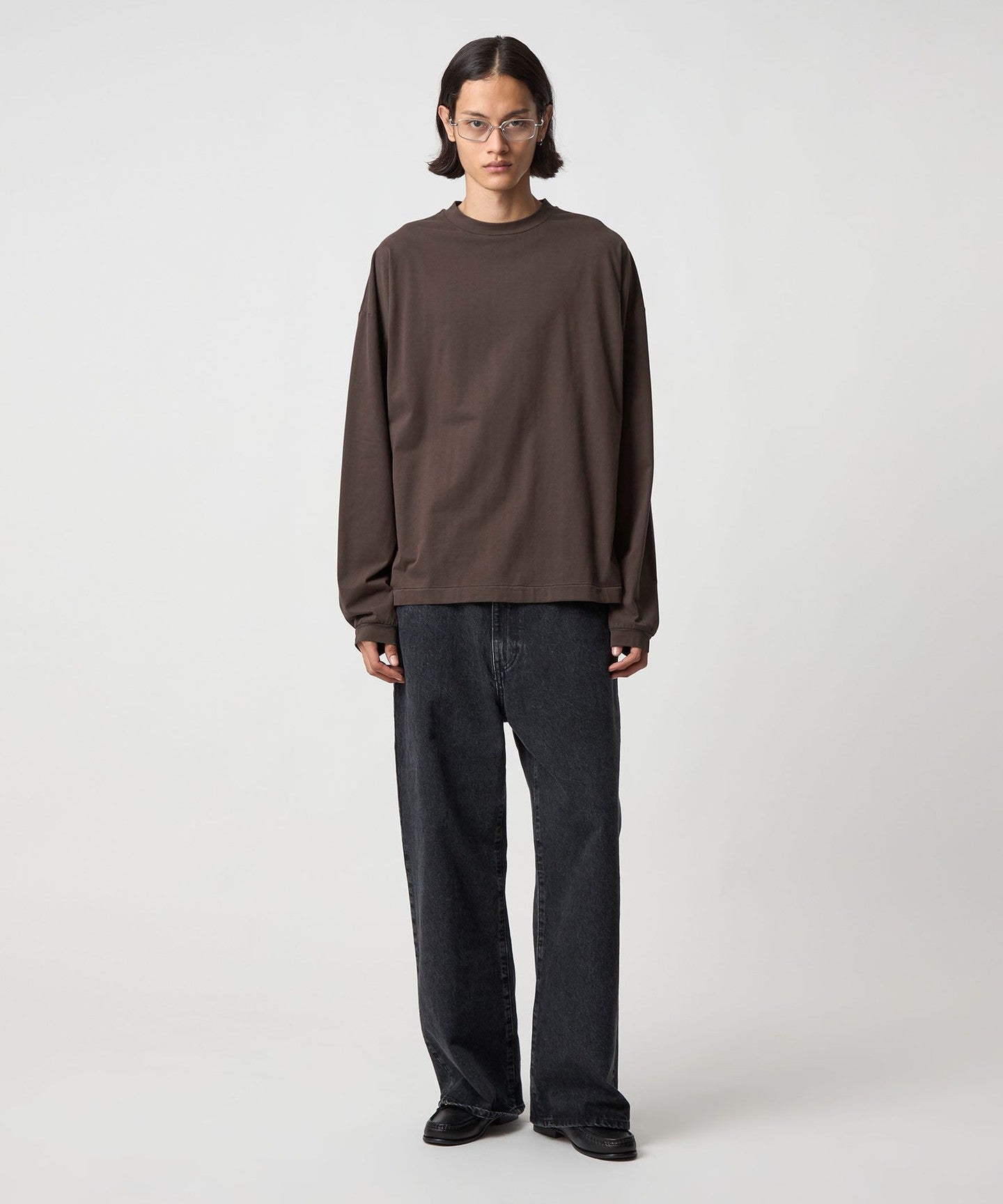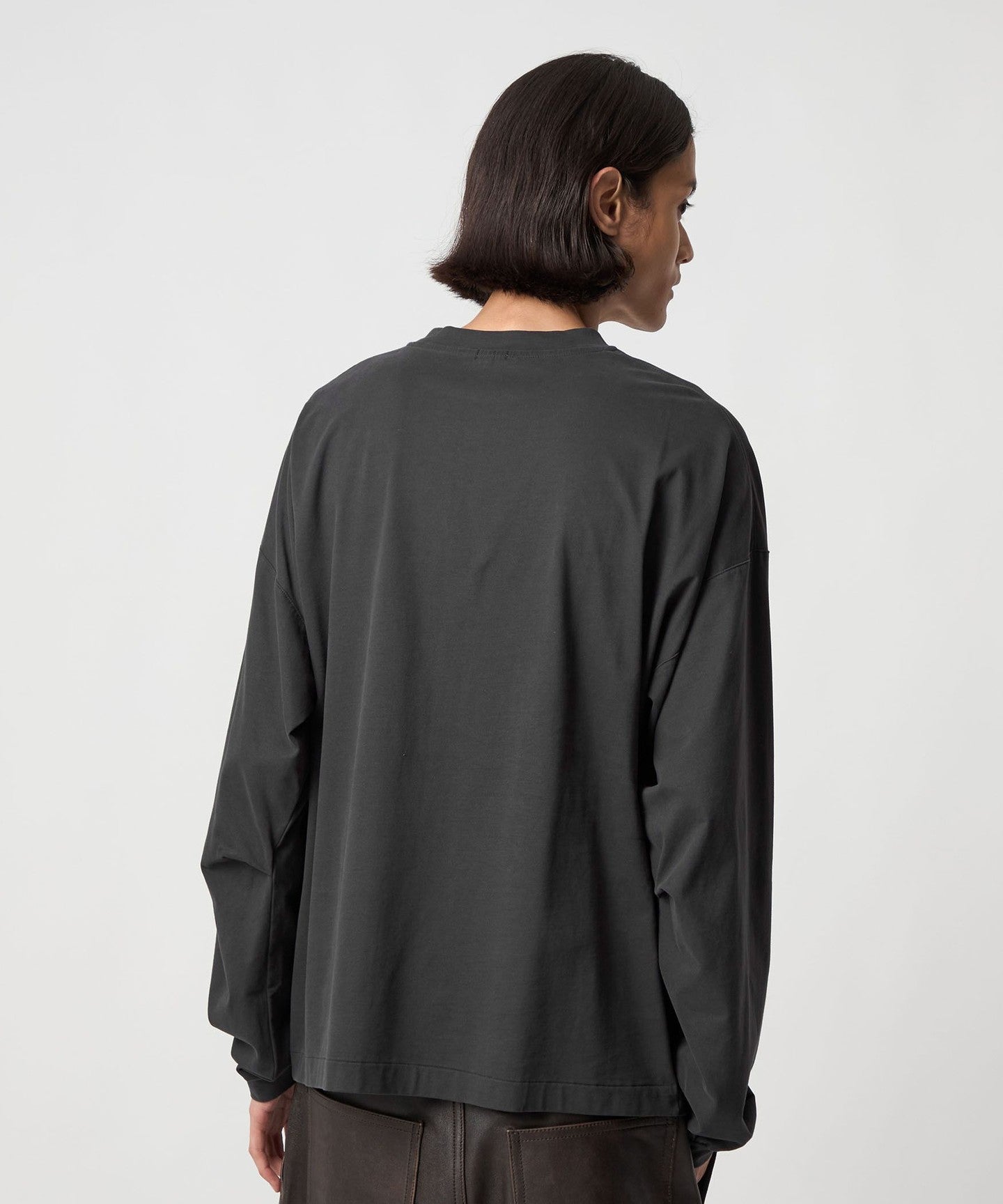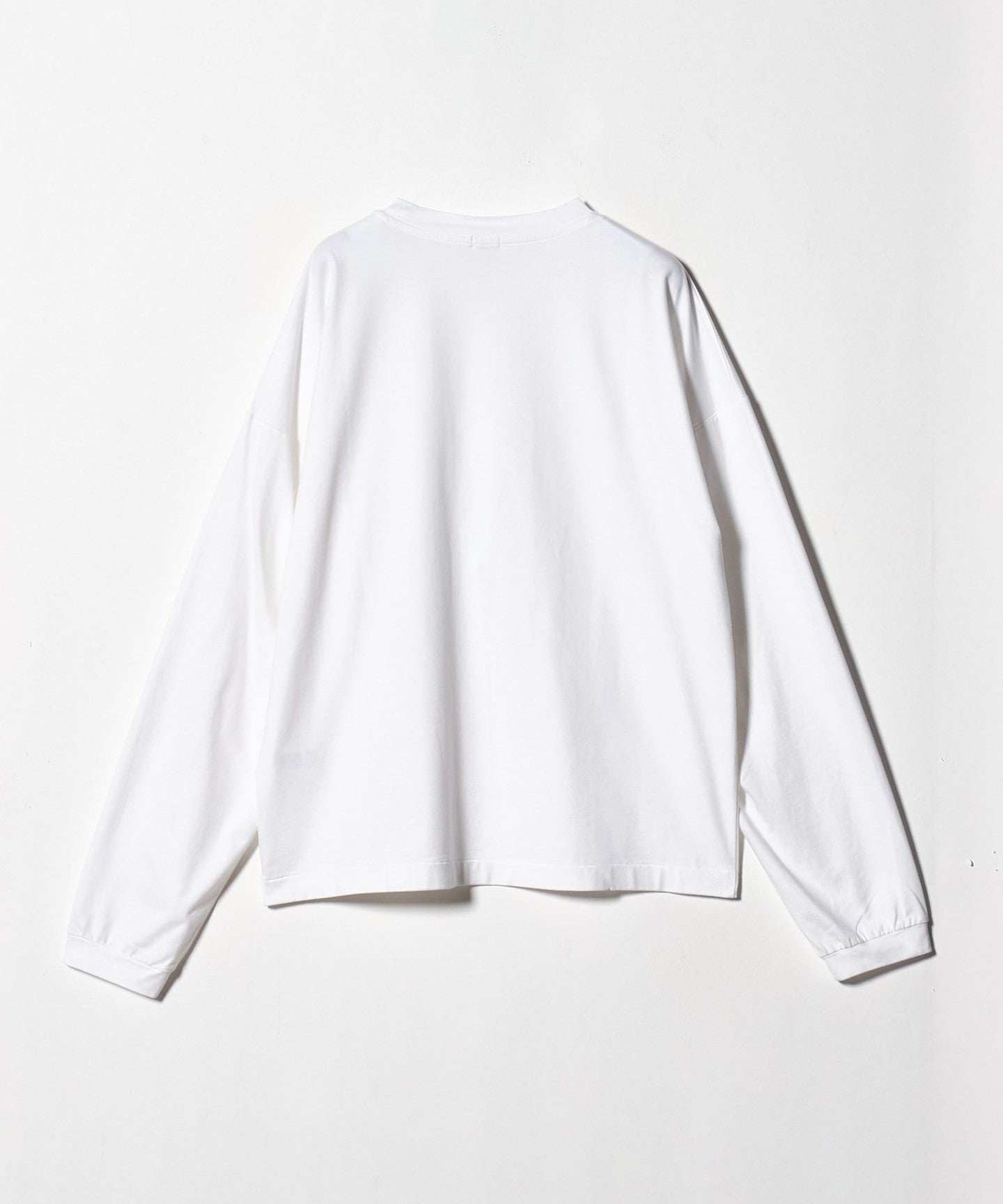 SLEEVE This long-sleeved cut-and-sew features tucked curved sleeves and a smooth, suede-like texture. Cotton Raised on thread Wool It uses a special fabric that has been treated with platinum veil processing. FABRIC The fabric is not too thin, giving it a comfortable feel. The body is wide, with long sleeves and a slightly shorter length, creating a natural silhouette with a tucked-in balance. The neck is made of the same fabric instead of a rib, giving it a clean and sophisticated look. EXTERIOR At first glance, it looks like a simple T SHIRT However, the tucks at the elbows create a unique silhouette, adding an accent that enhances the fashionable mood.