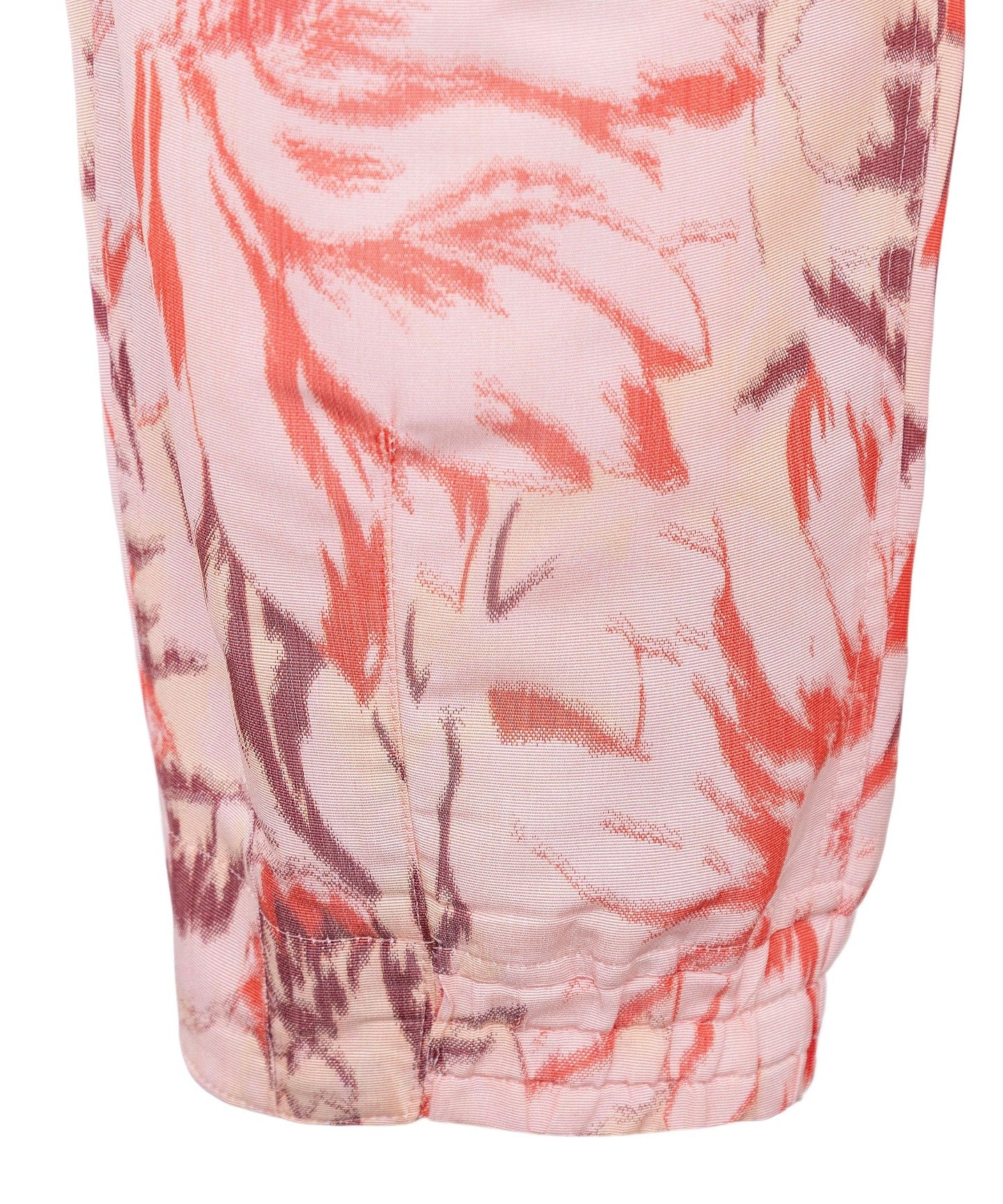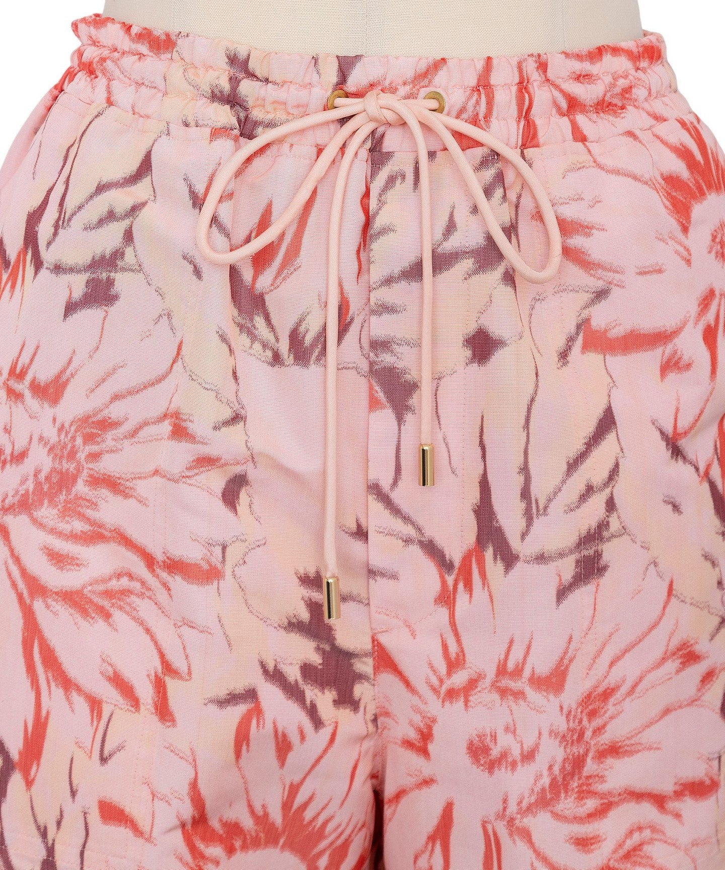 Waist draw pants with a gorgeous, eye-catching floral print in a kasuri style.