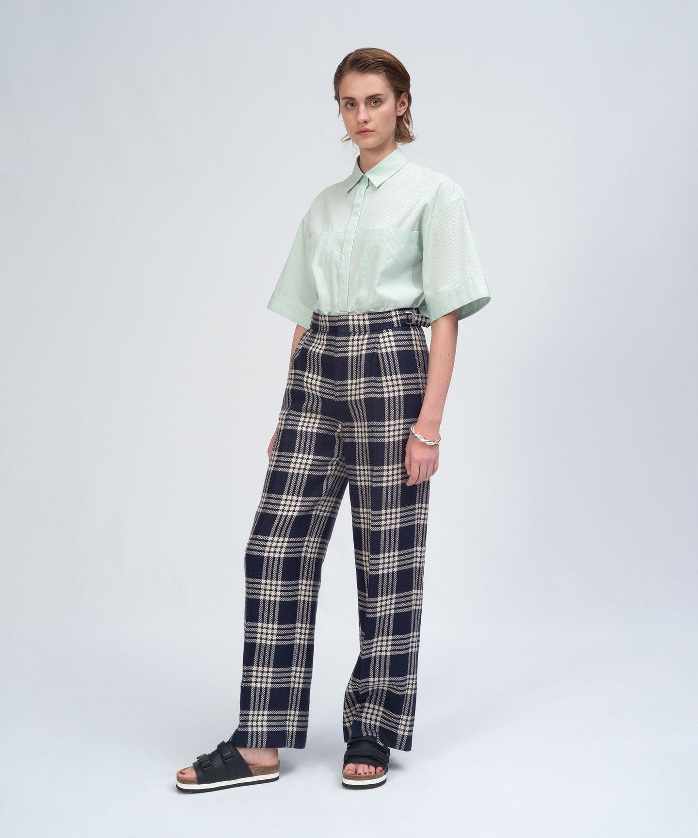 These pleated pants feature a striking check pattern made from lightweight material that will look great in the spring and summer seasons.