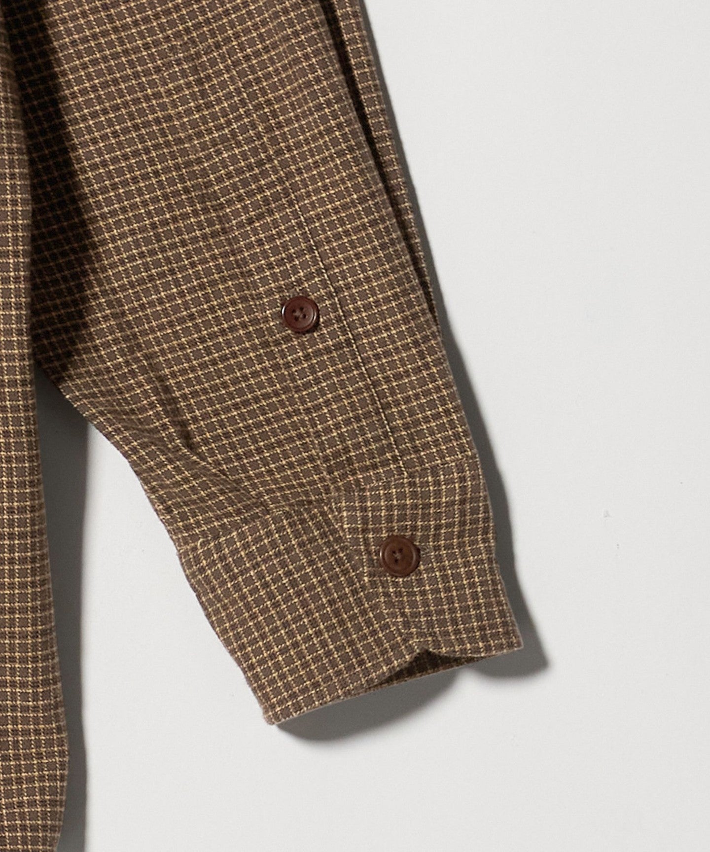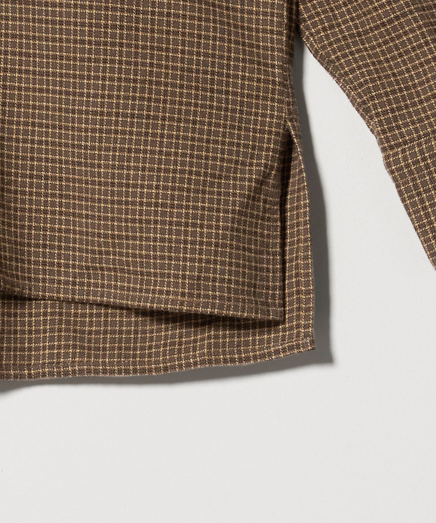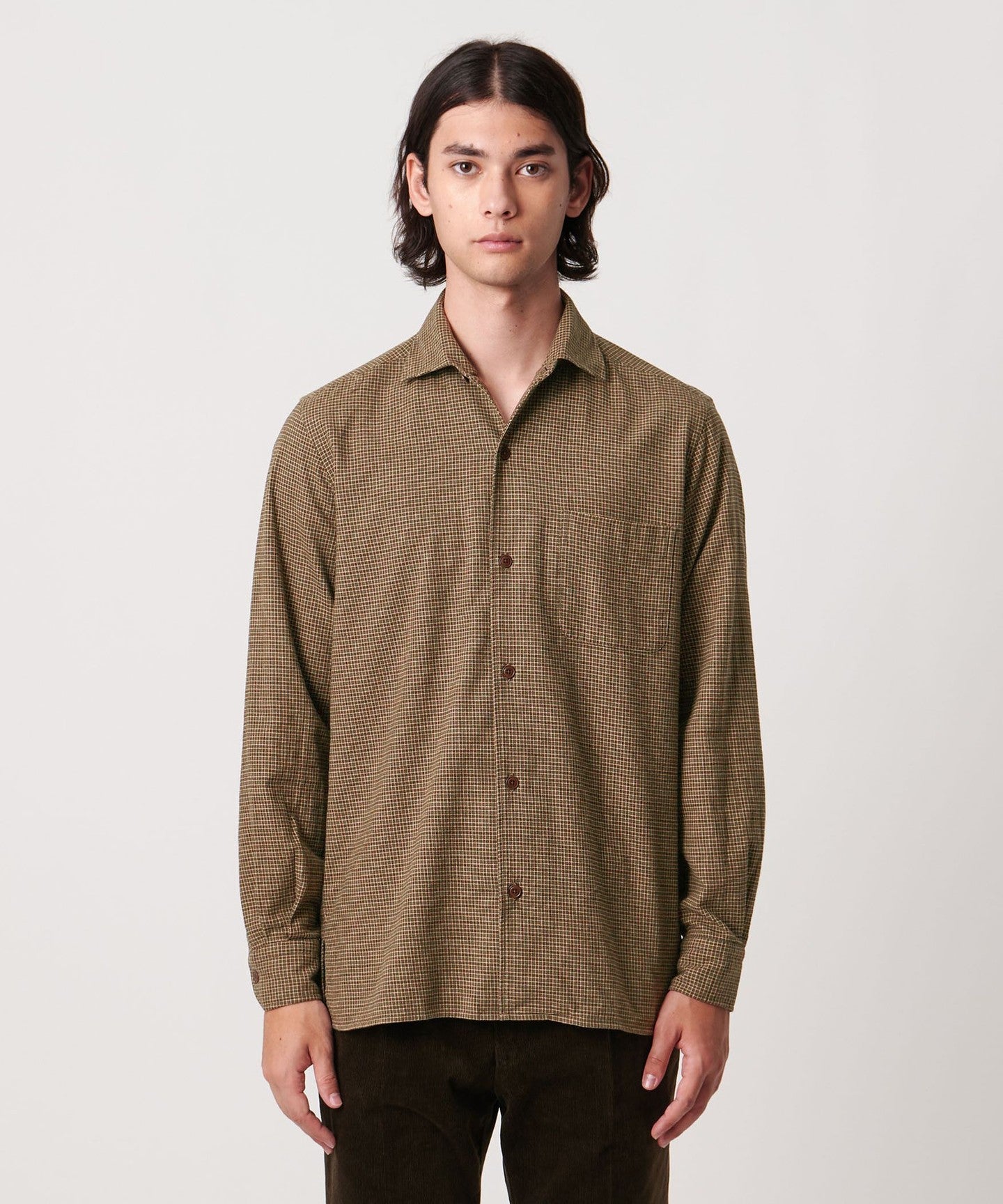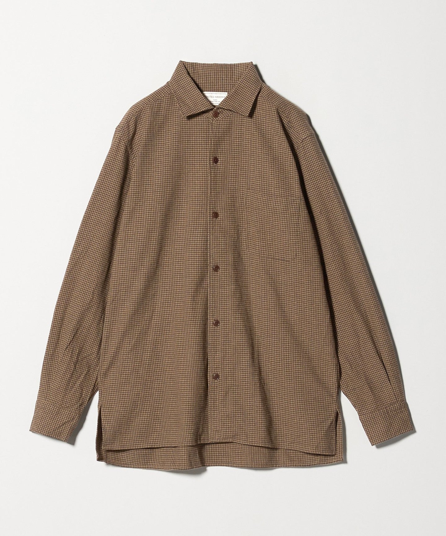 A check shirt featuring a soft one-piece collar and a square hem with a slightly deep slit.