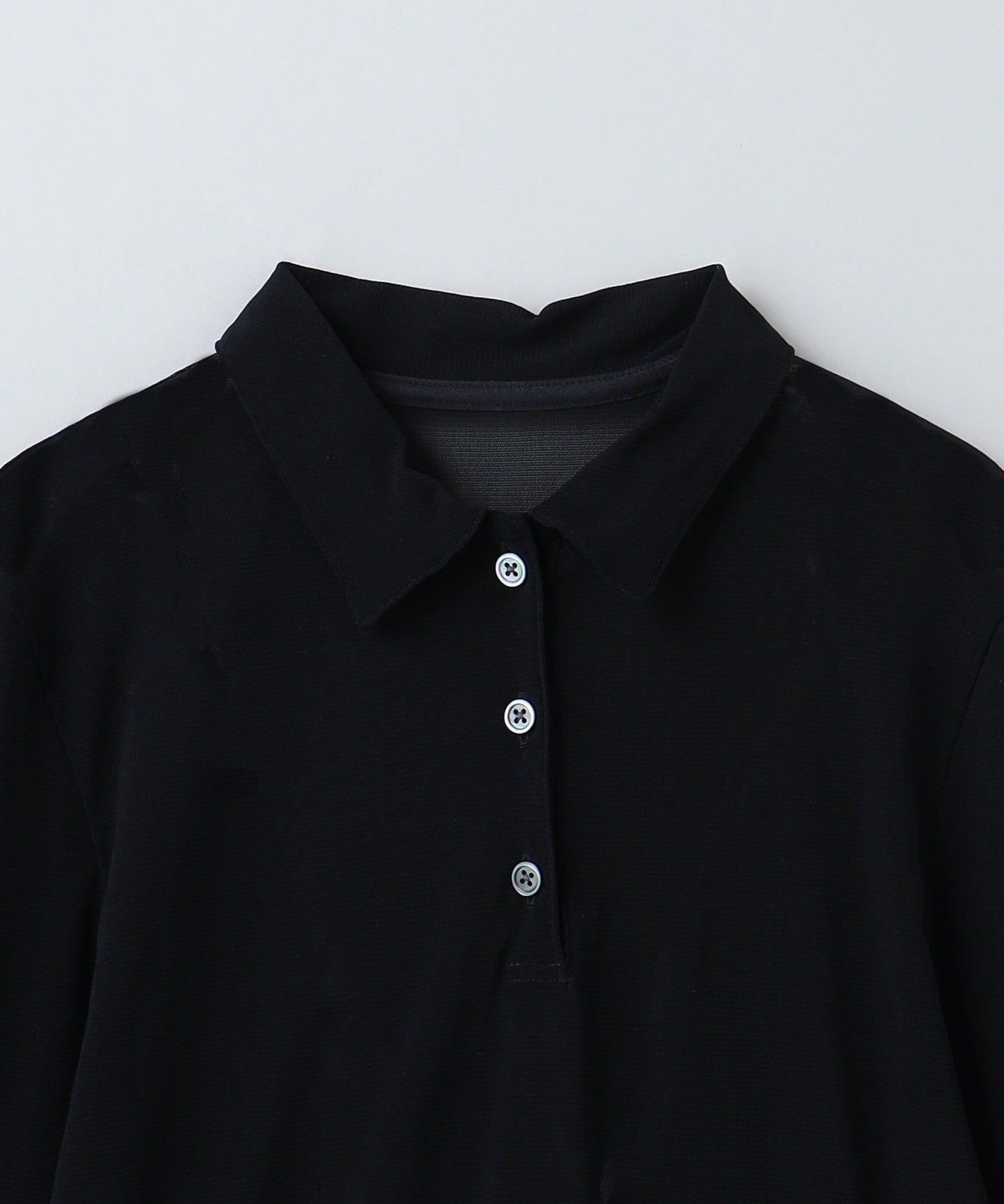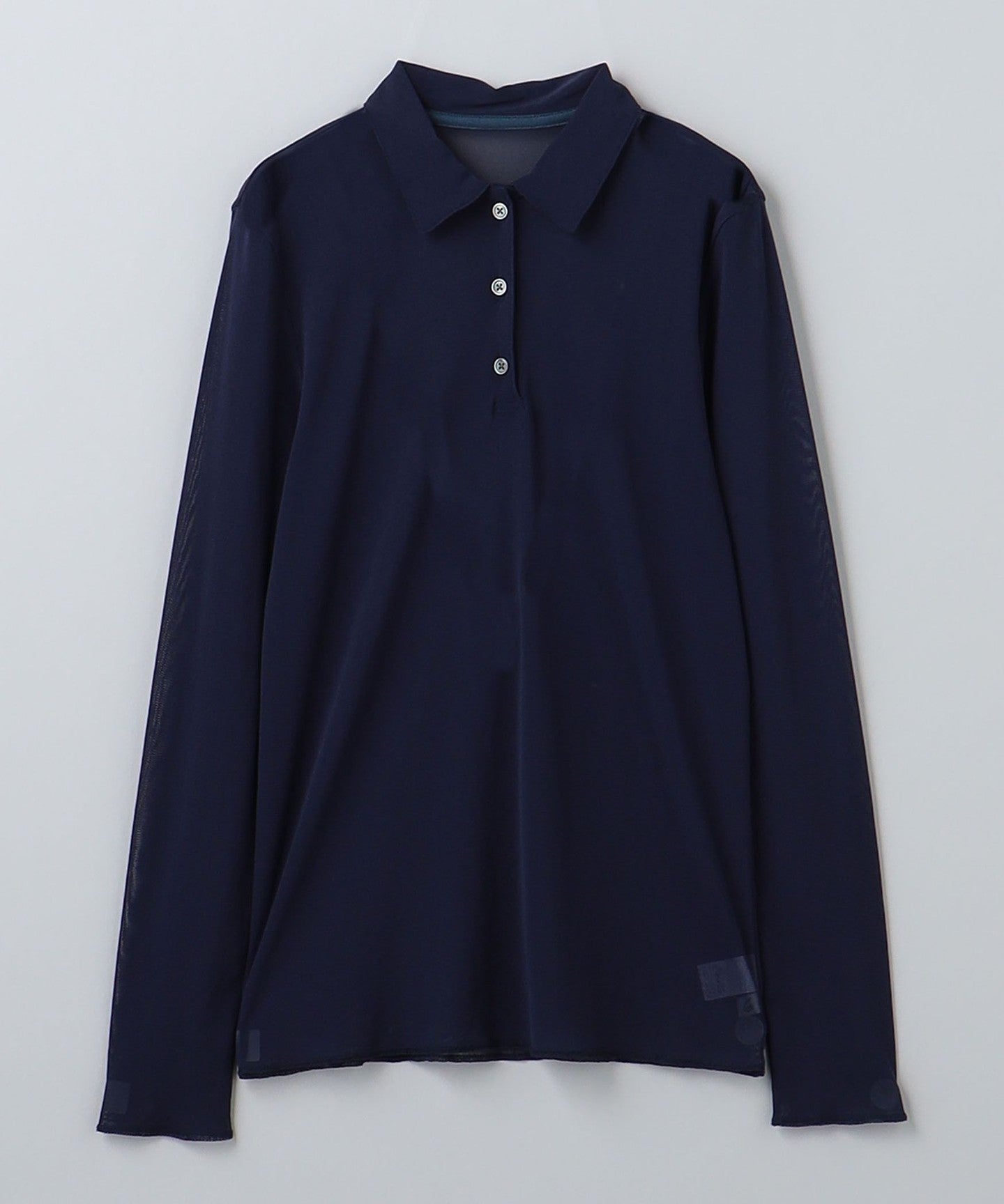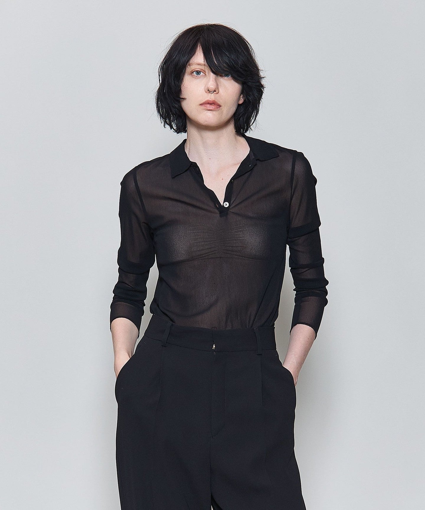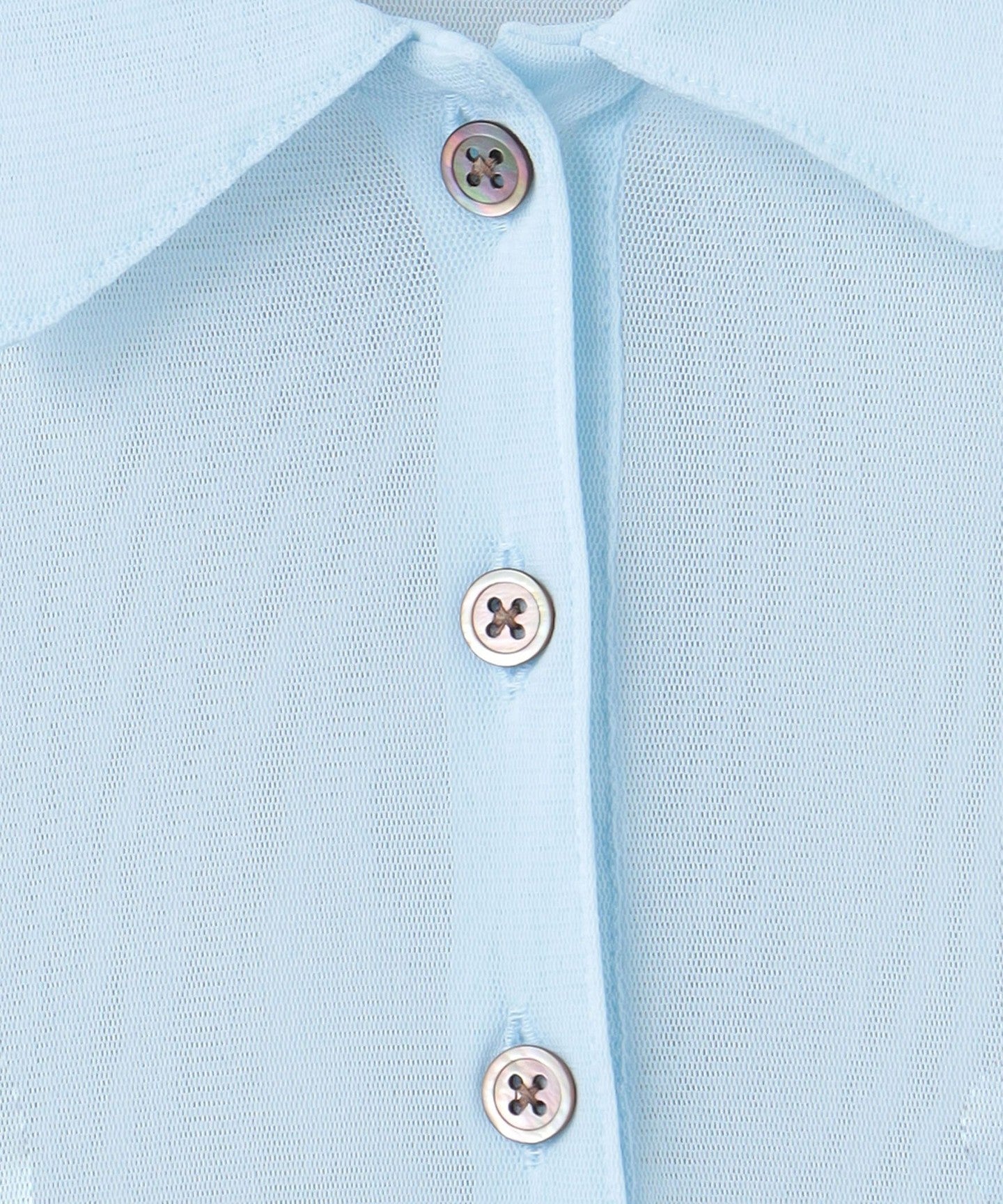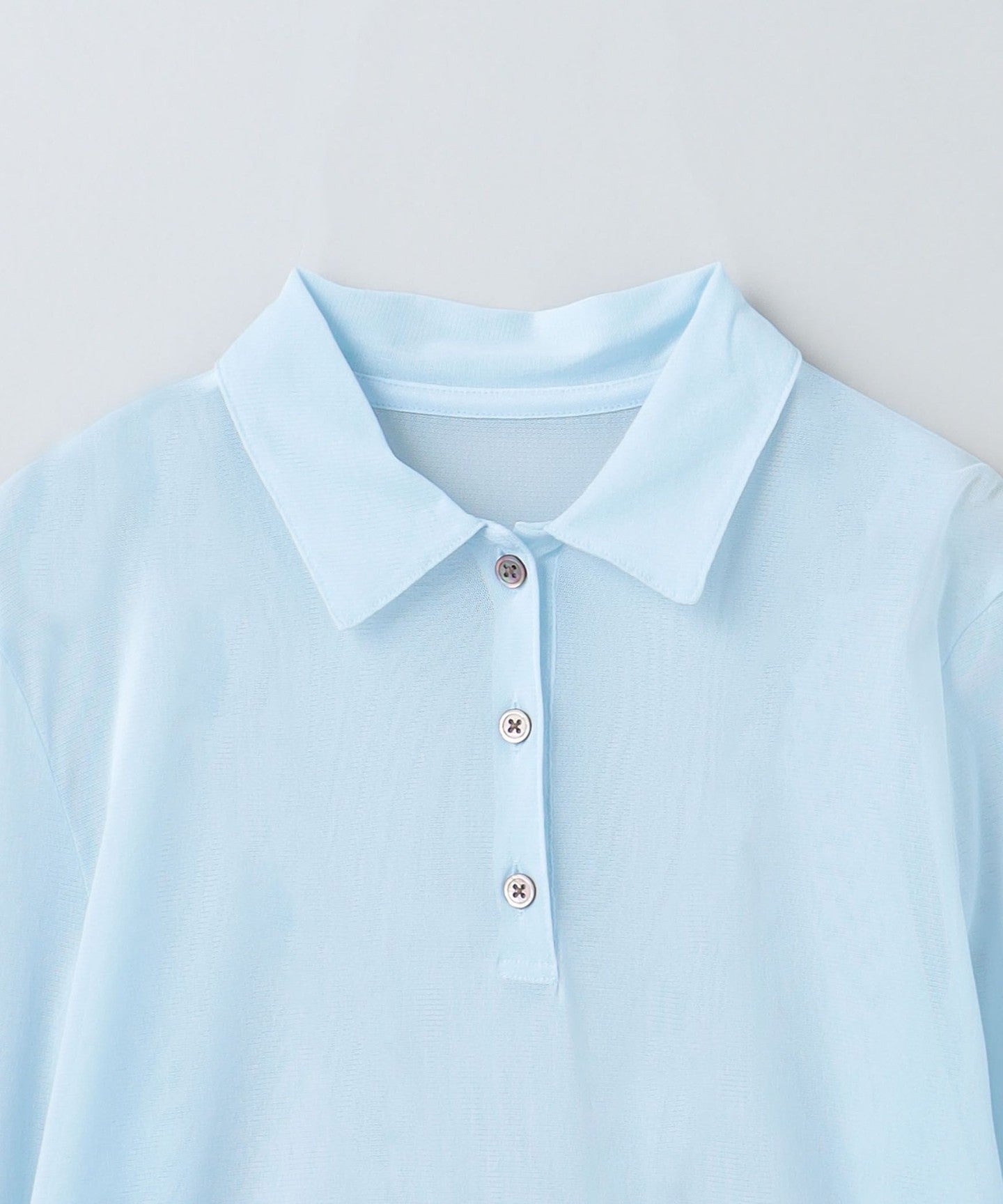 This polo shirt-style pullover top is made of sheer, transparent tulle material, giving it a light and airy feel.