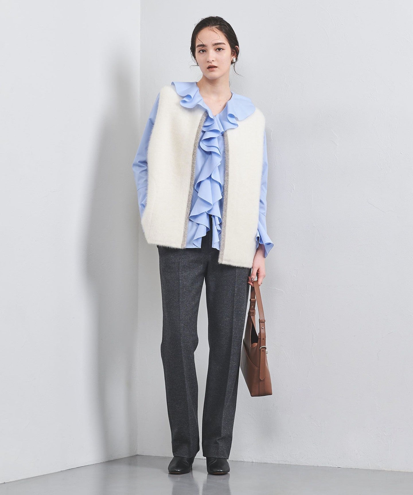 This product has a smooth, rich texture. Friction and static electricity during wear may cause lint to adhere to other layers of clothing. Avoid excessive friction, as this can lead to shedding. Furthermore, rubbing or crushing the surface of the fibers during wear can cause the lint to become distorted and pill. This is an unavoidable phenomenon due to the nature of the material, and it cannot be completely prevented. If lint adheres to innerwear, etc., remove it with a clothing brush designed for the material. If pilling occurs, do not try to remove it by pulling it out; instead, brush it or remove it with small scissors. Pilling will be more noticeable when worn with long-pile materials or contrasting colors, so we recommend pairing it with smooth materials in the same color. To keep your garment looking beautiful, we recommend rotating it, for example, wearing it for one day and then resting it for two days.