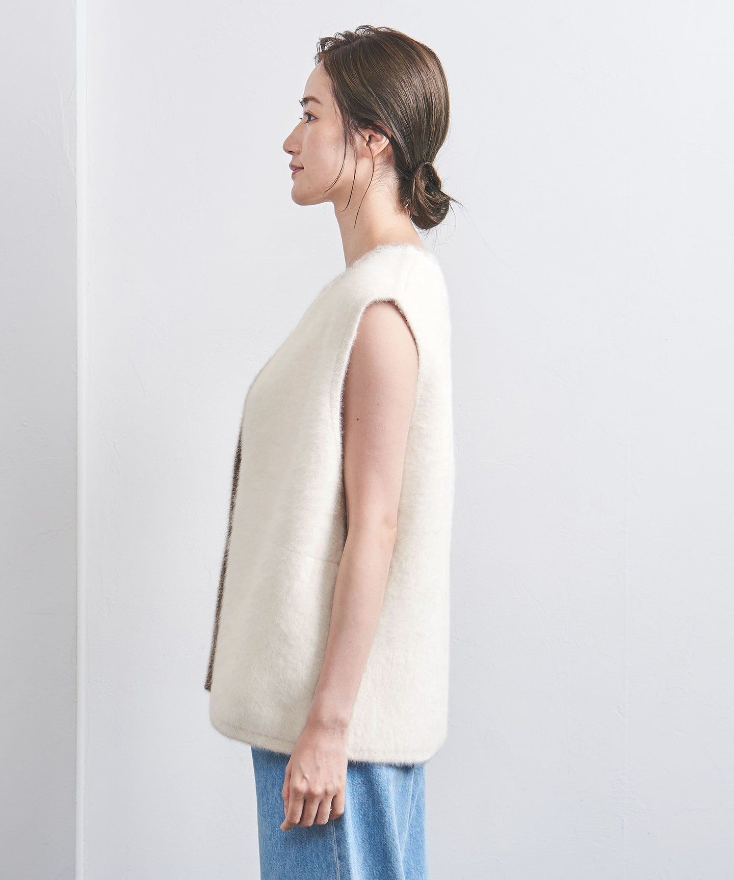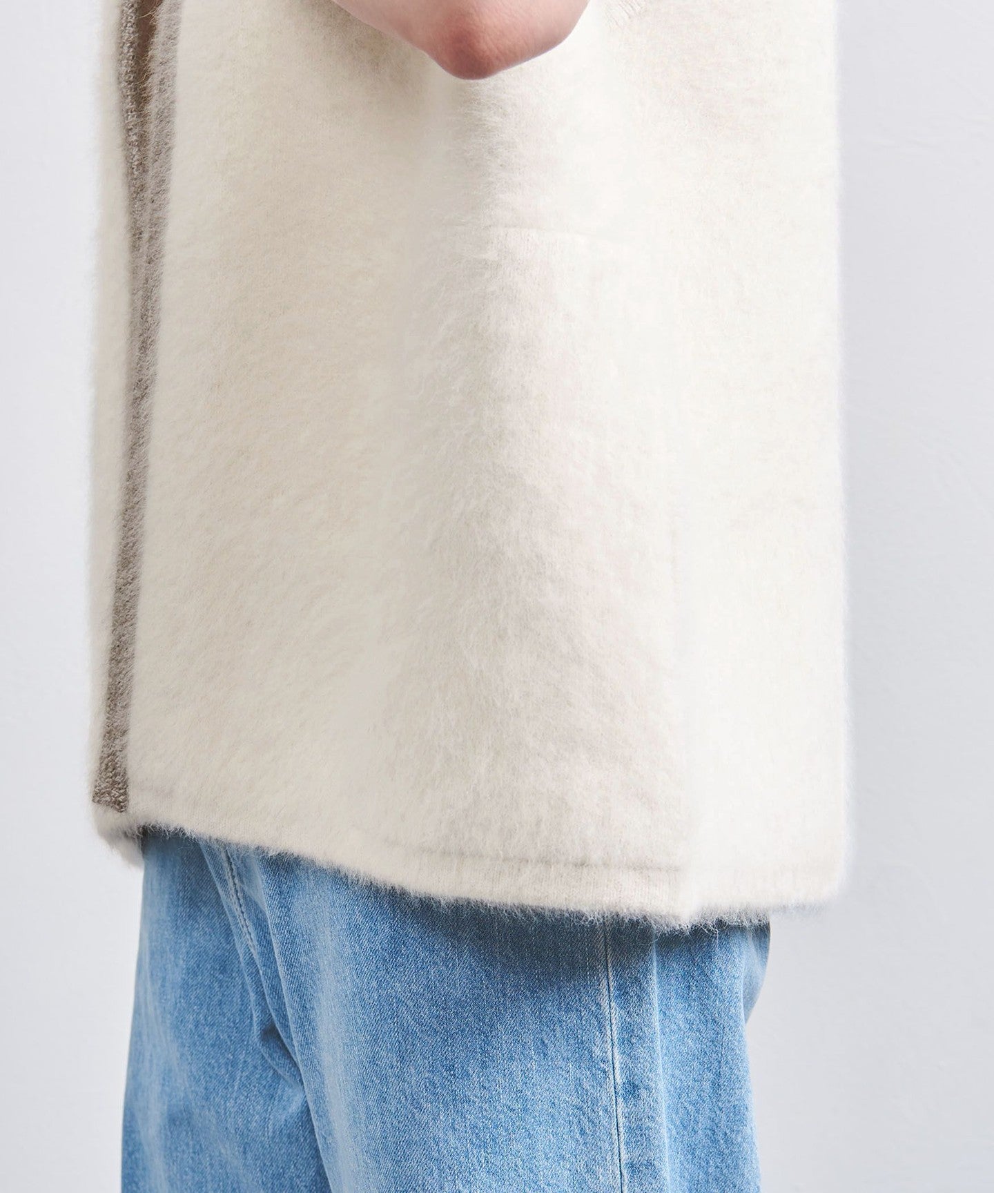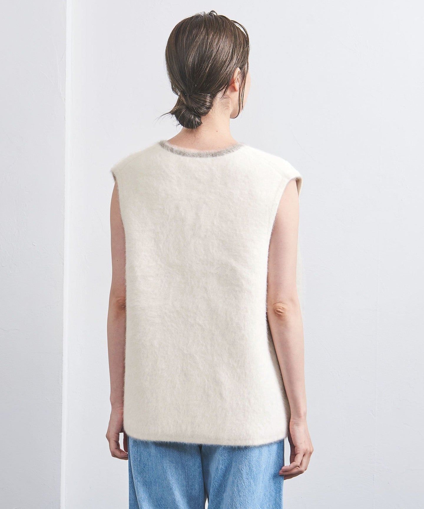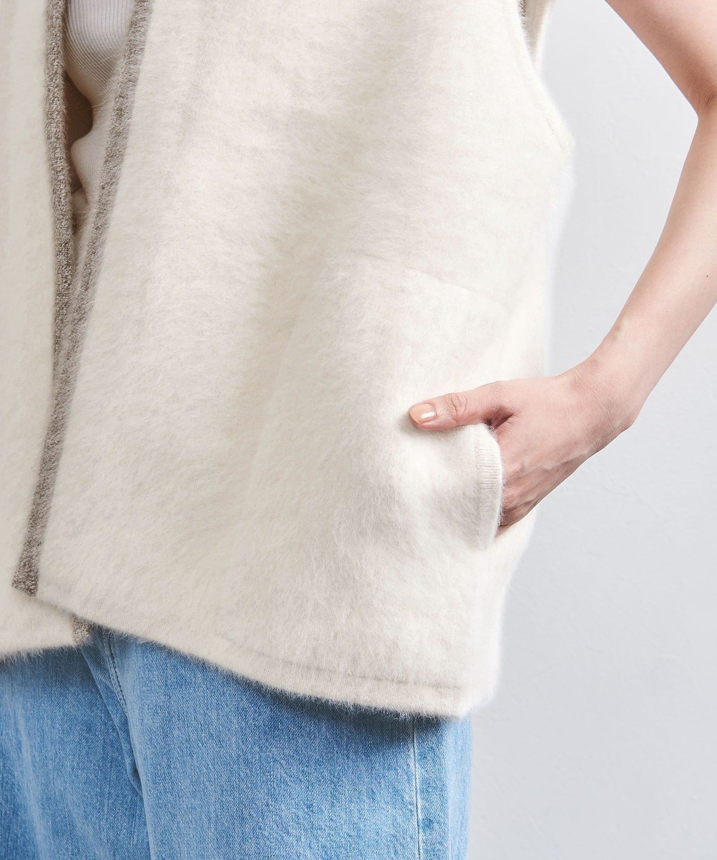 A knit vest with an attractive fluffy texture.