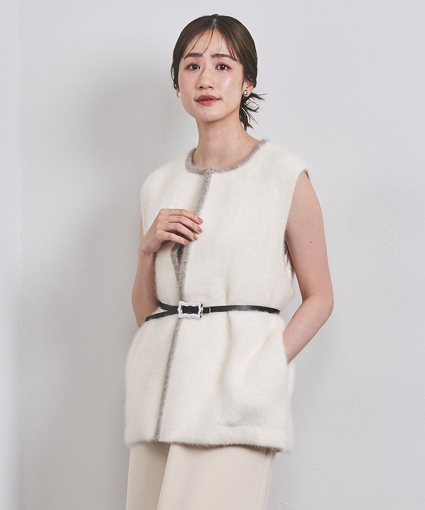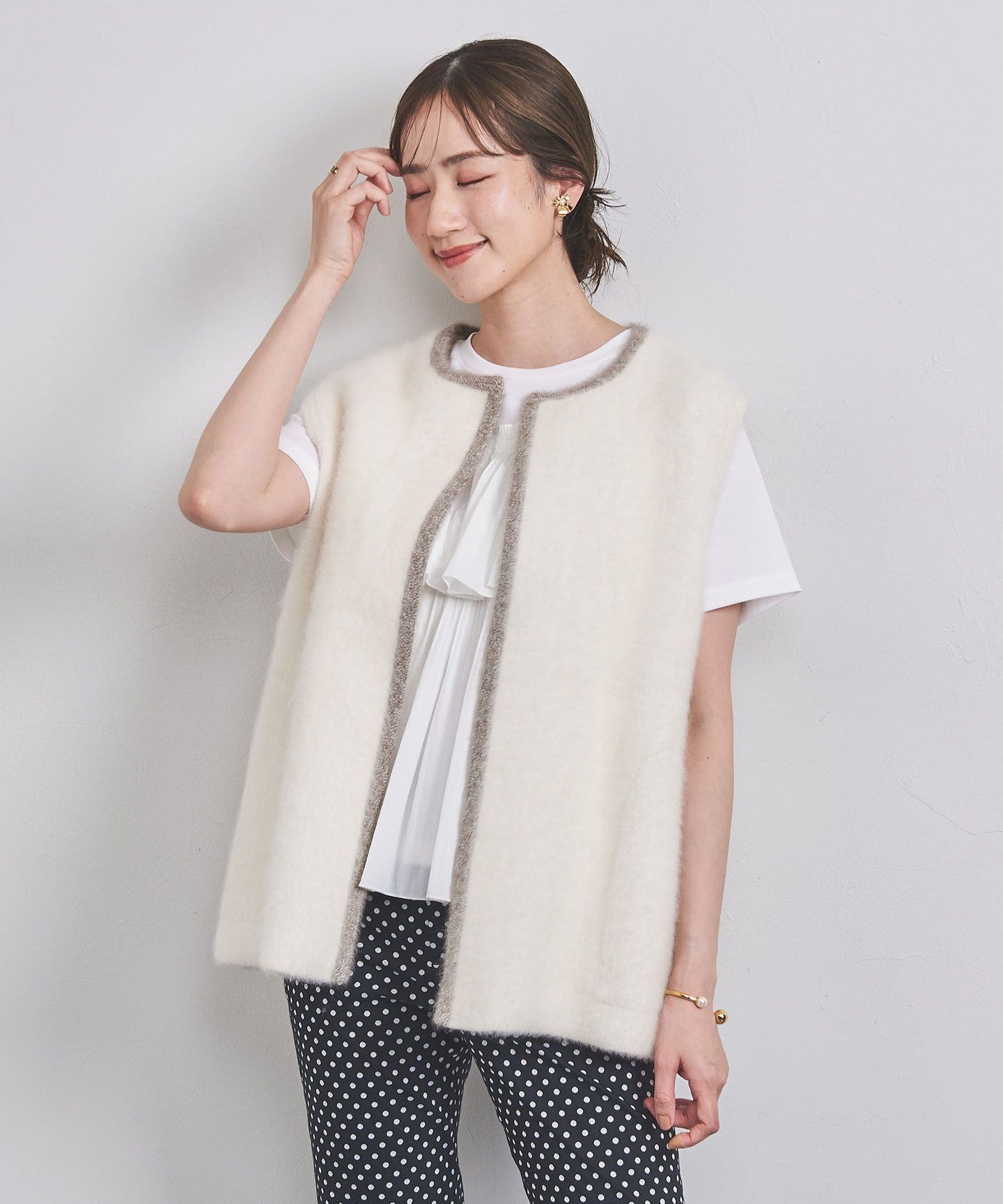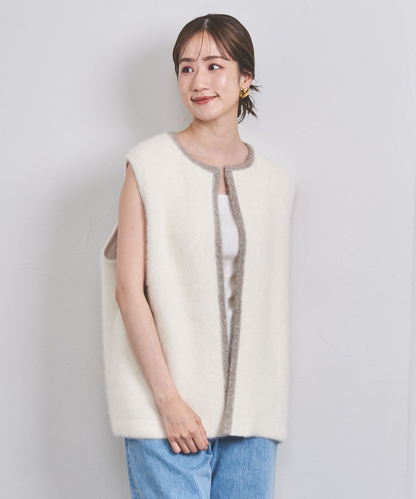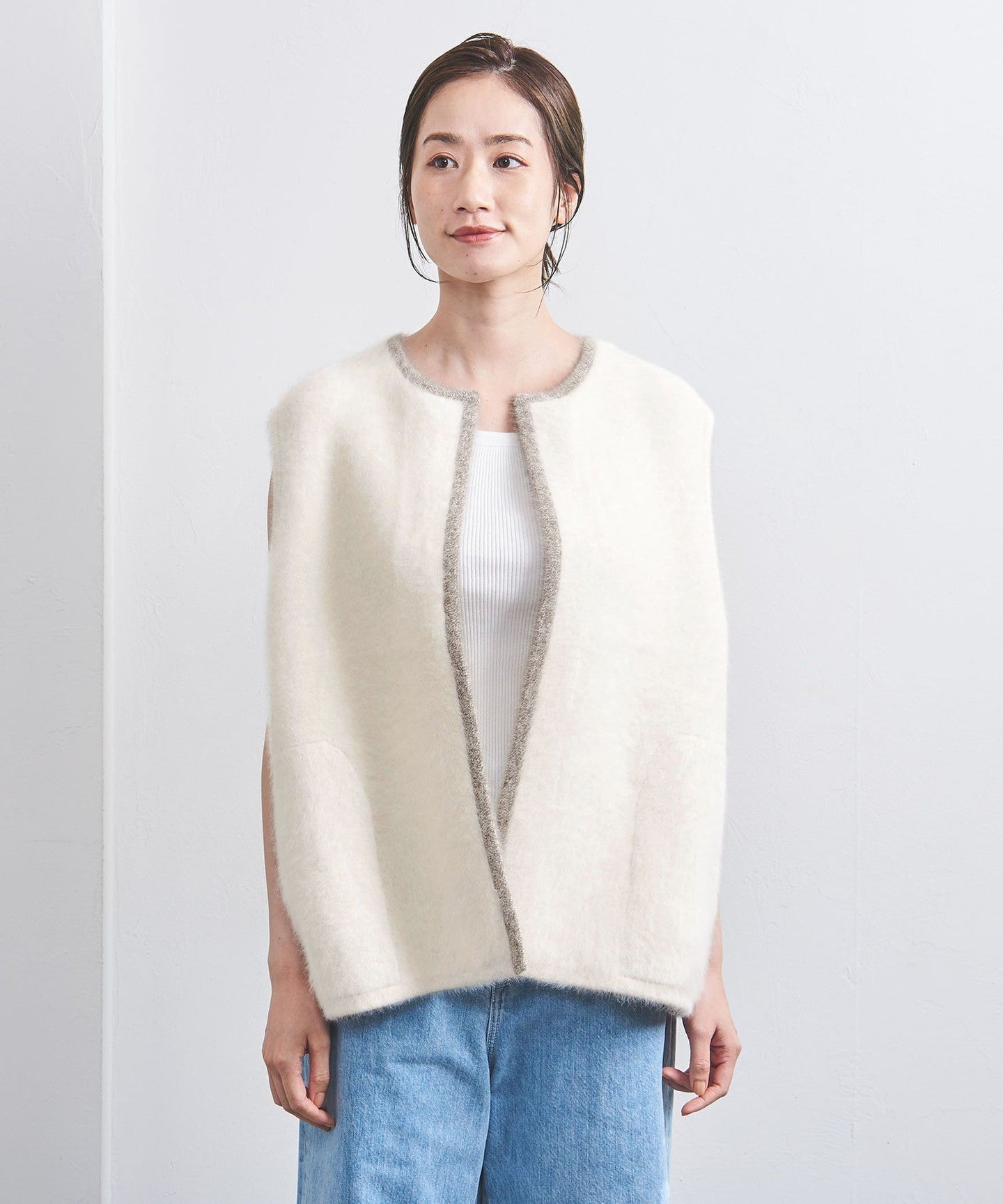 A knit vest with an attractive fluffy texture.