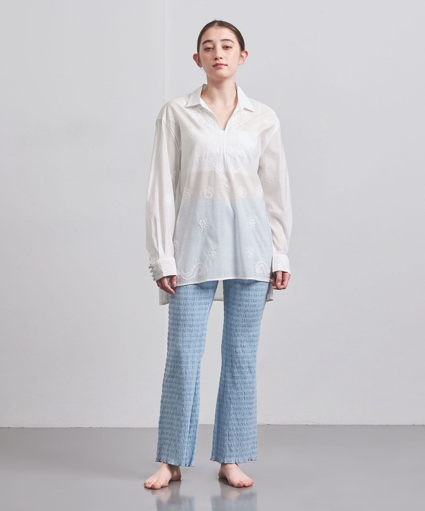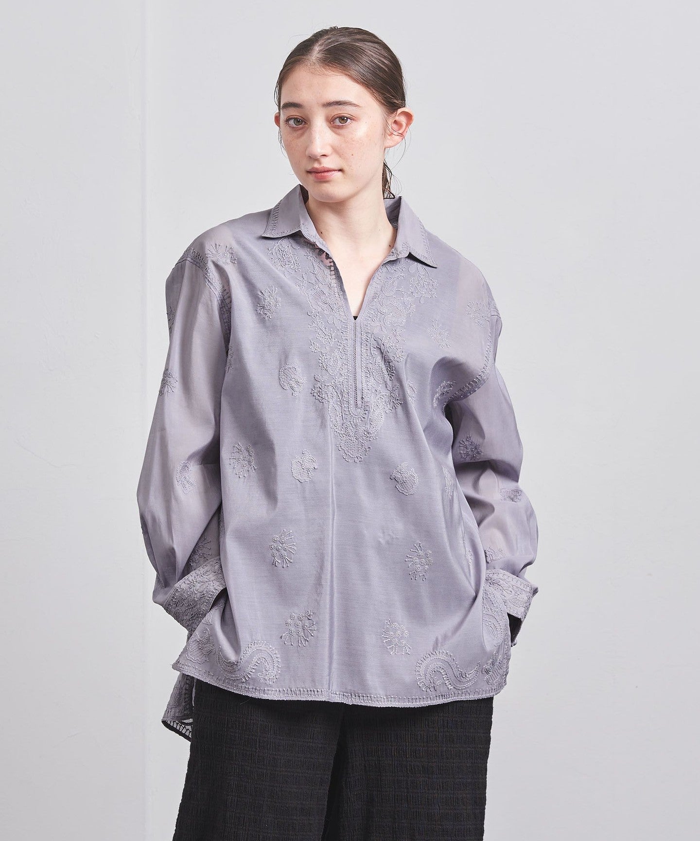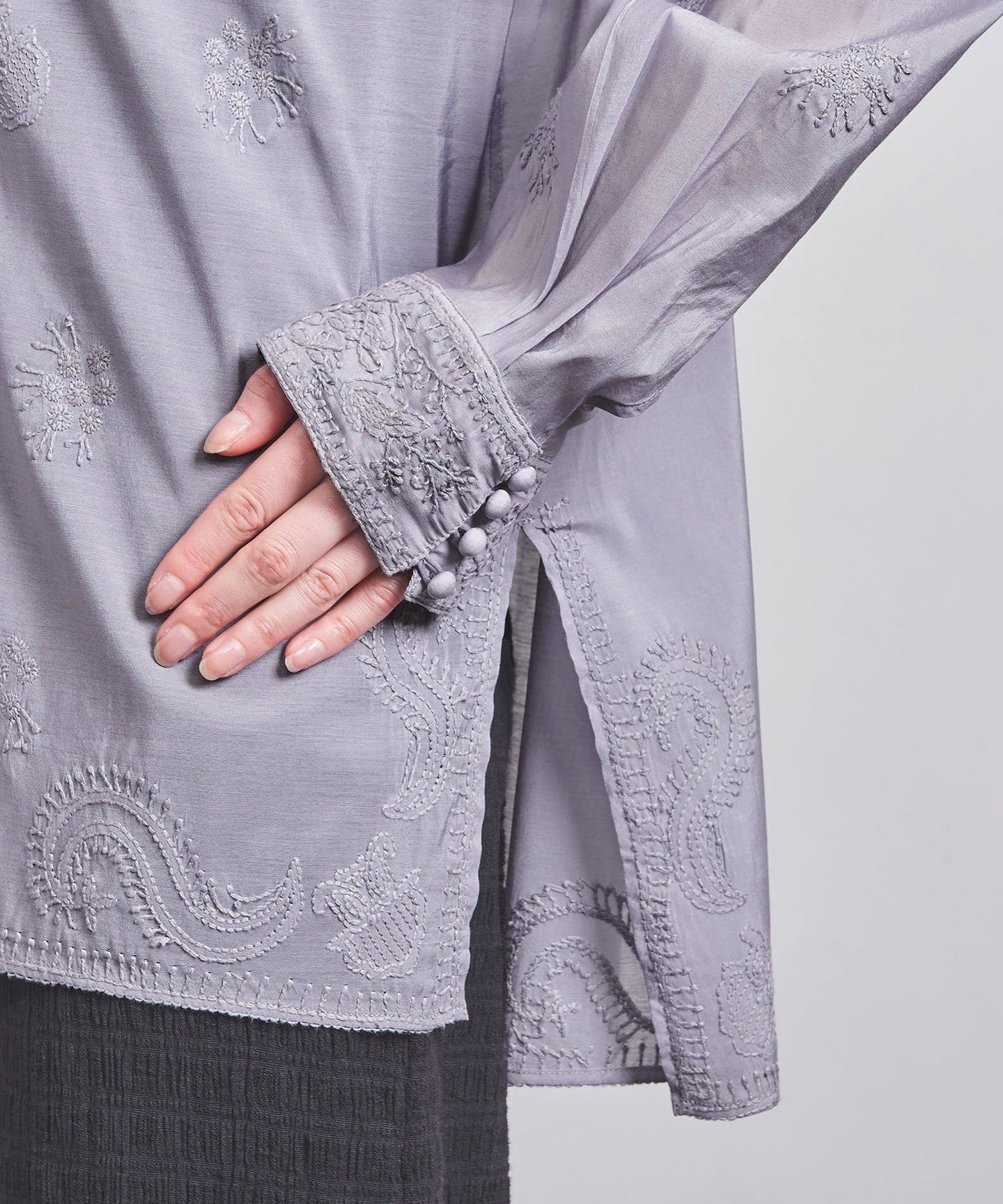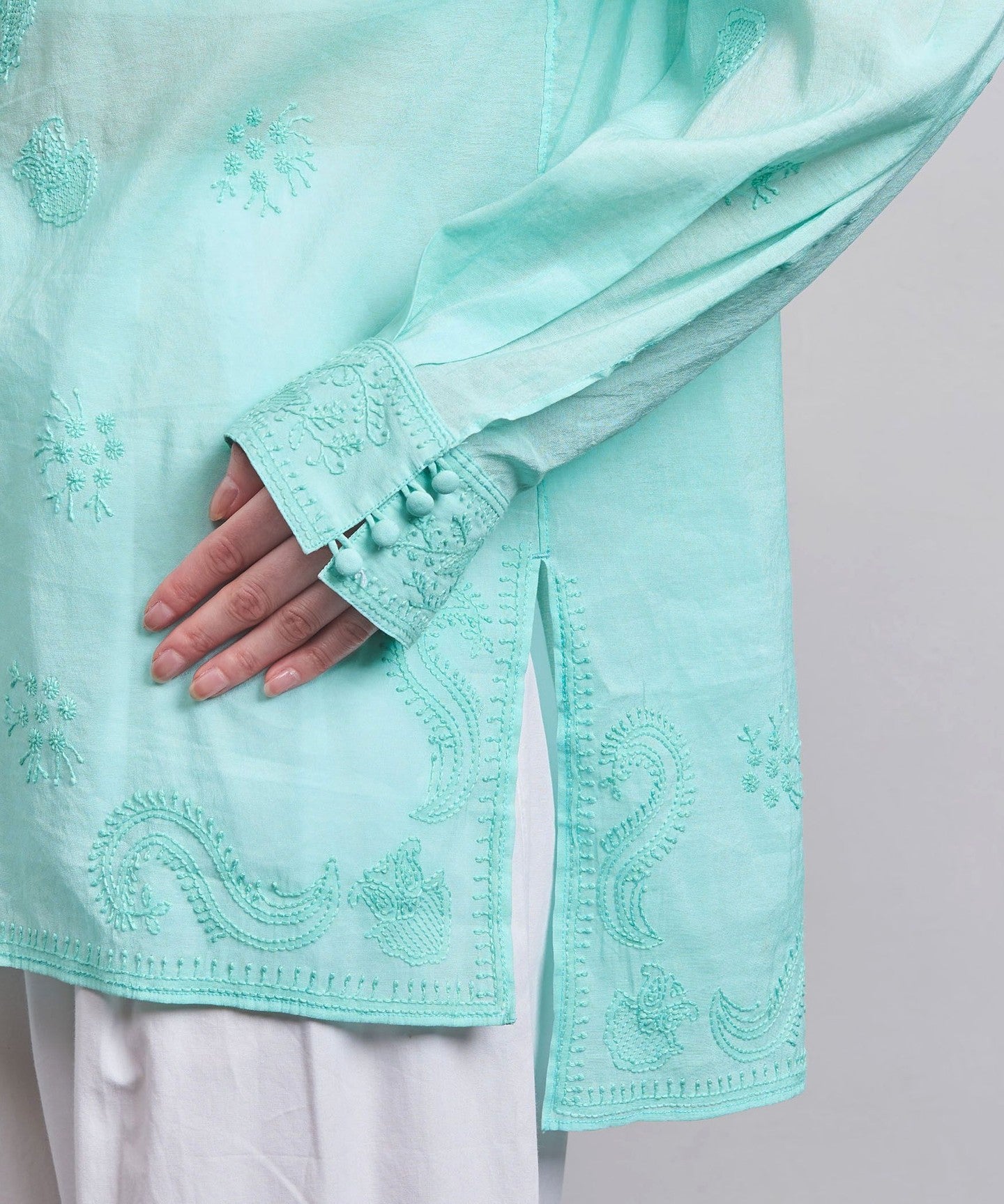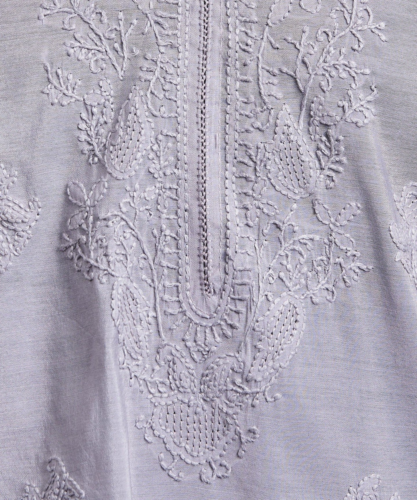 The embroidery is a delicate and artistic technique called "Chikankari," which is made entirely by hand using needles and threads, from mesh-like parts to thick, ball-like parts.