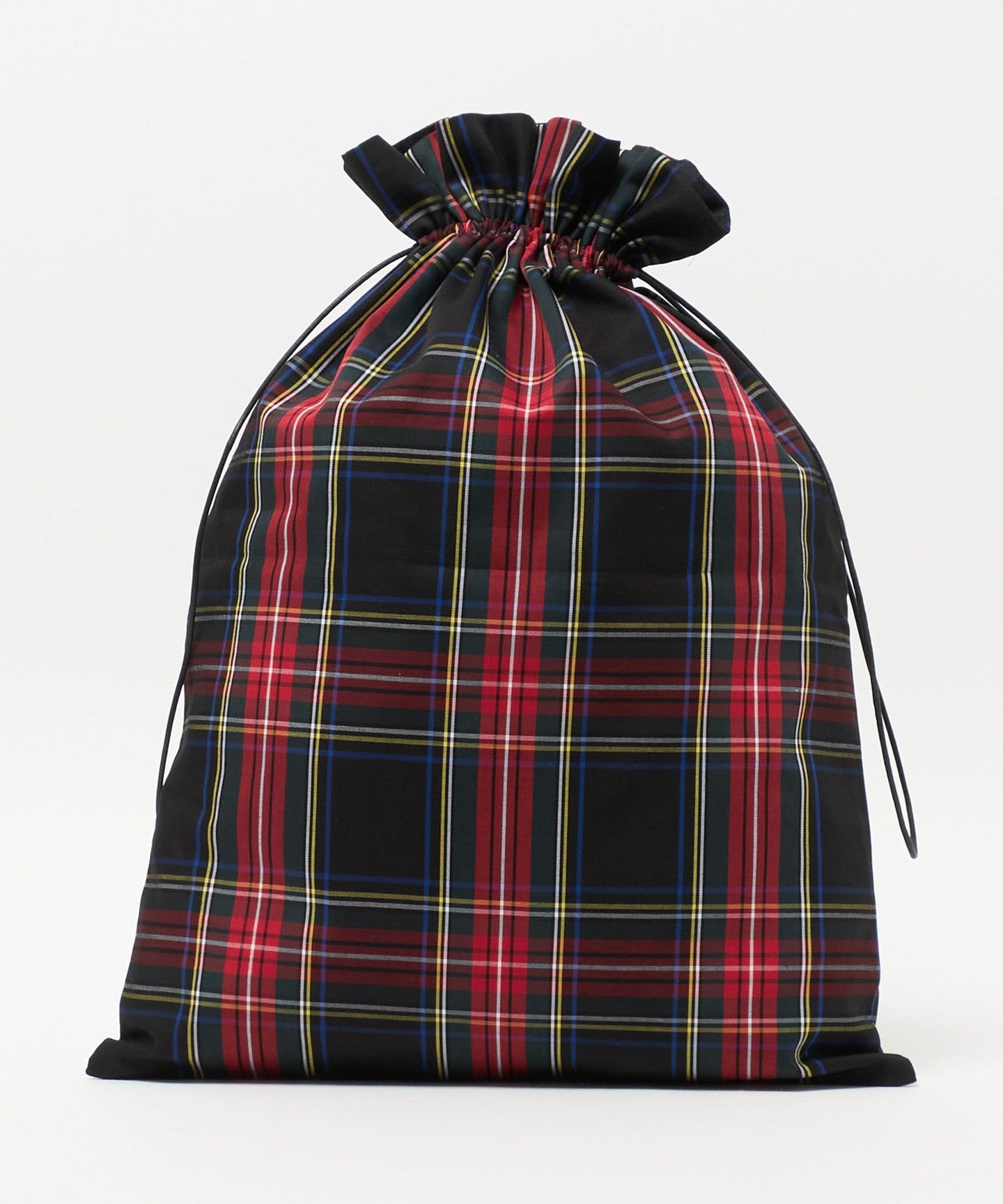 A large drawstring pouch featuring a traditional black Stewart pattern.