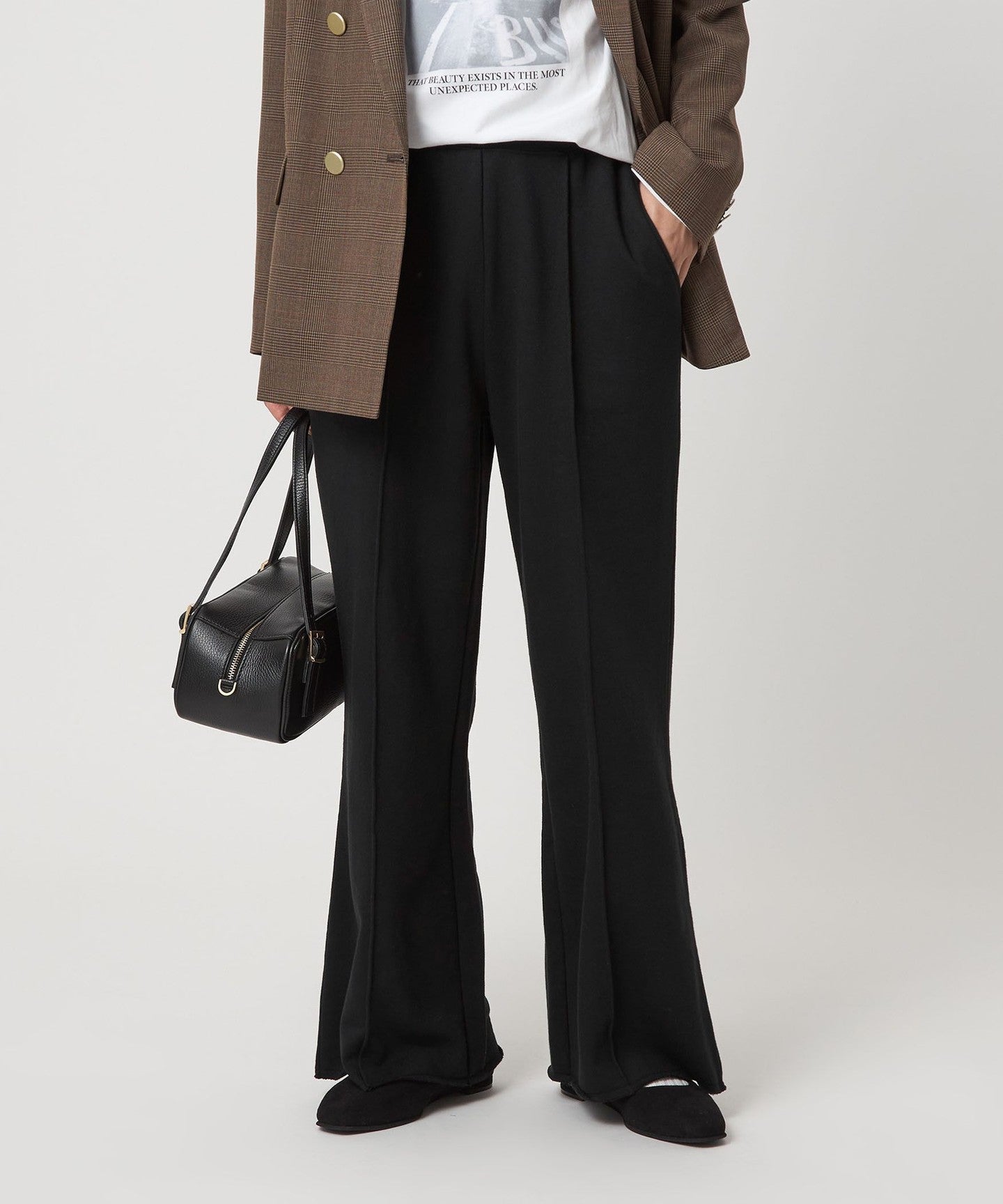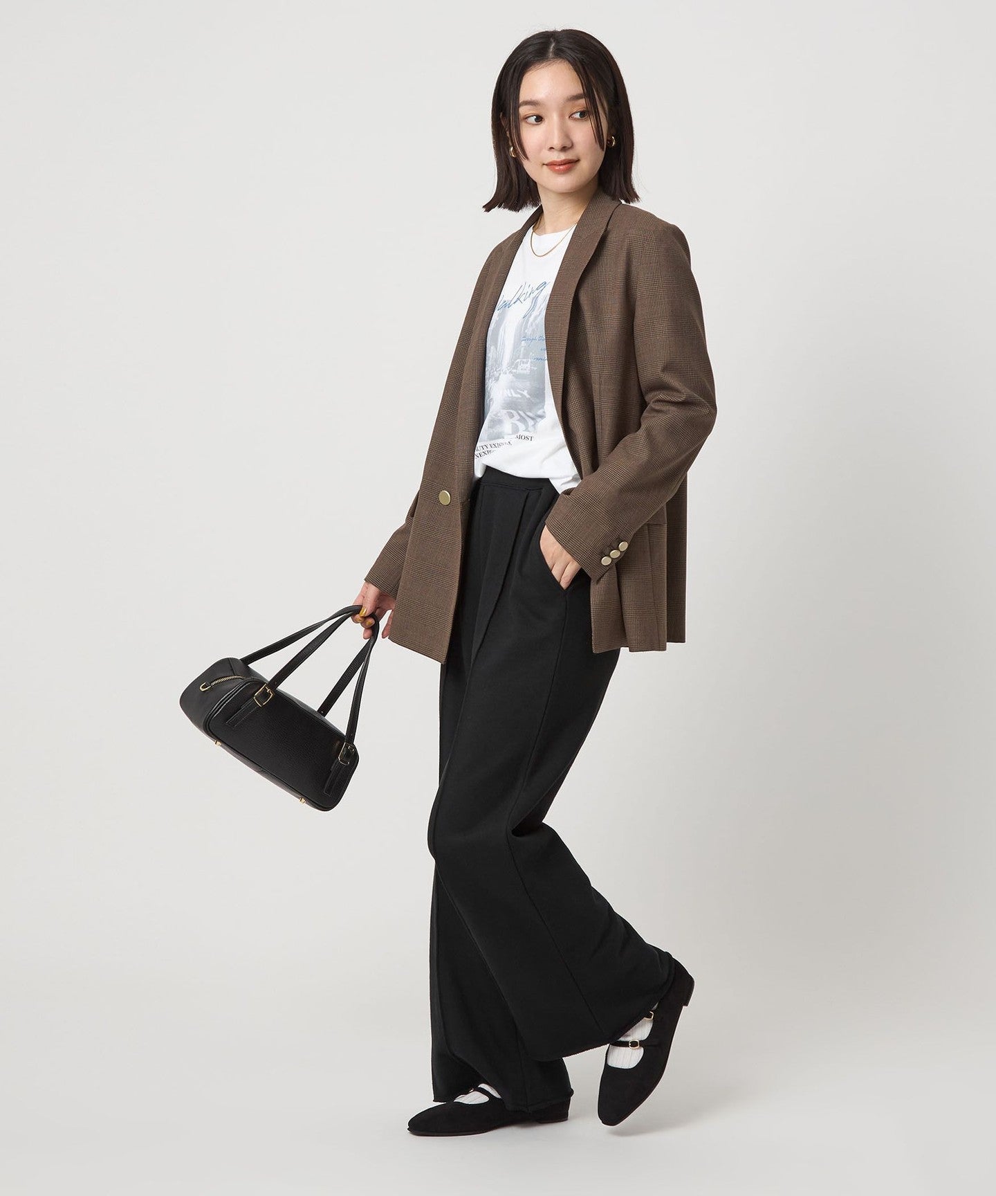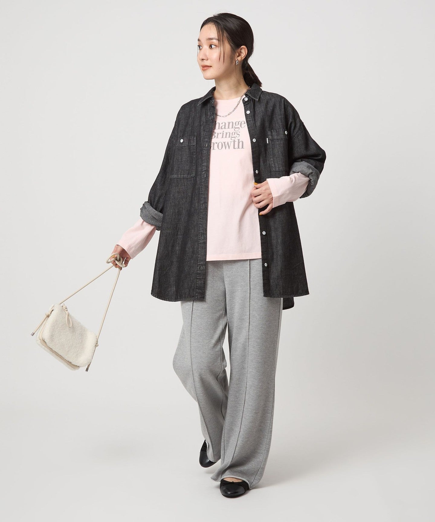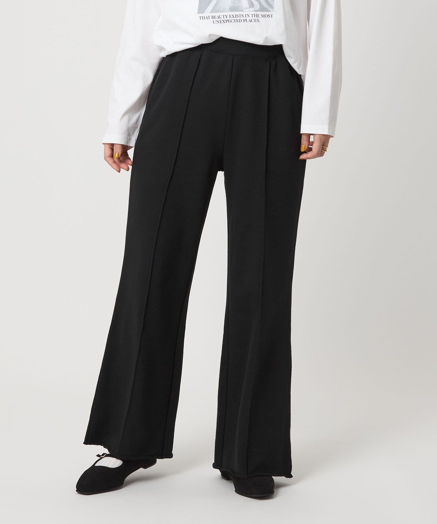 The key point is the wide silhouette that makes it easy to wear and looks stylish.