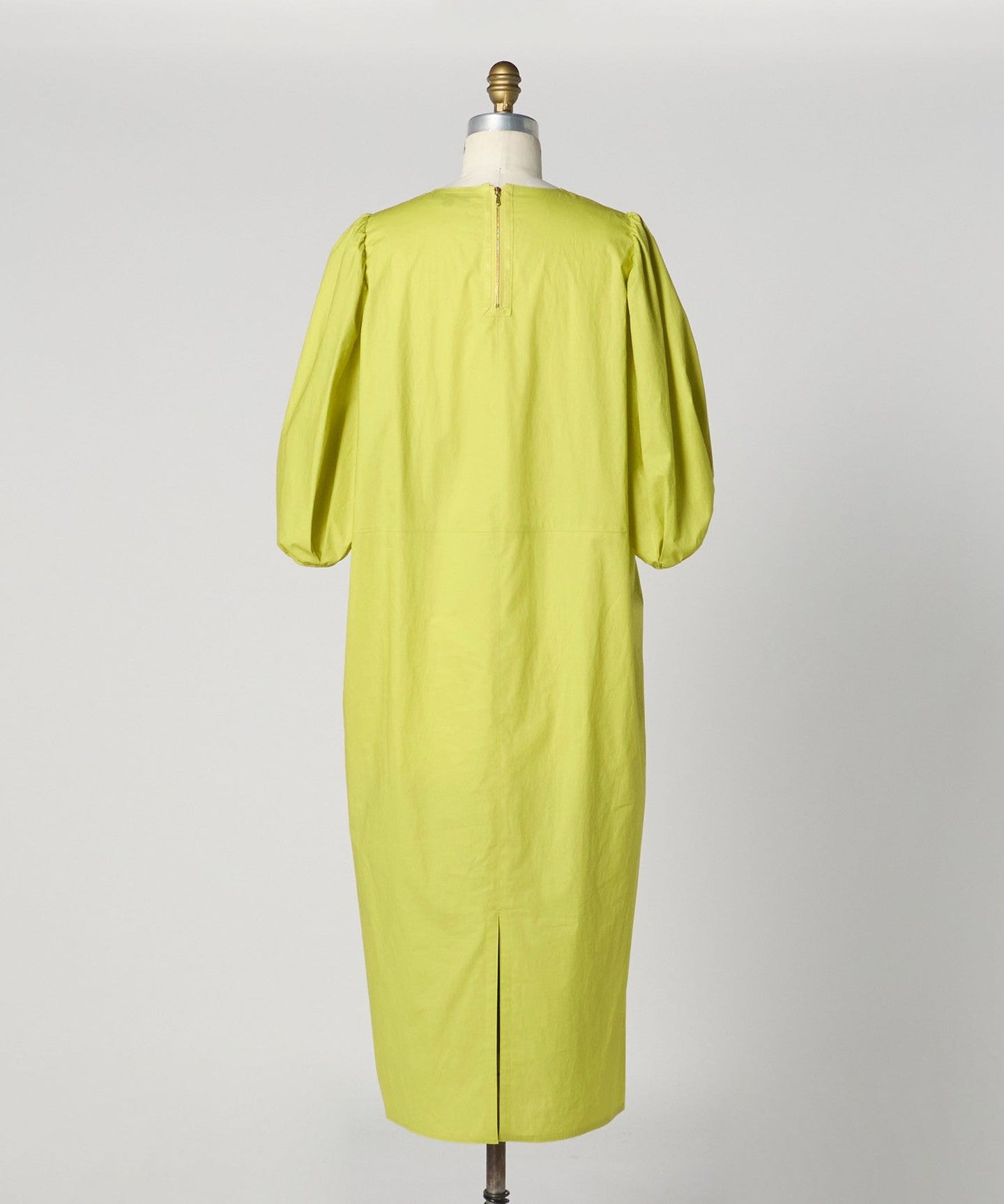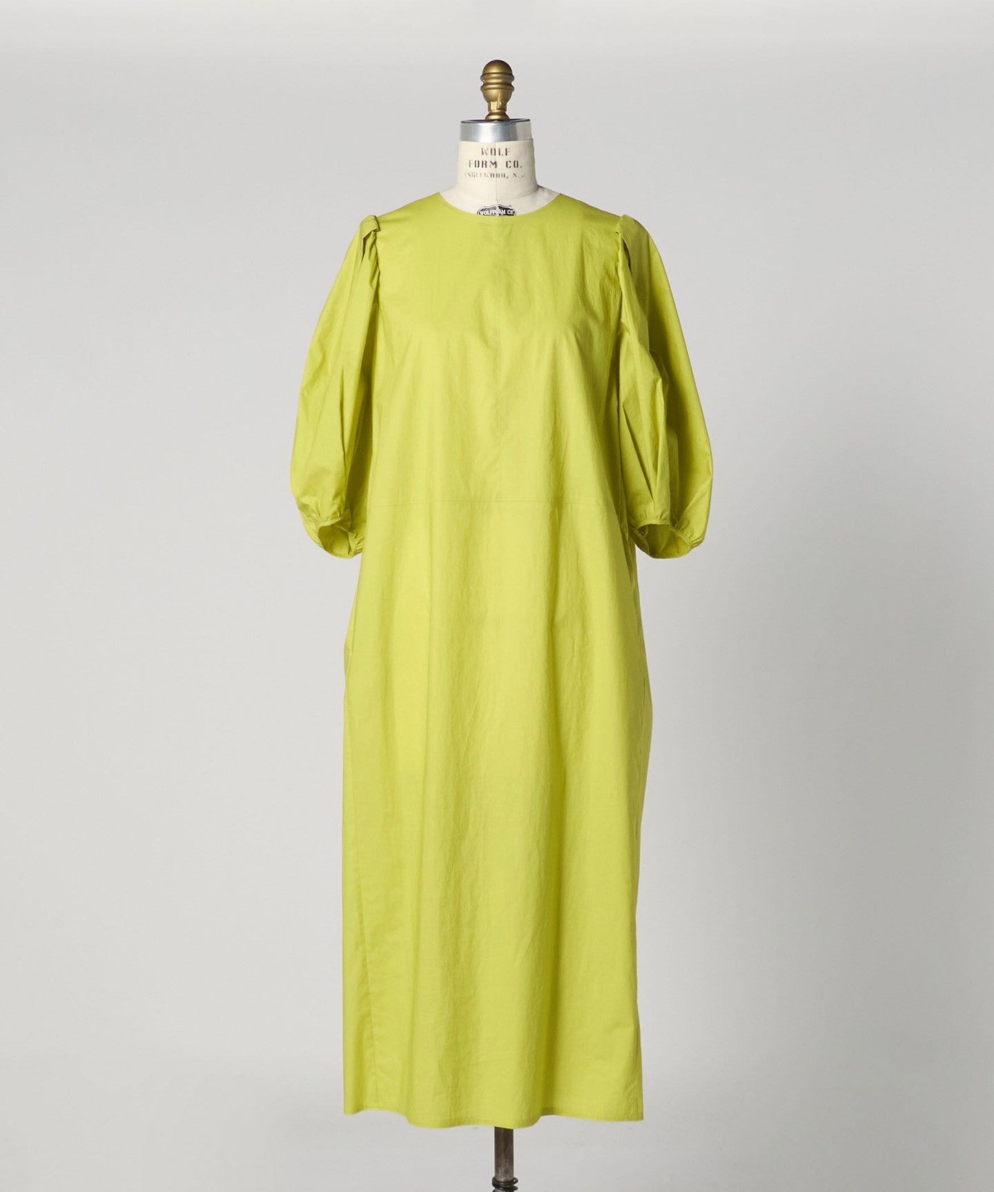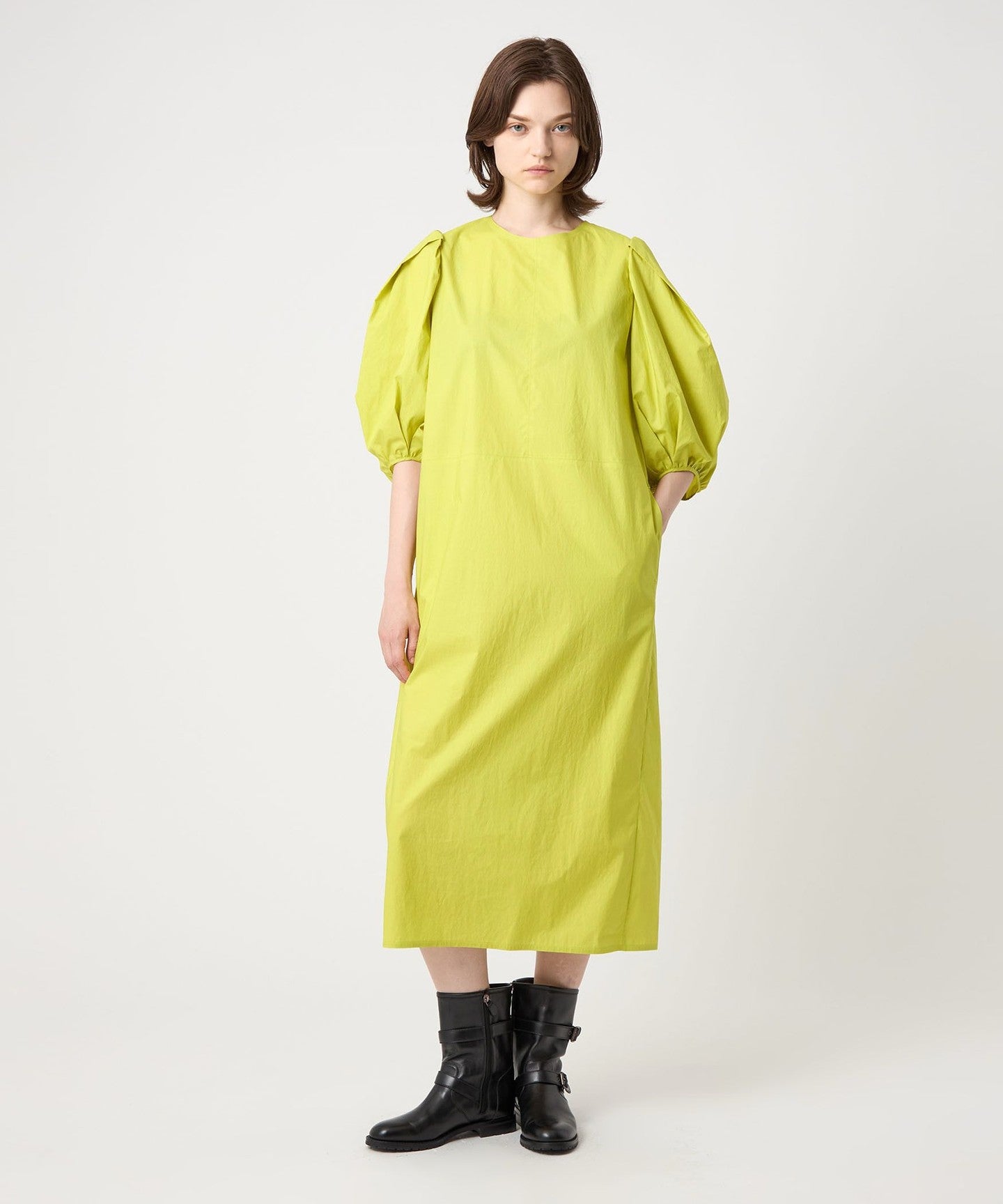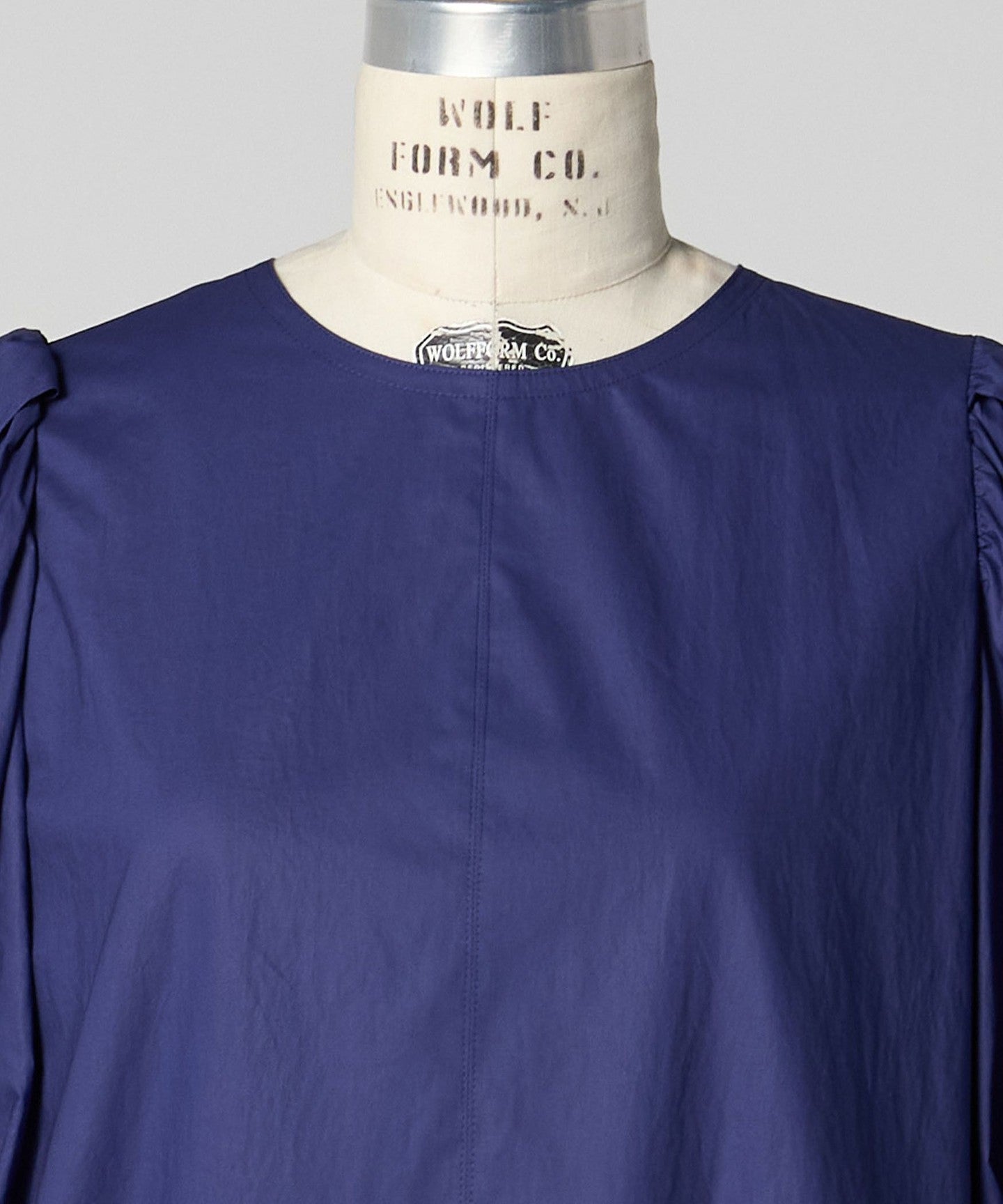 A puff sleeve dress with a draped feel, created with tucks and gathers to create a rounded shape.