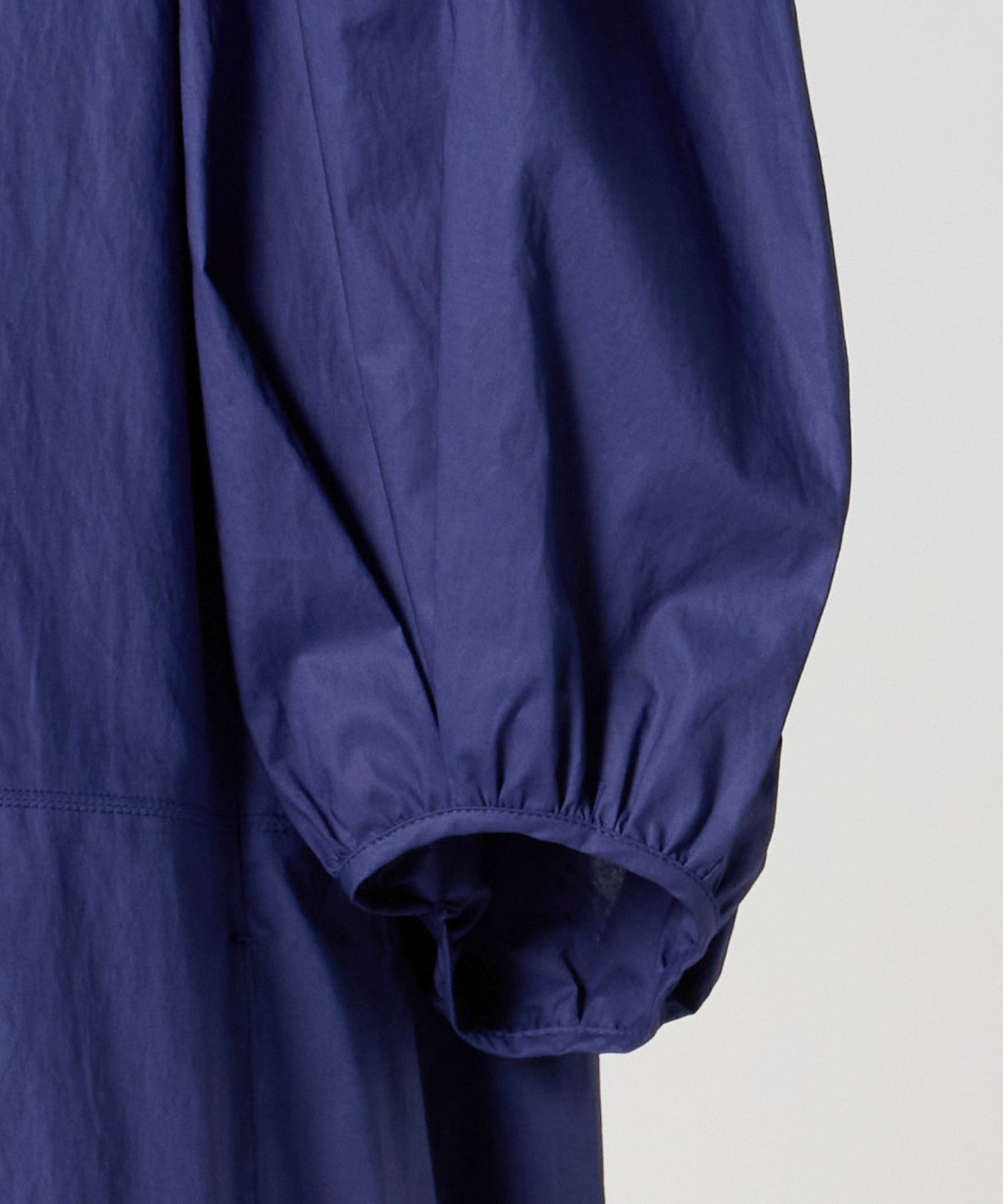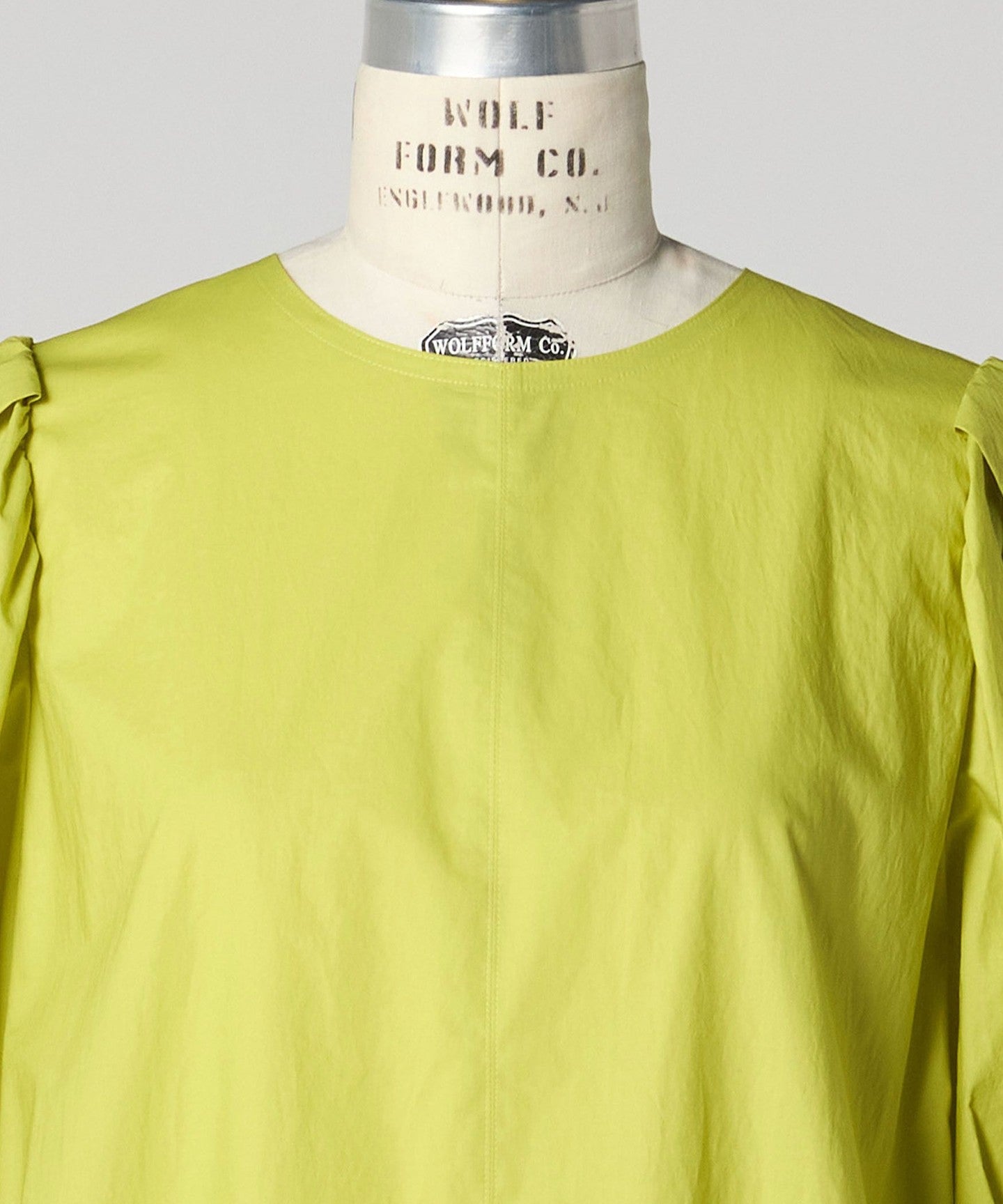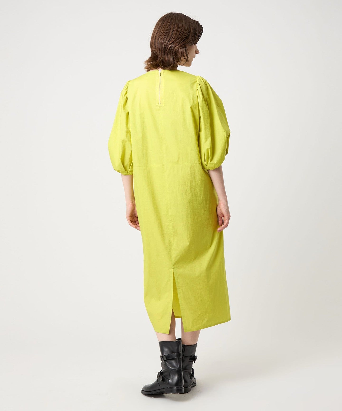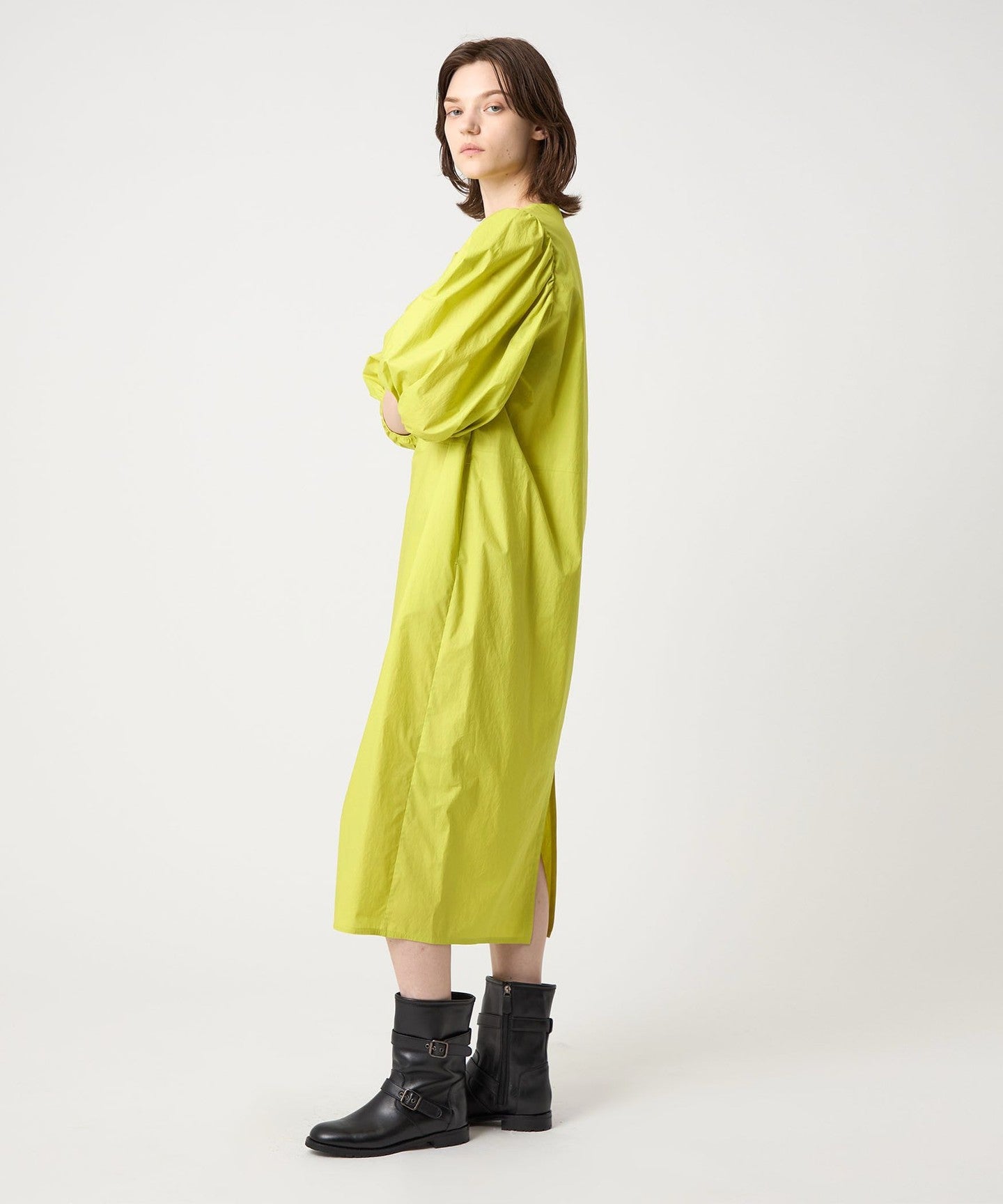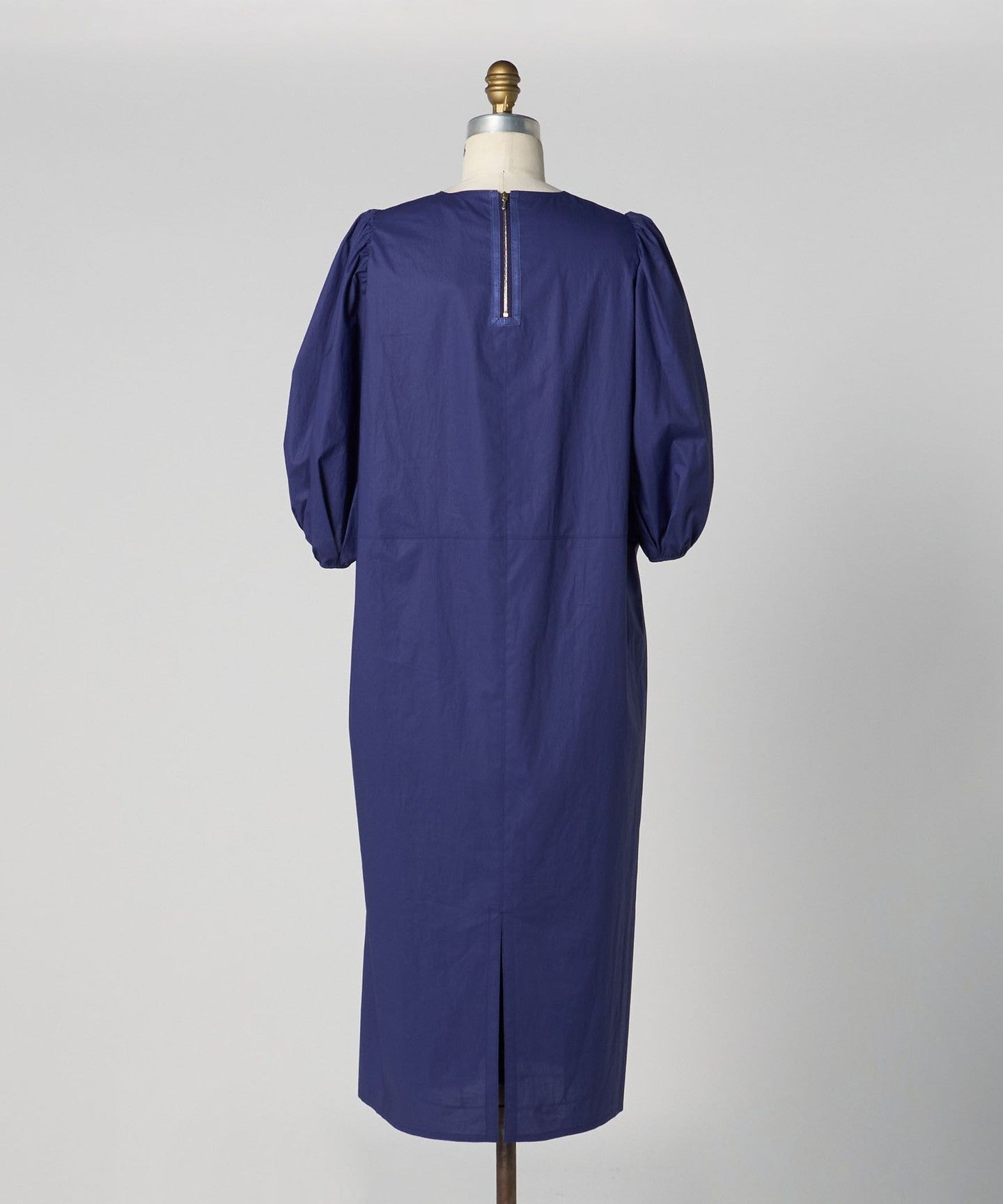 A puff sleeve dress with a draped feel, created with tucks and gathers to create a rounded shape.