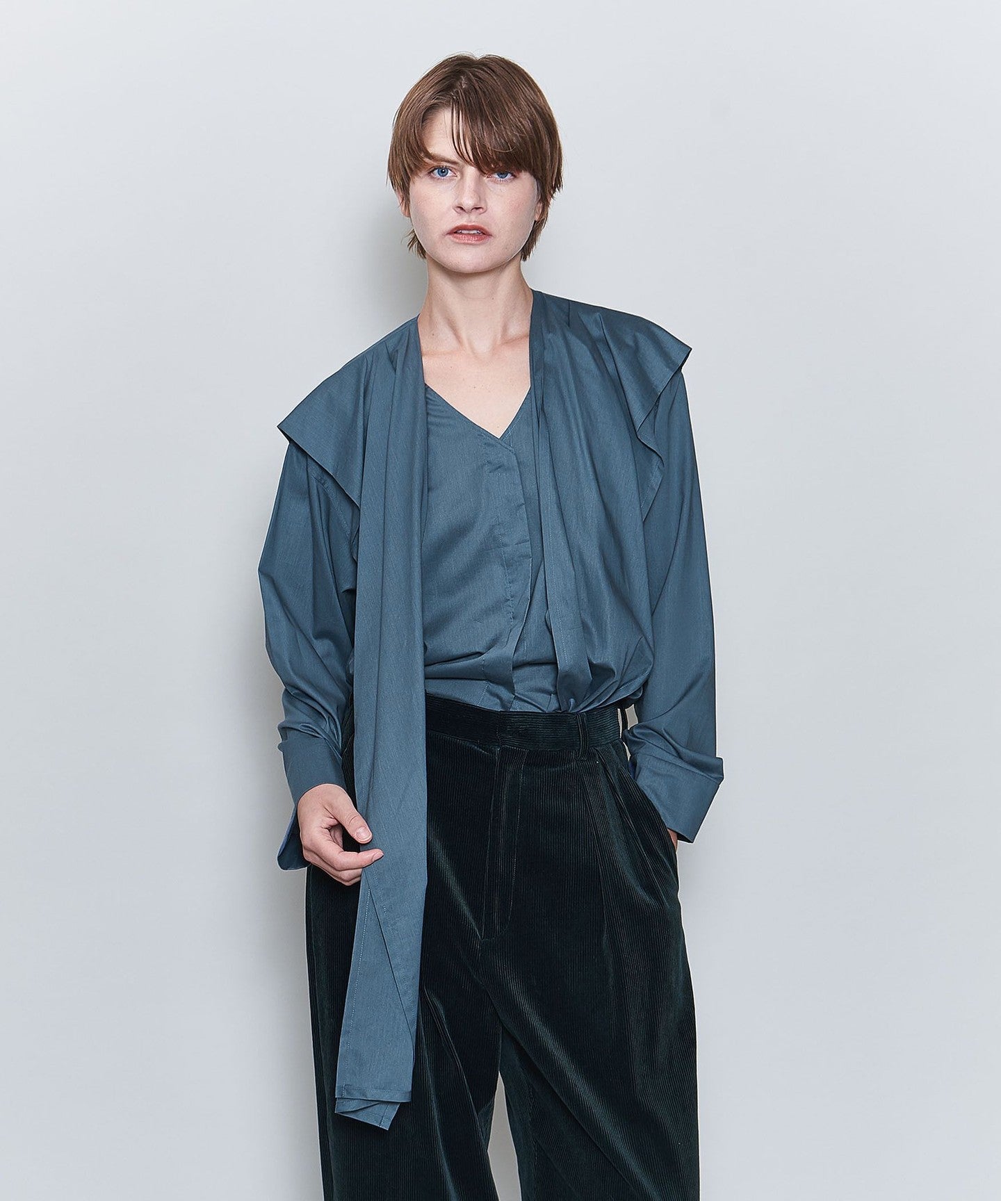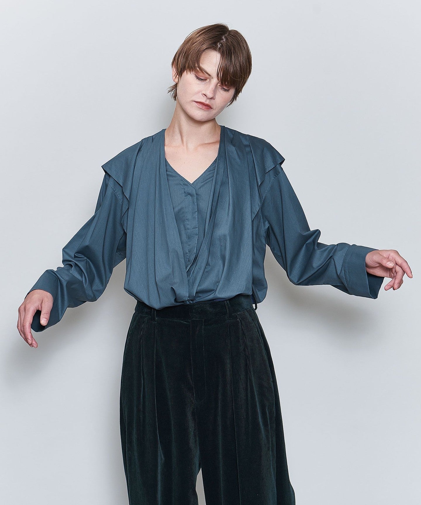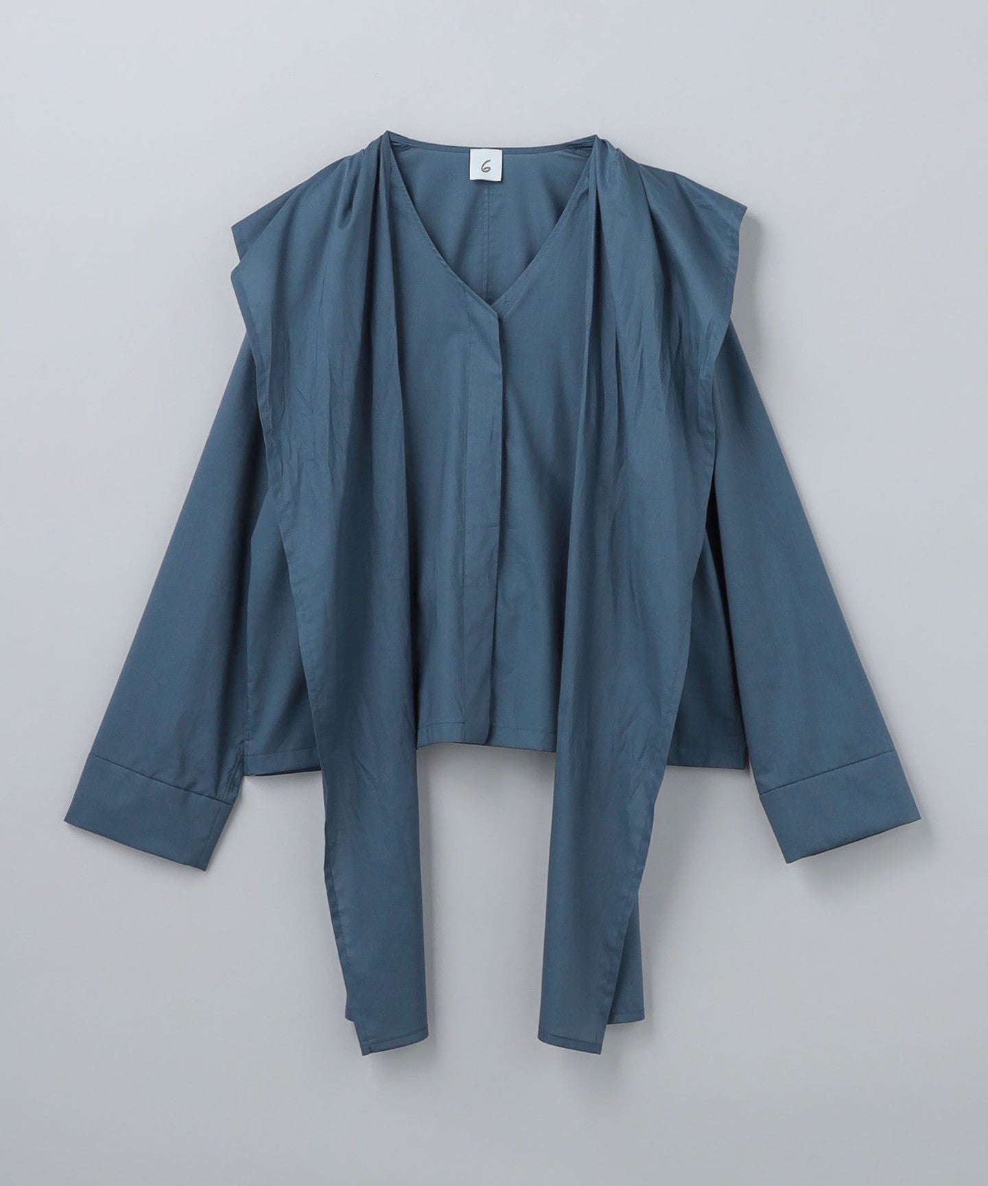 A V-neck shirt made from soft, shiny, and drapey fabric with a stole attached to the shoulders.