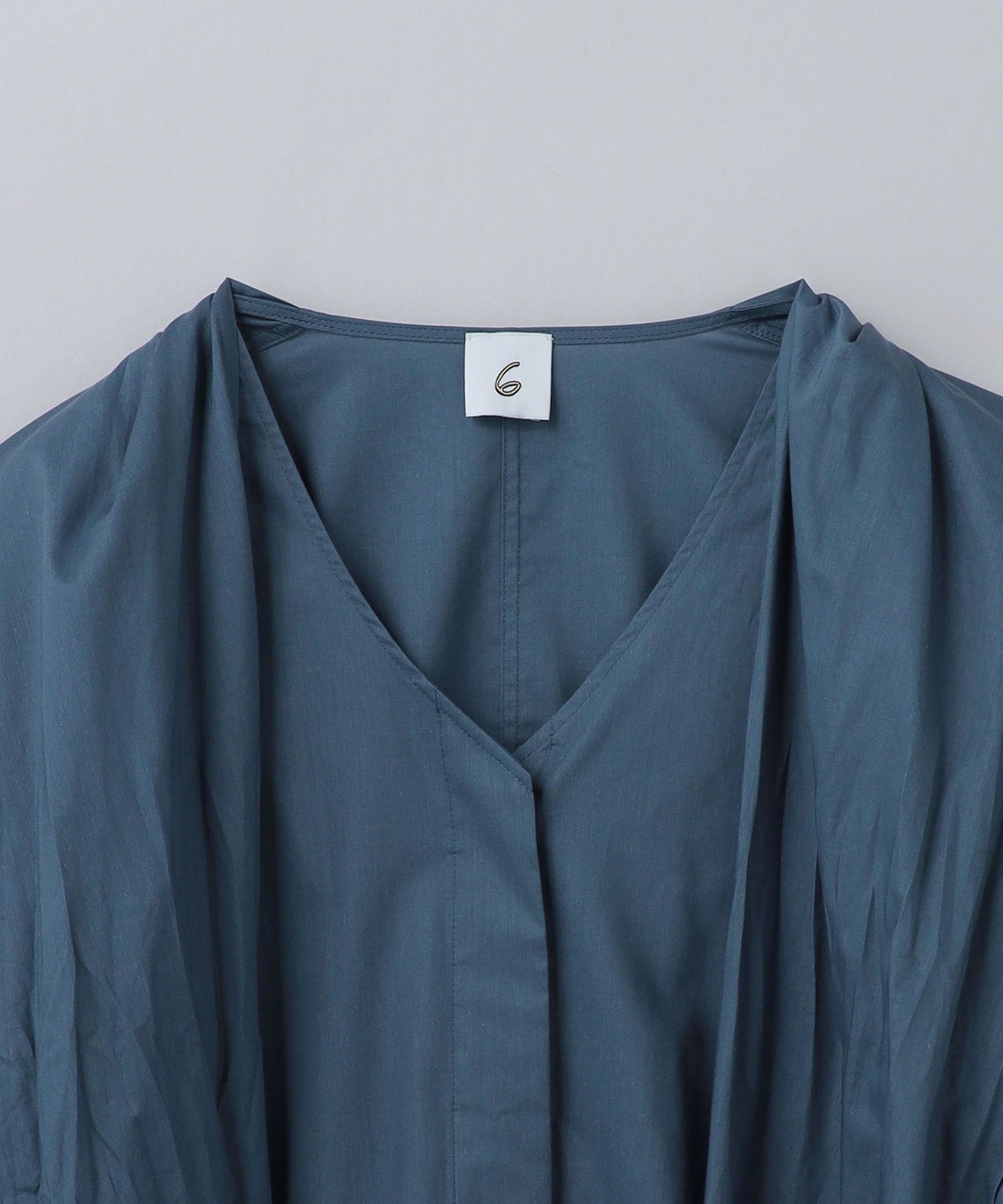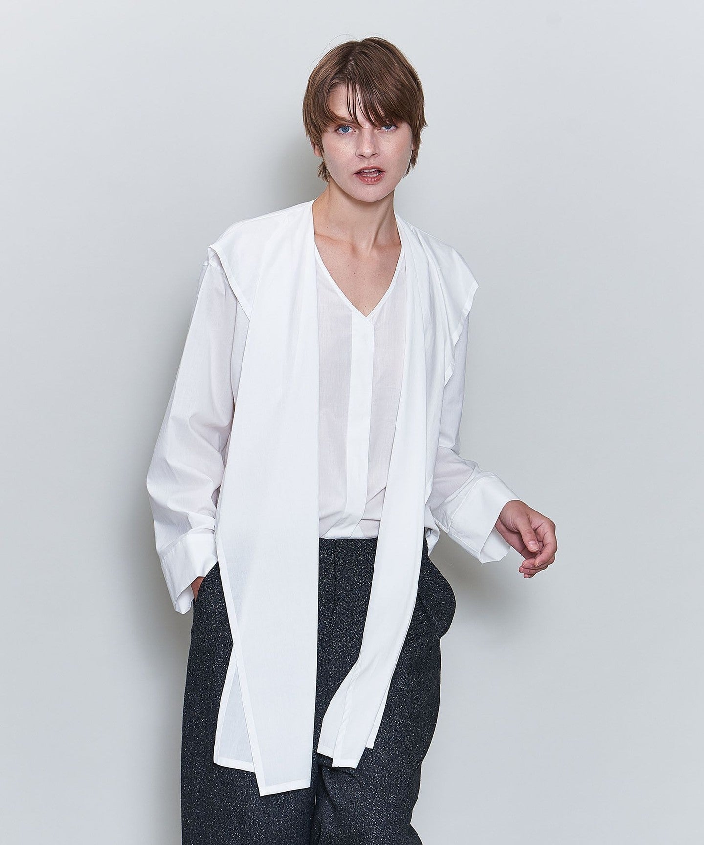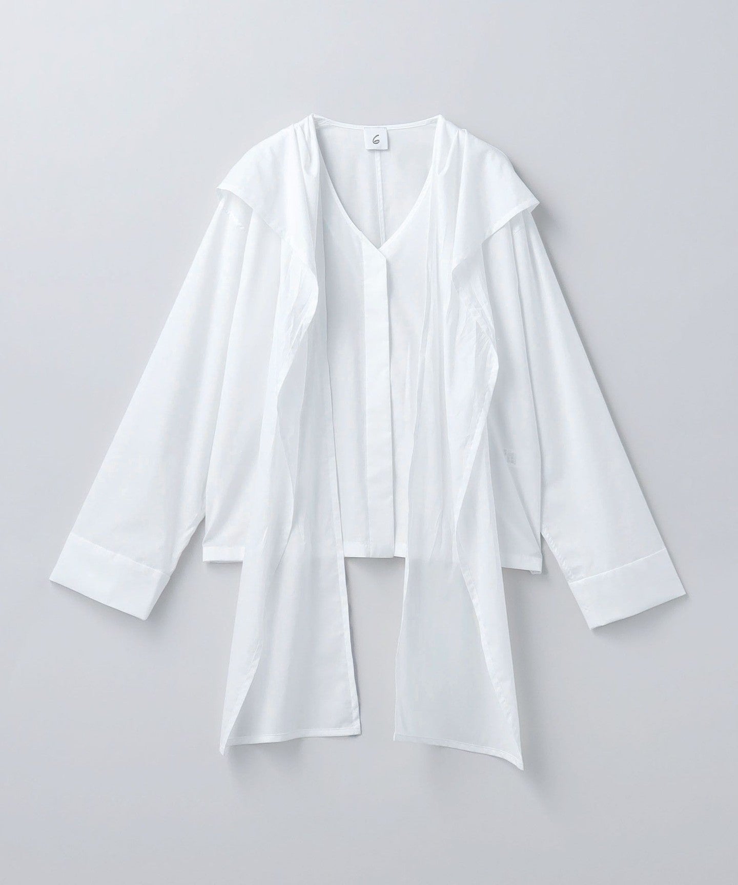 A V-neck shirt made from soft, shiny, and drapey fabric with a stole attached to the shoulders.