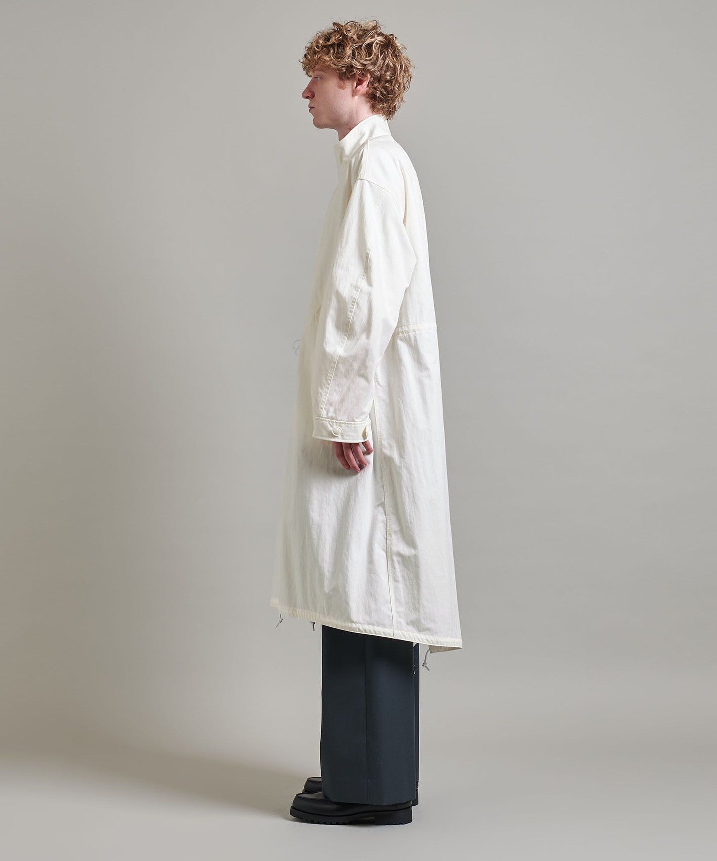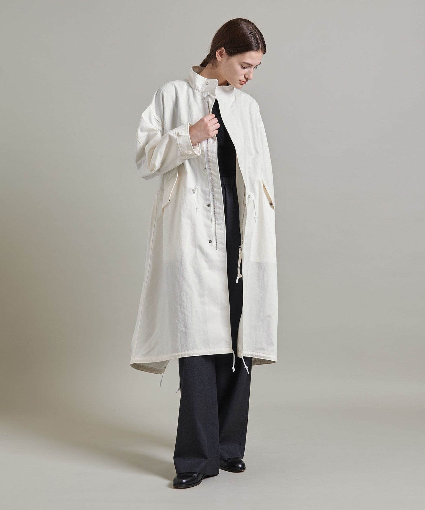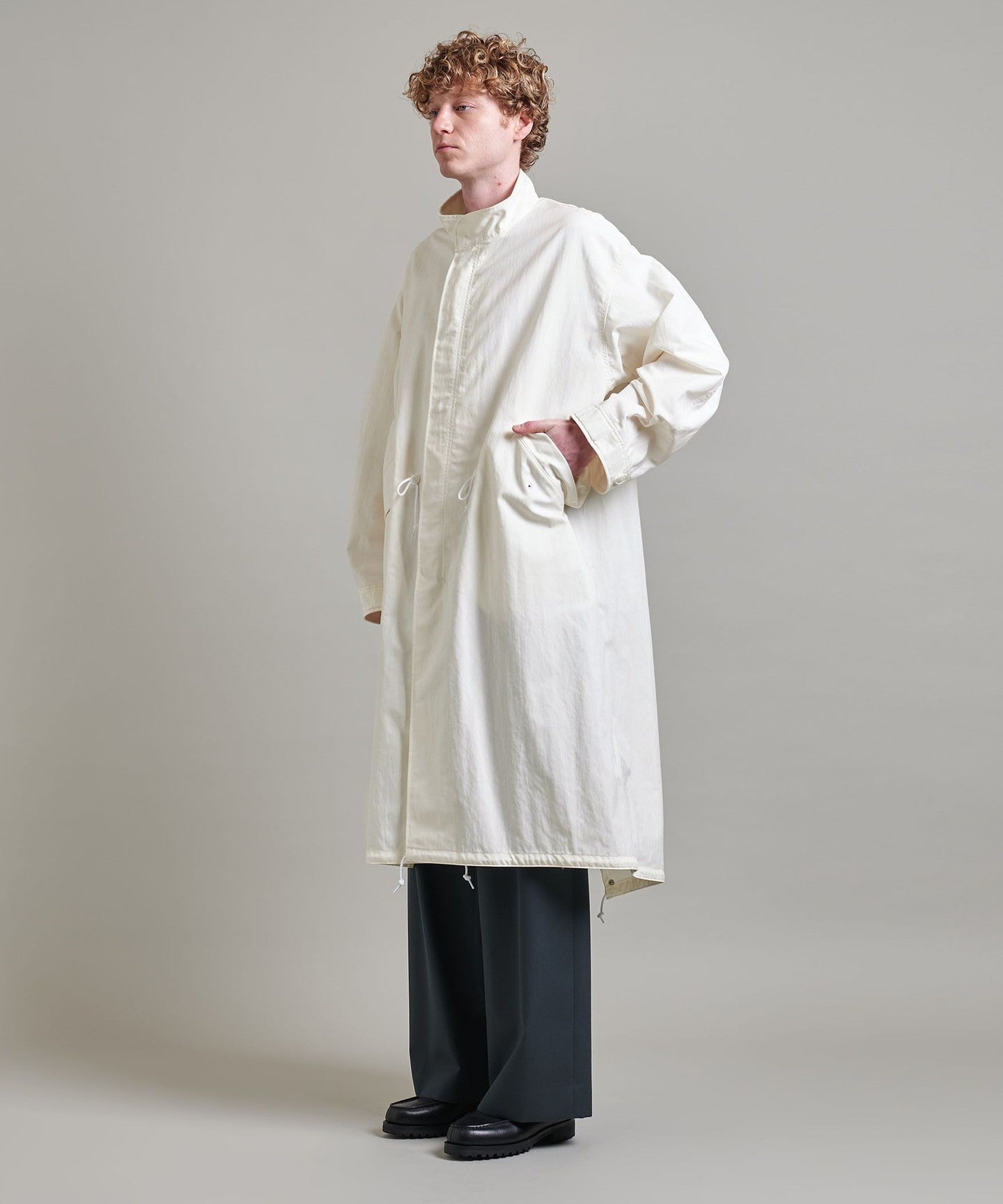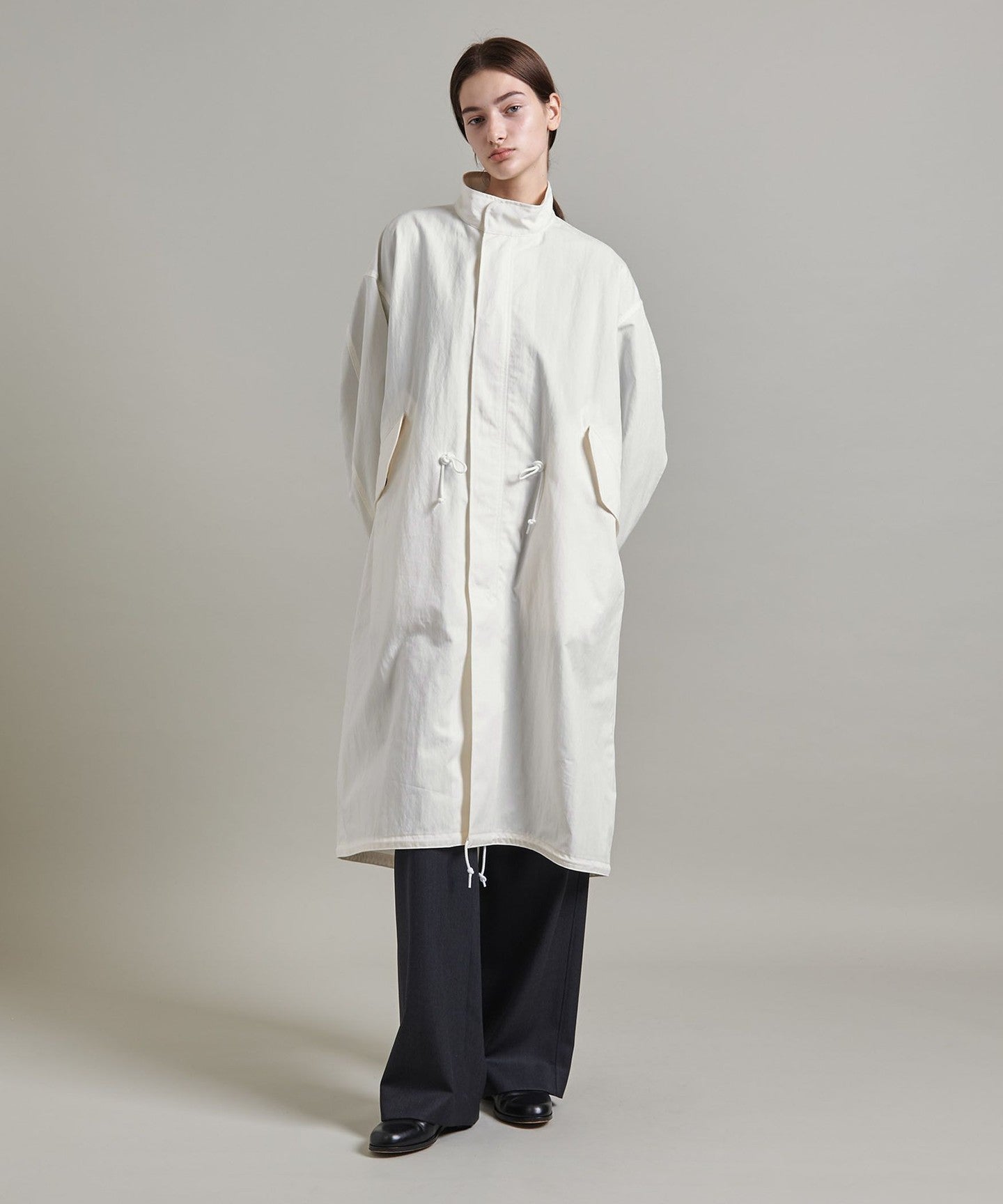 You can enjoy changing the silhouette by tightening the cords at the waist and hem, or adjusting the buttons on the cuffs.