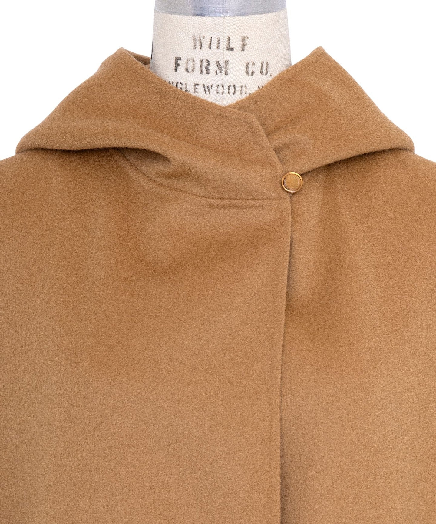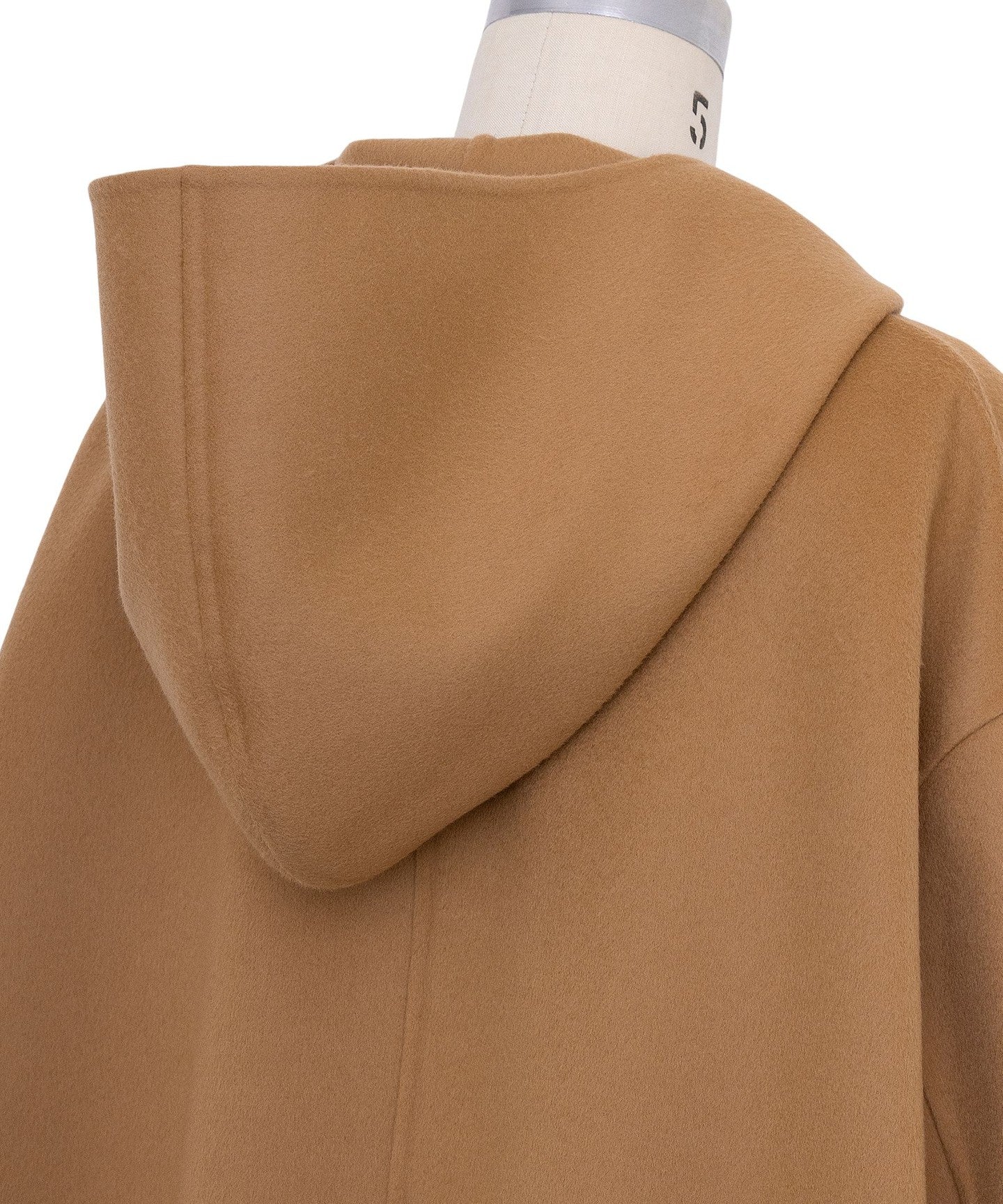 This long coat has a hood that creates a gentle and elegant look when worn open.