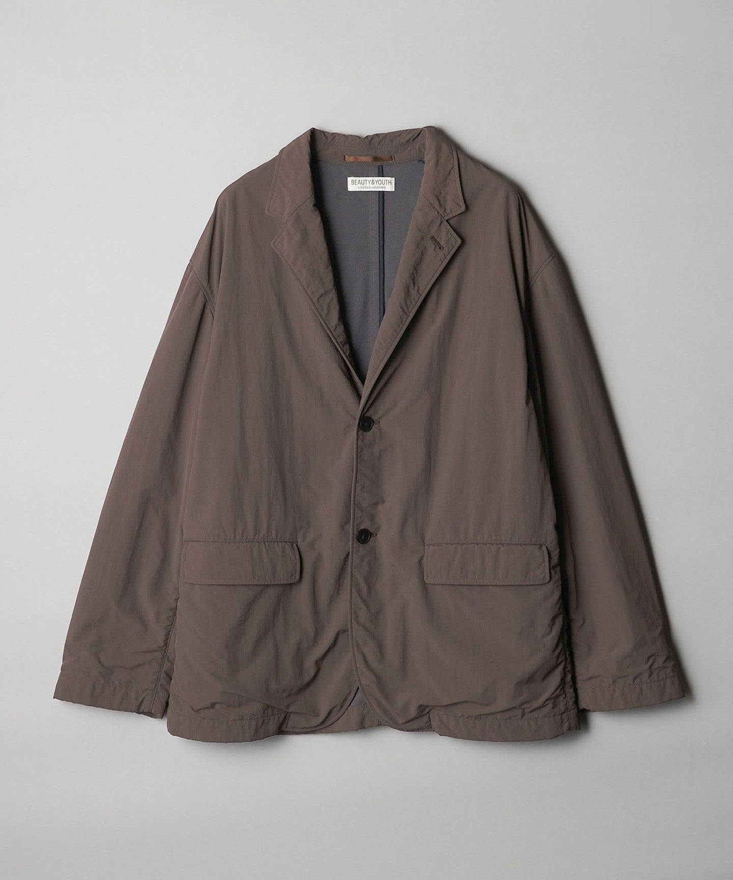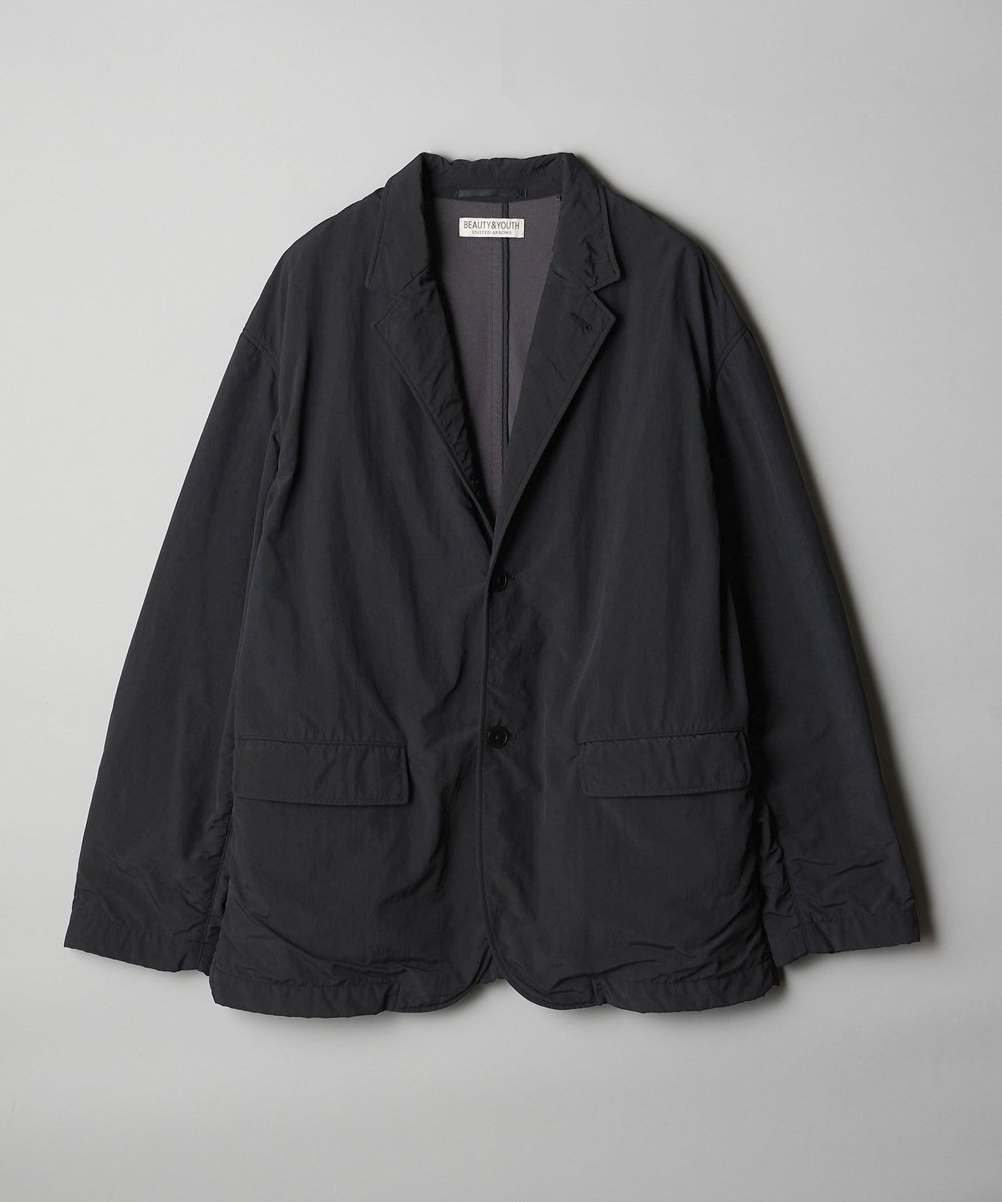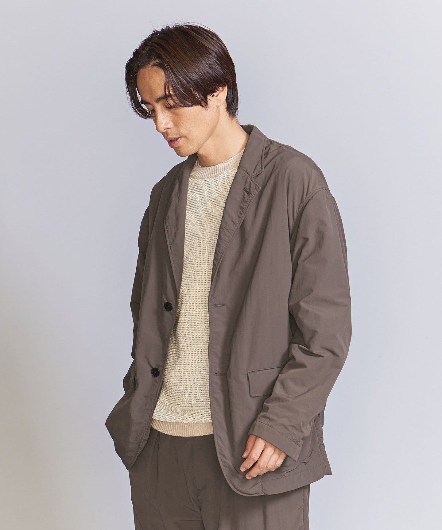 A simple two-button design with a unique puckering (crease) that catches the eye.JACKET .